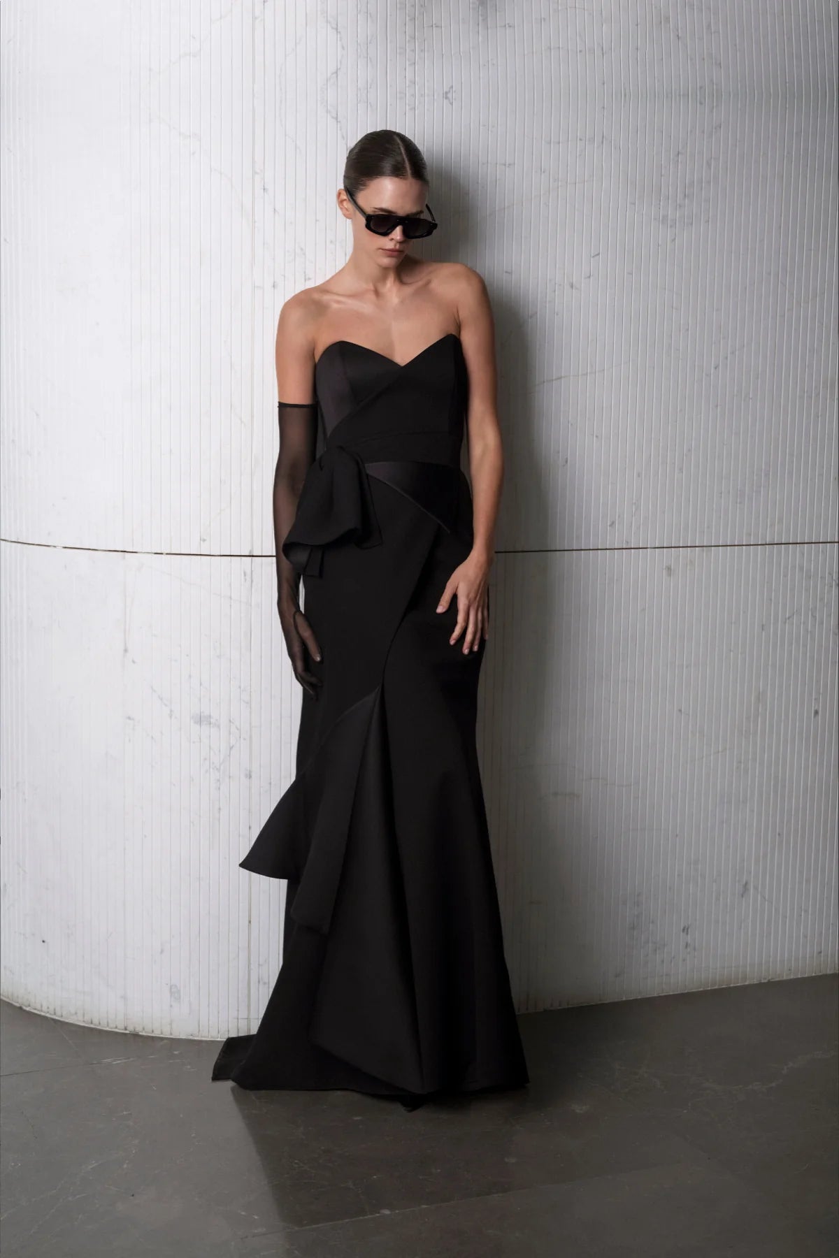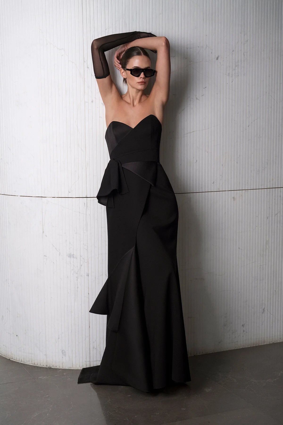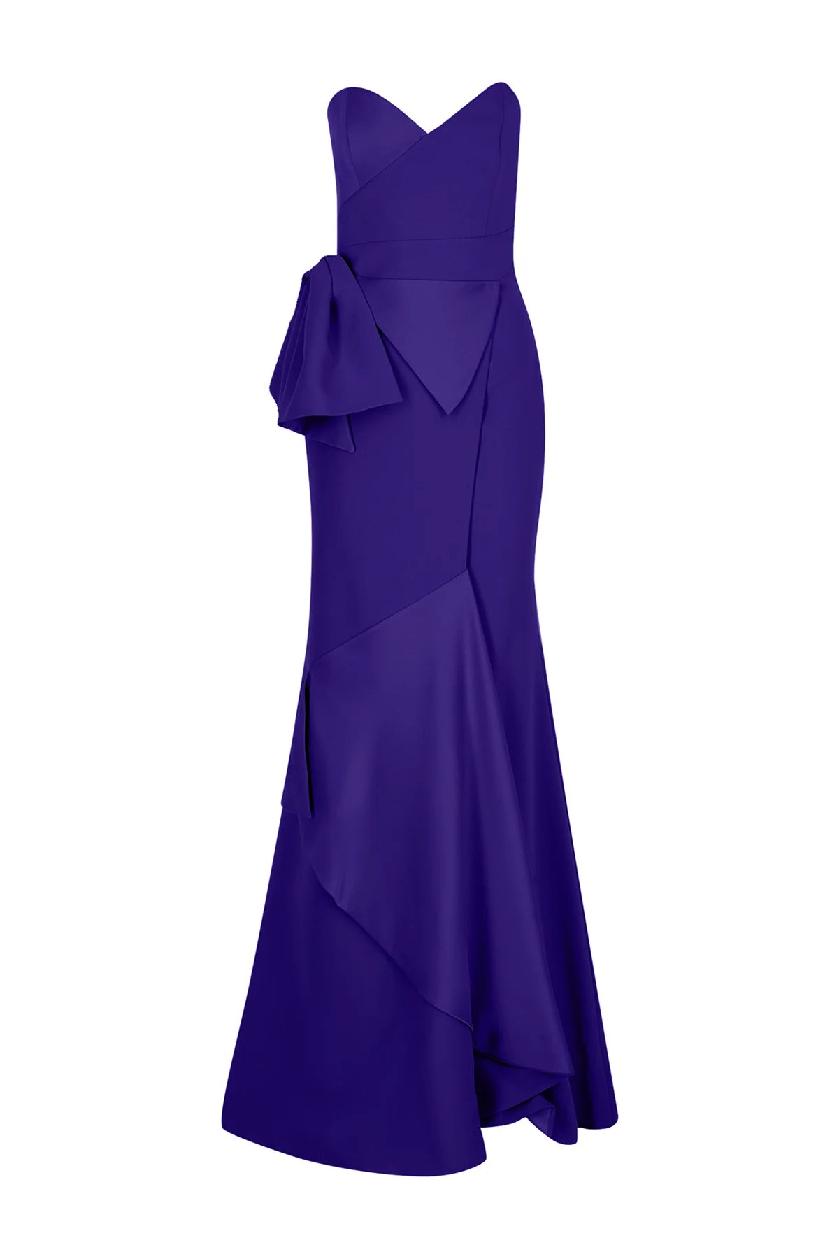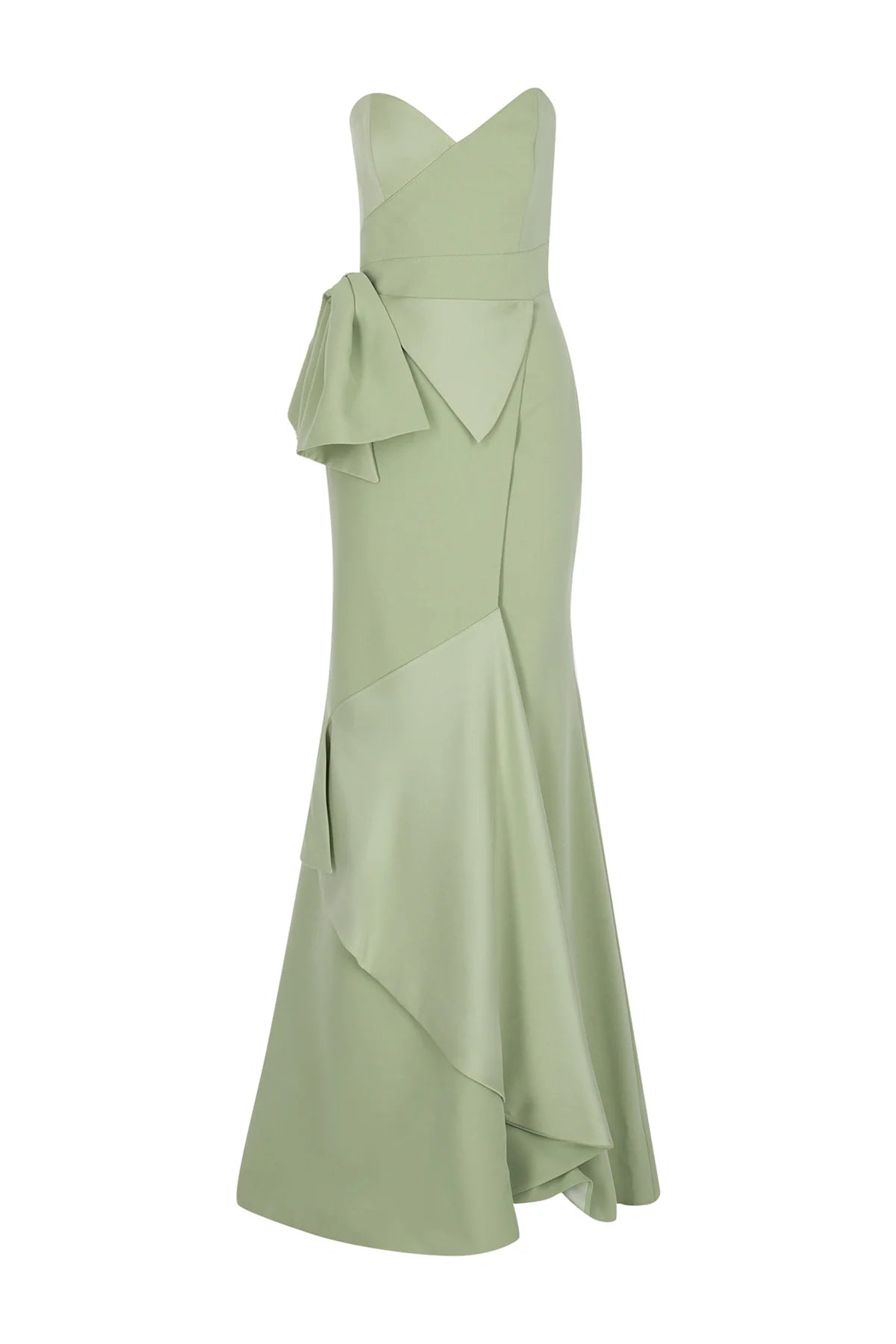 BELİ FİYONKLU STRAPLEZ YIRTMAÇLI ABİYE ELBİSE