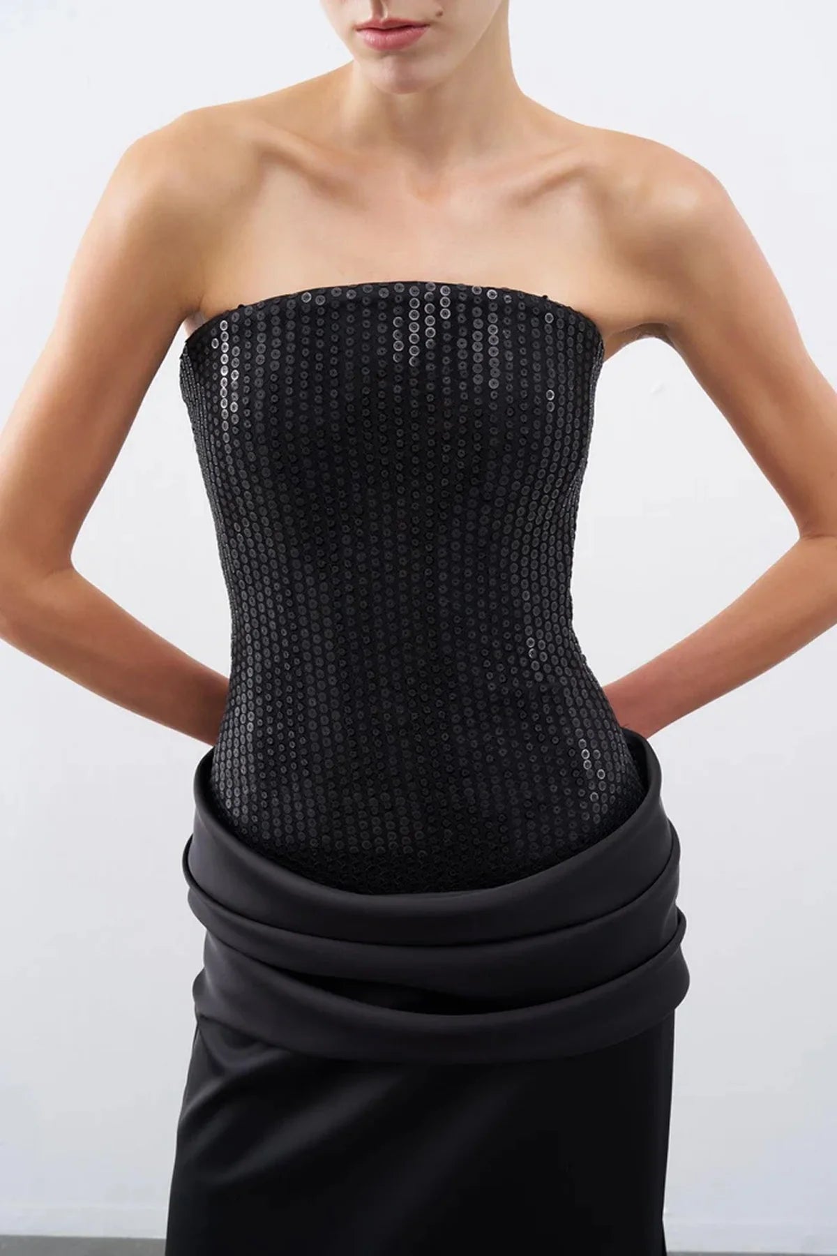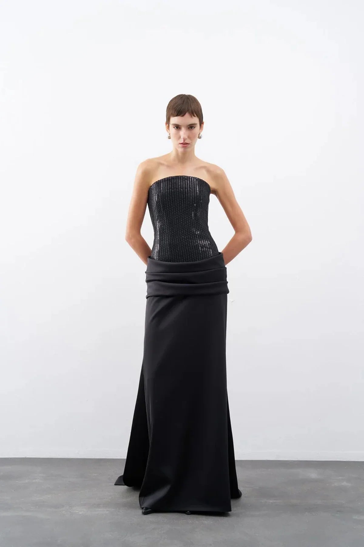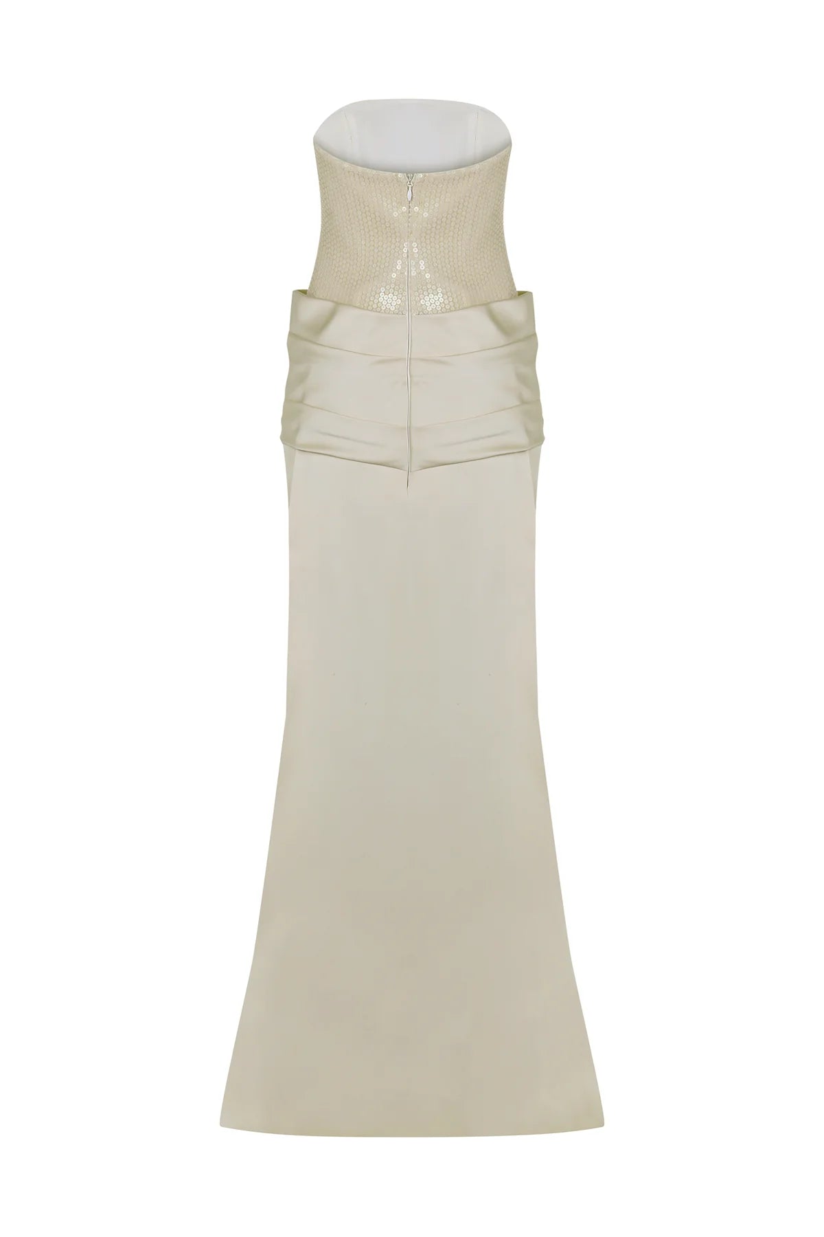 PAYETLİ SATEN STRAPLEZ UZUN ABİYE ELBİSE 2267