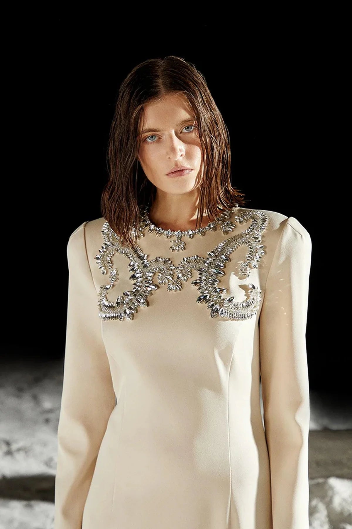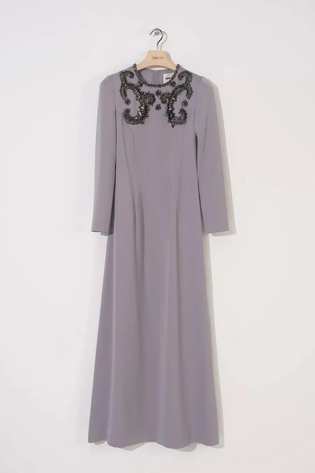 - Özel tasarım kasnaklı el işçiliği detaylı, bisiklet yakalı, uzun kollu, vatkalı, arka ortası gizli fermuarlı, astarlı, saten kumaş uzun elbise.