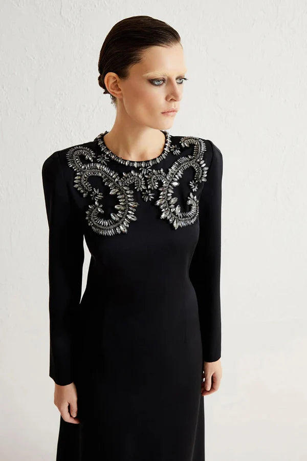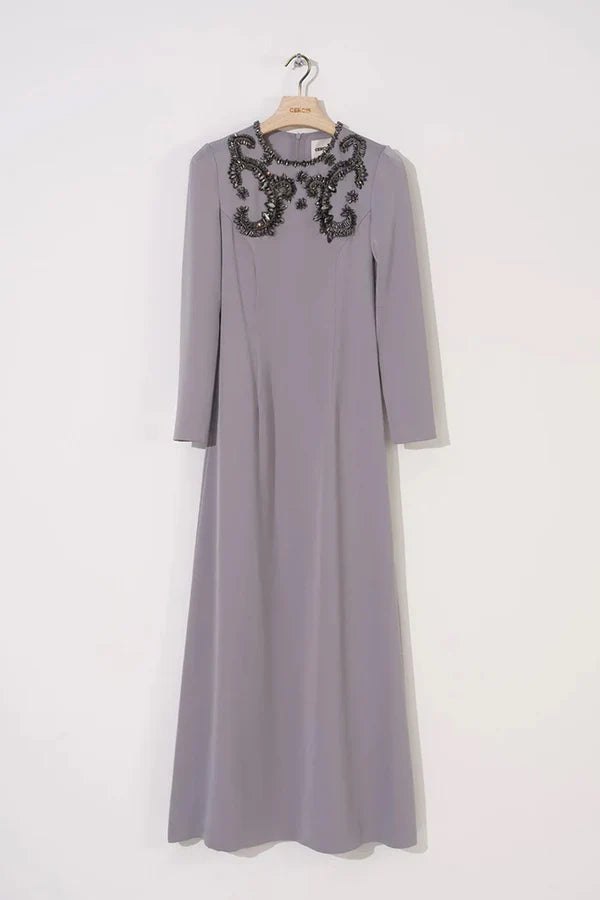 SATEN KASNAK İŞLEME UZUN ELBİSE