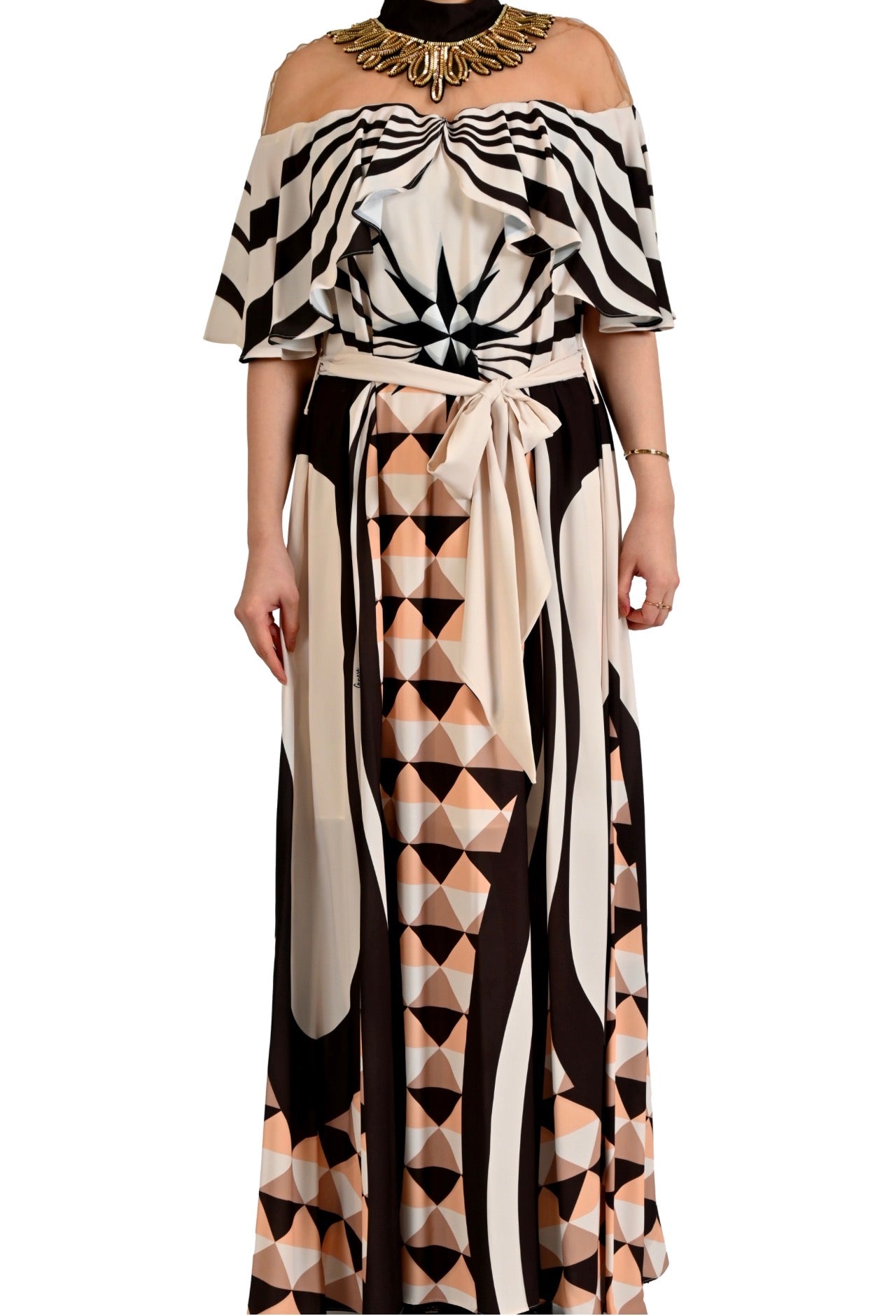 ANTİK ALTIN YAKA DETAYLI GEOMETRİK DESENLİ ABİYE ELBİSE