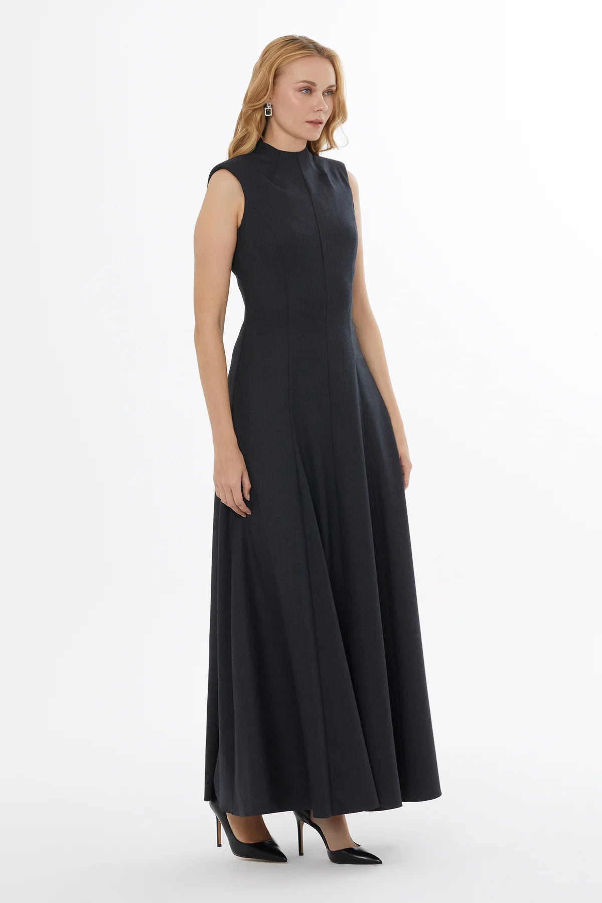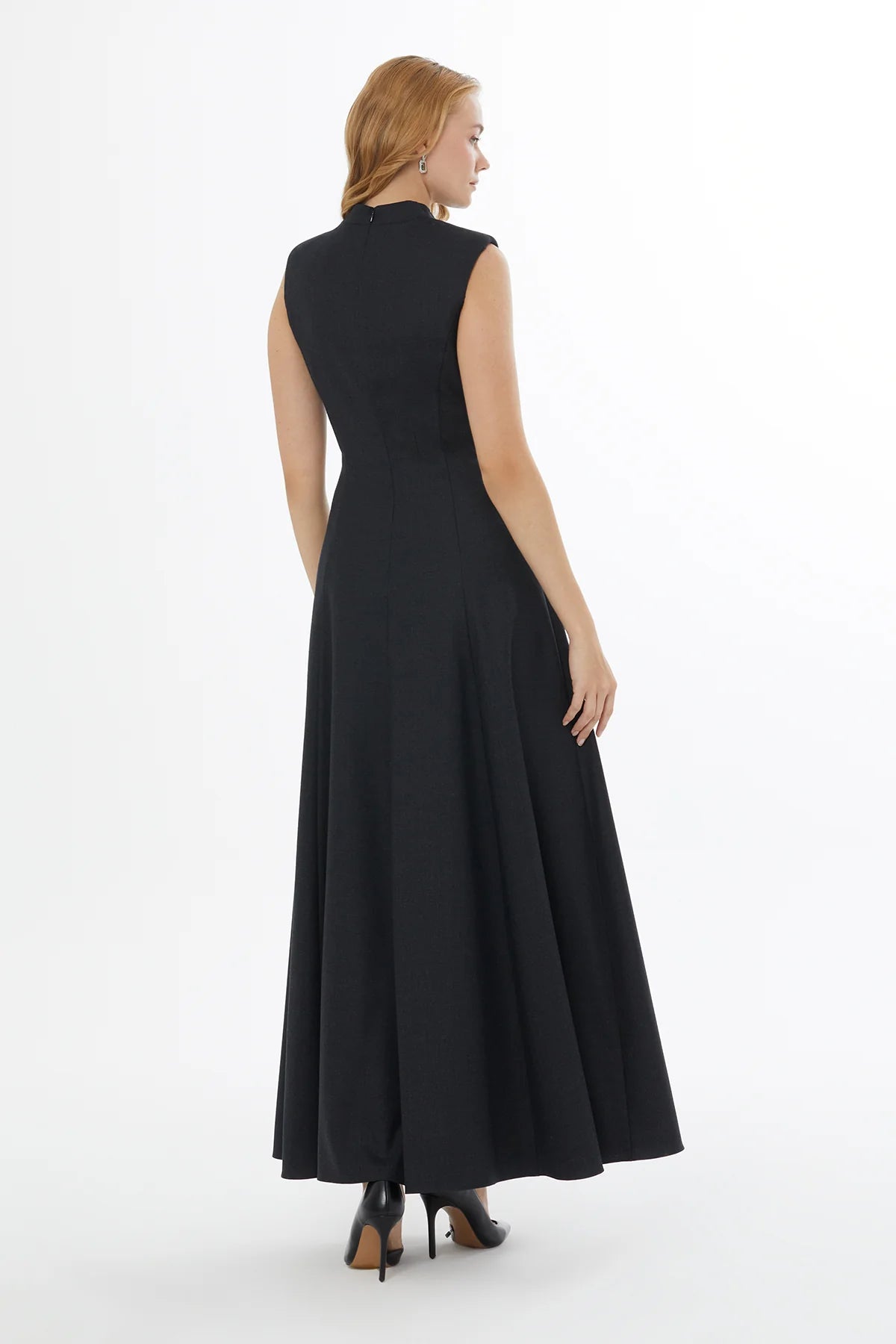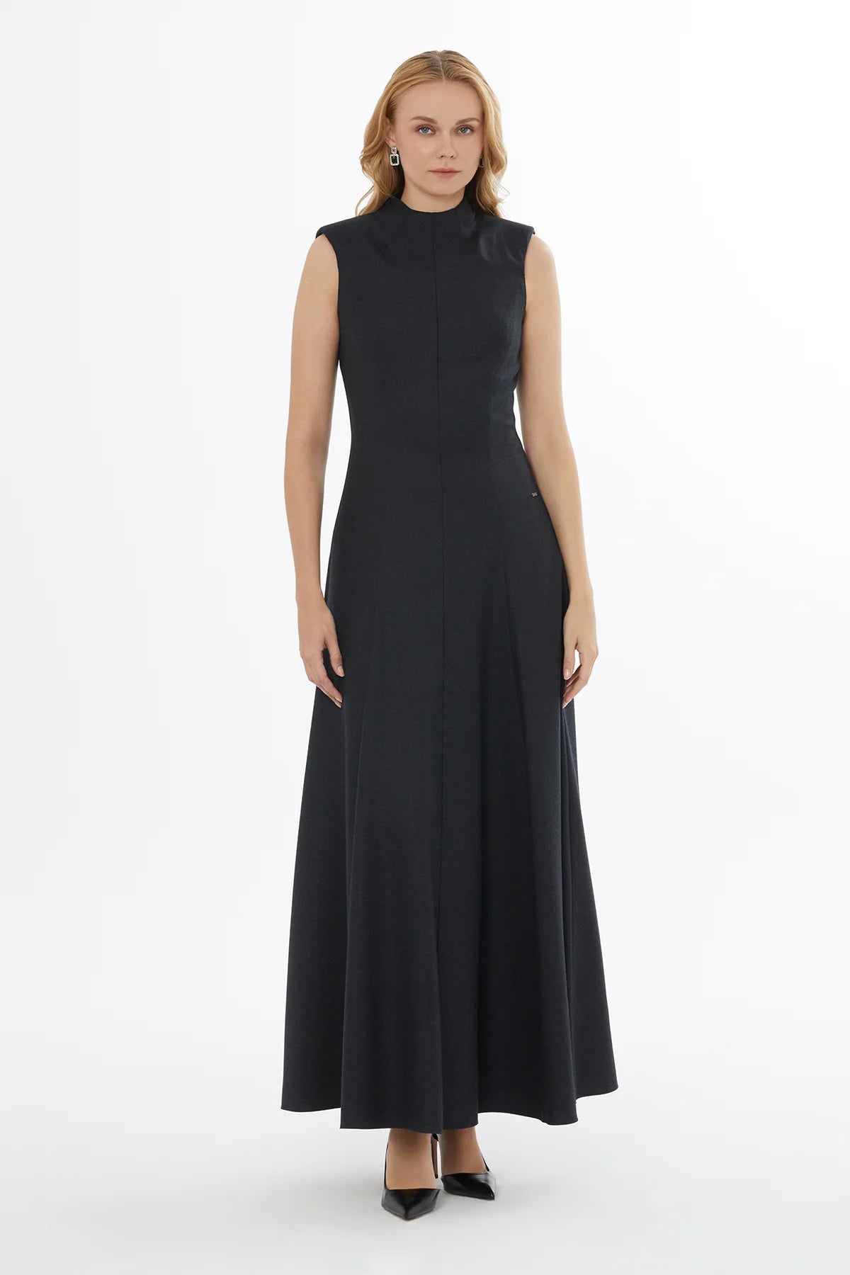 Bisiklet Yaka Arkası Gizli Fermuarlı Uzun Elbise