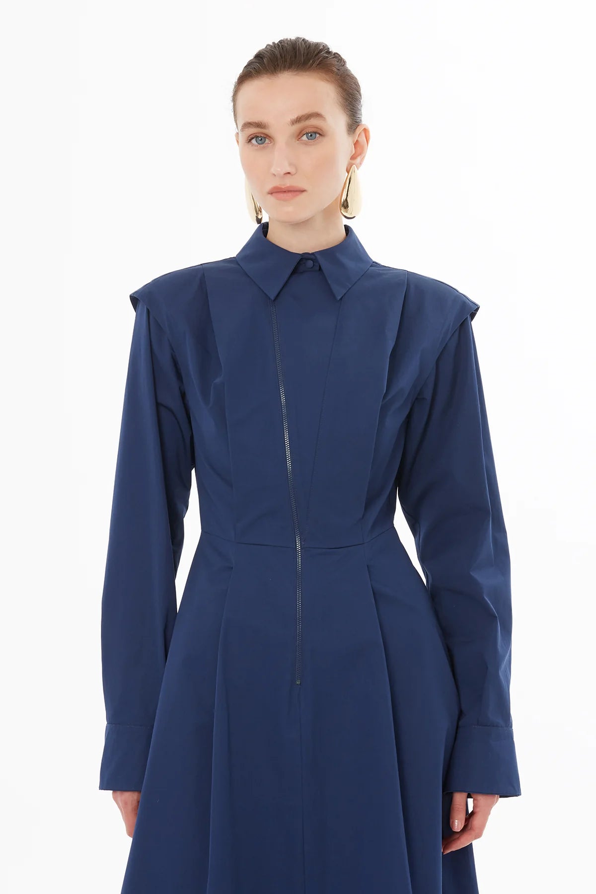 Gömlek Yaka Asimetrik Fermuar Kapamalı Pileli Midi Elbise