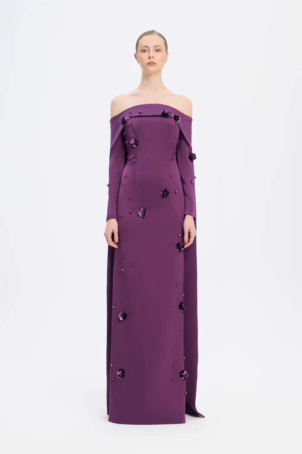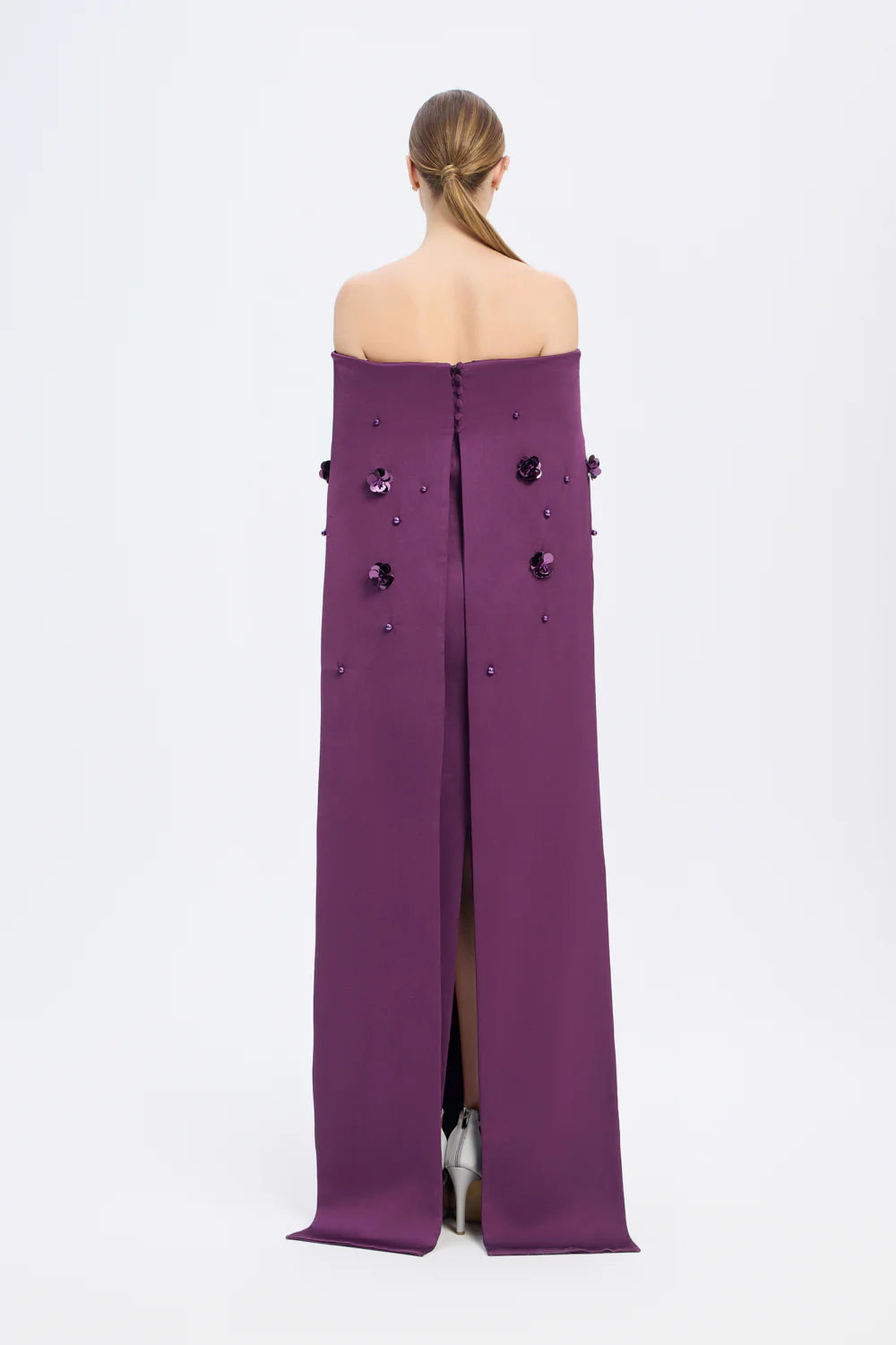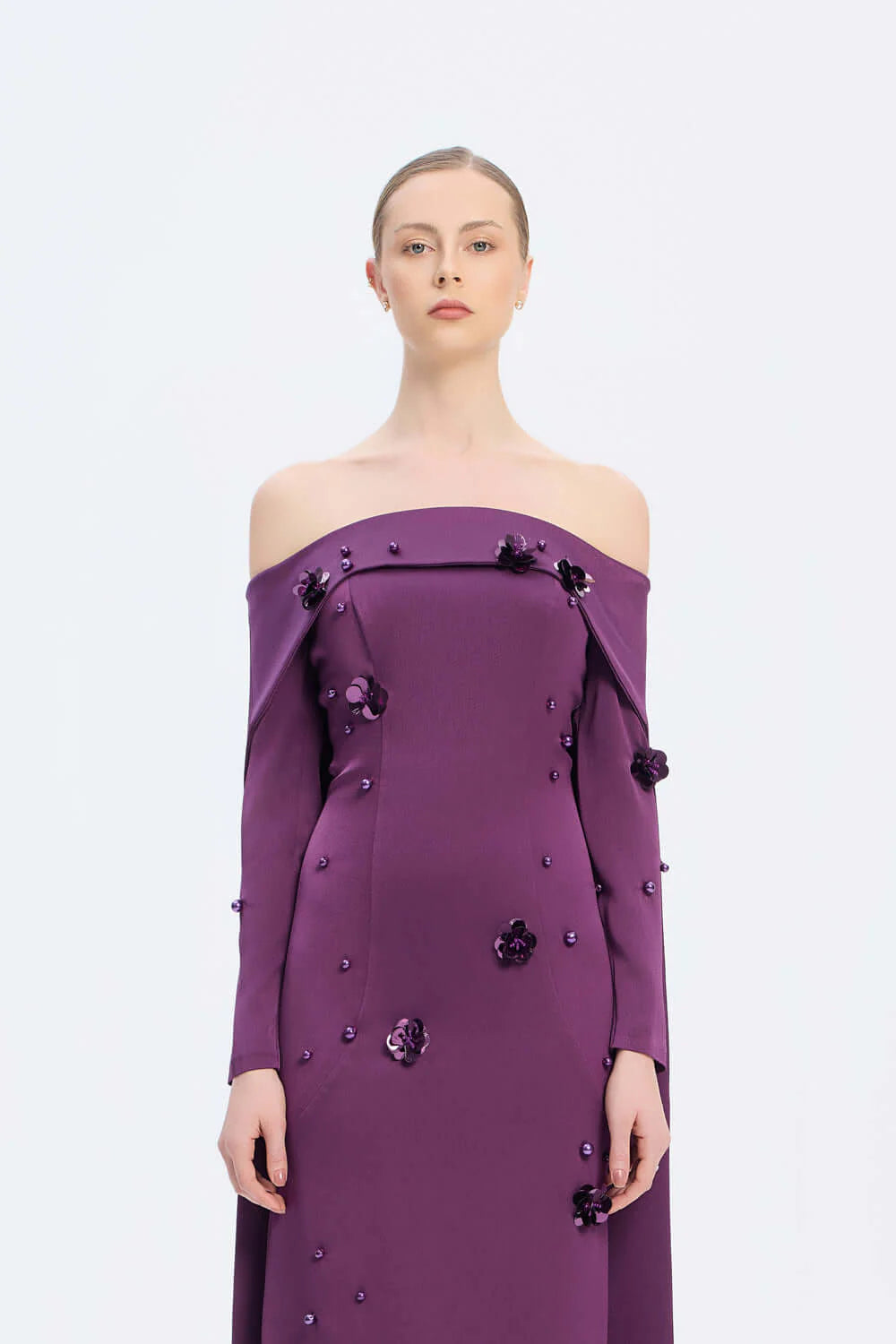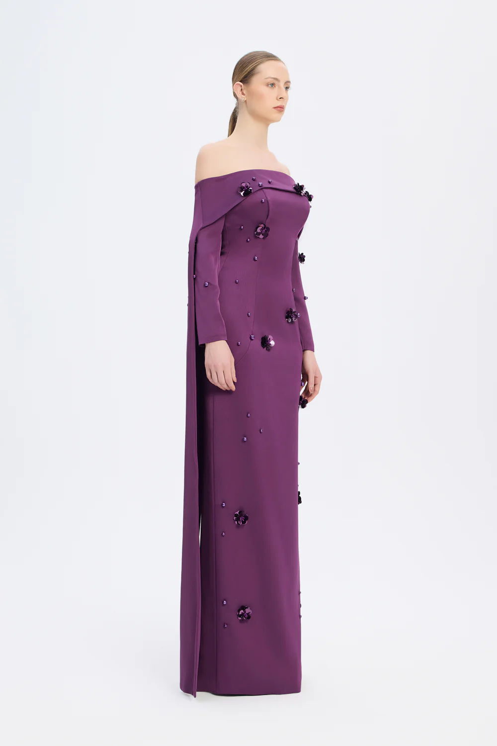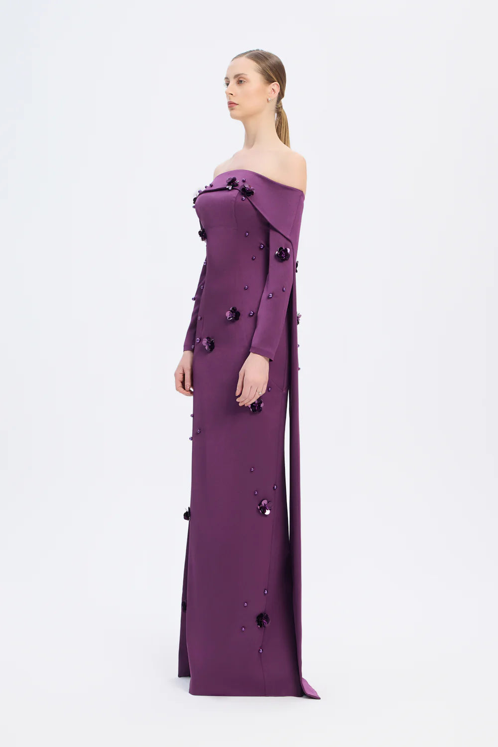 KAYIK YAKA AKSESUAR DETAYLI UZUN ABİYE ELBİSE - 01026C