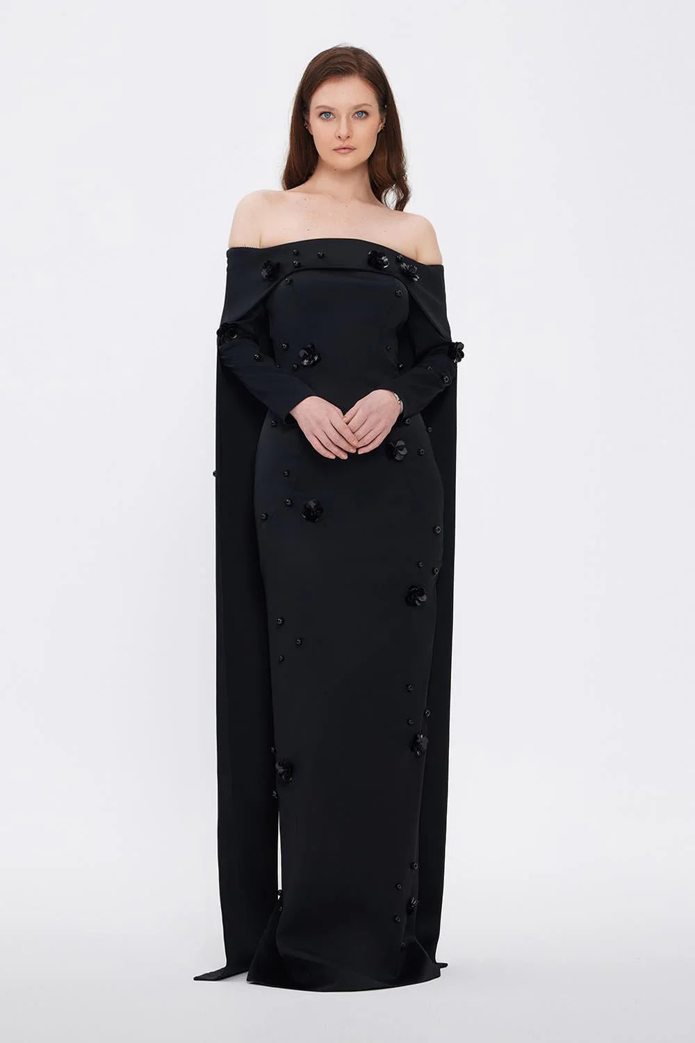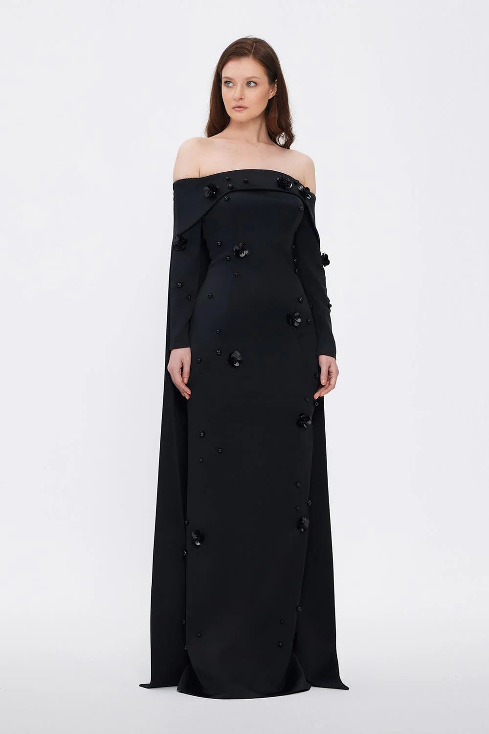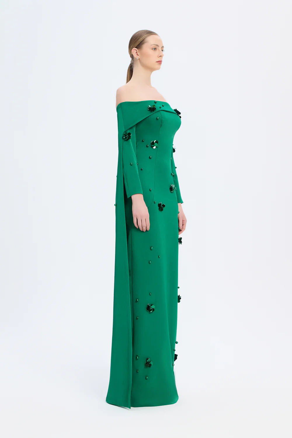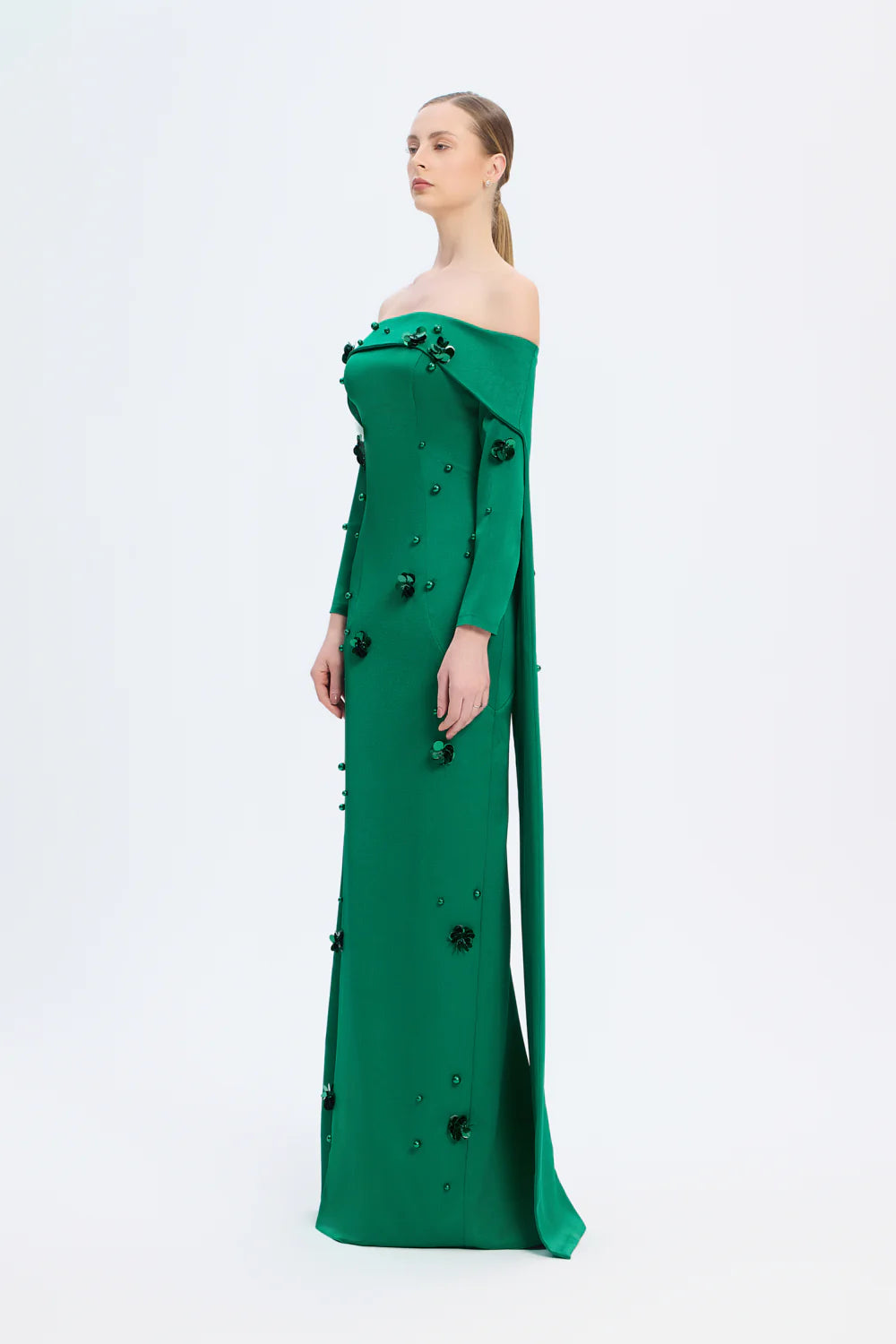 KAYIK YAKA AKSESUAR DETAYLI UZUN ABİYE ELBİSE - 01026C