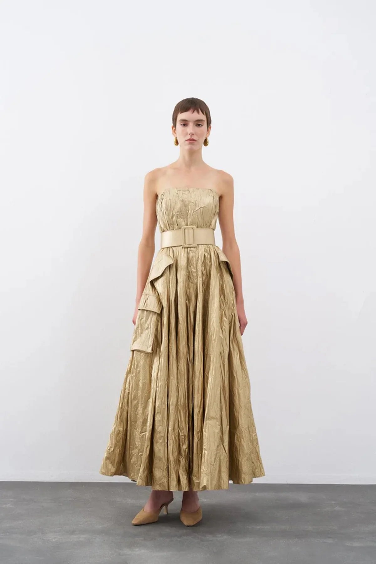 KEMER DETAYLI CEPLİ STRAPLEZ PARLAK UZUN ABİYE ELBİSE 2201