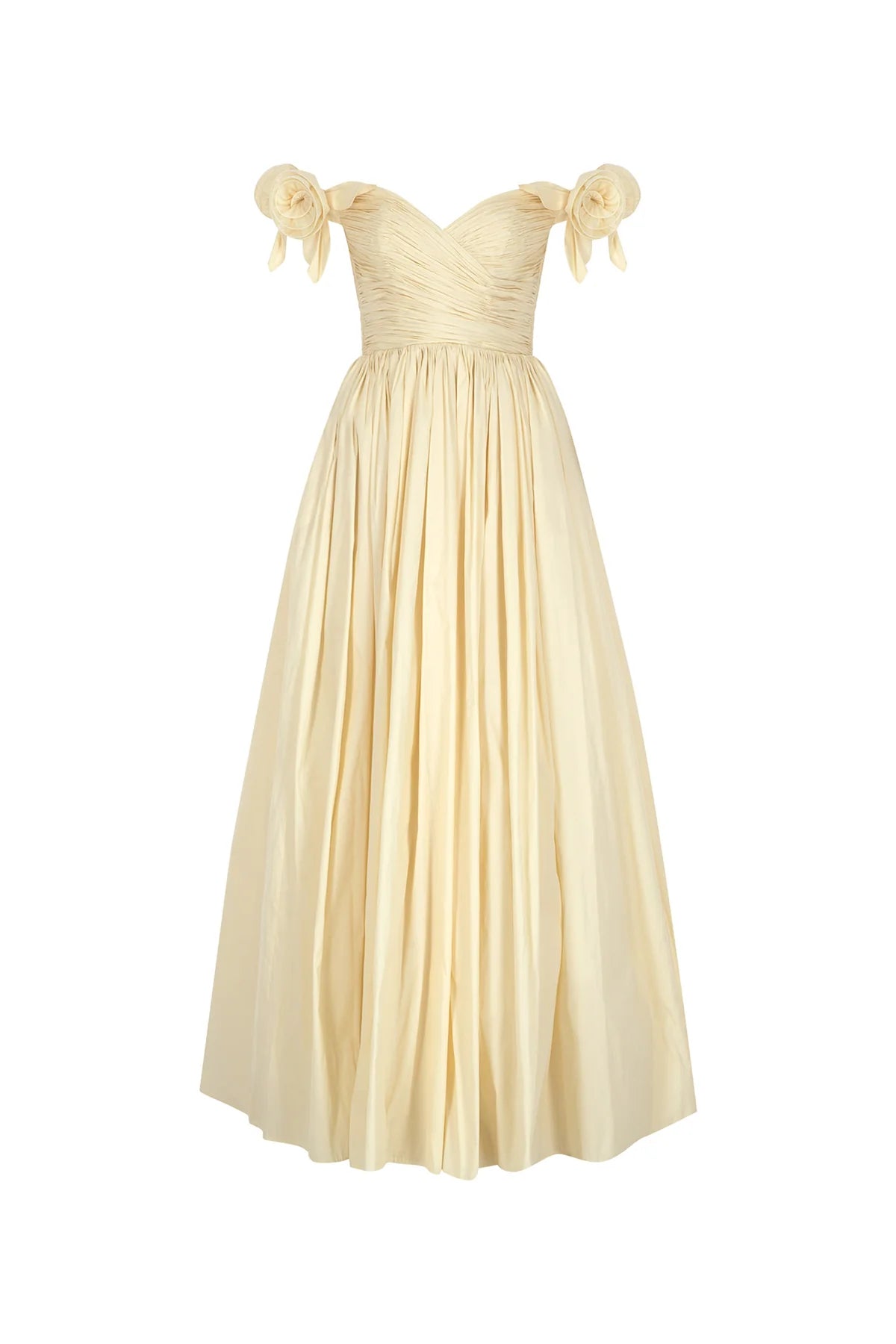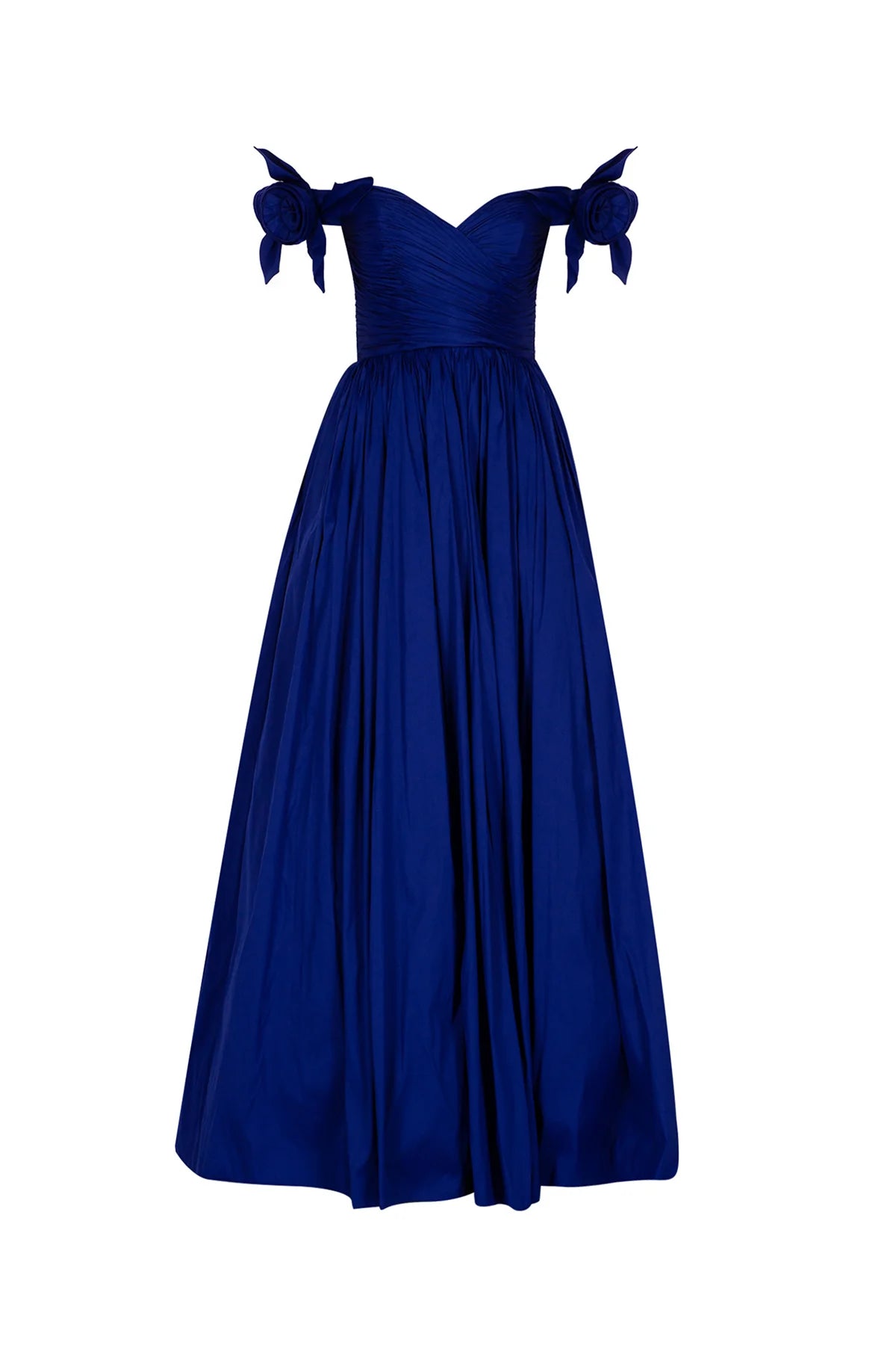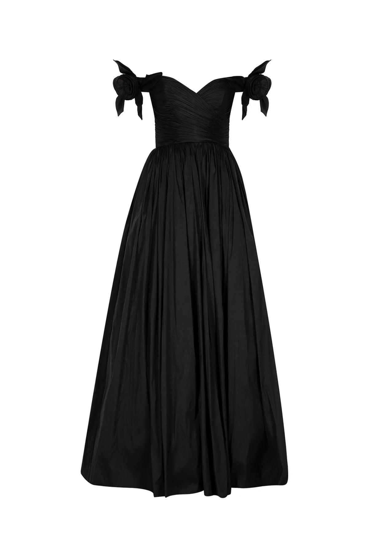 OMUZ AÇIK GÜL APLİKELİ PRENSES KESİM UZUN ABİYE ELBİSE 2029