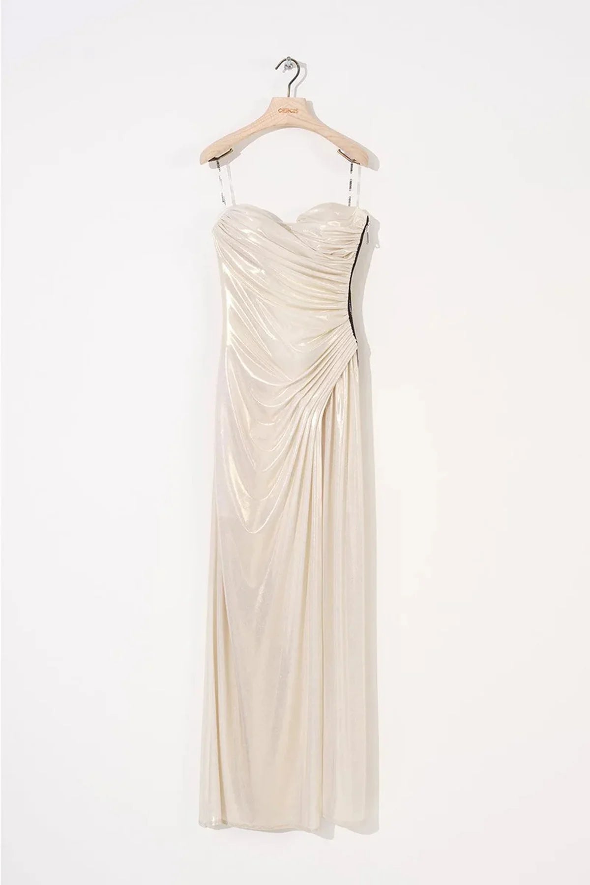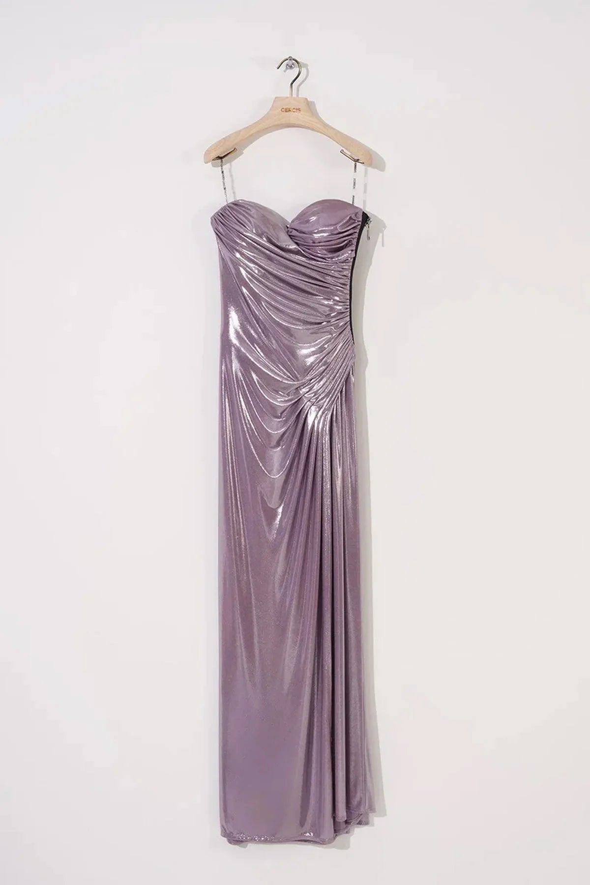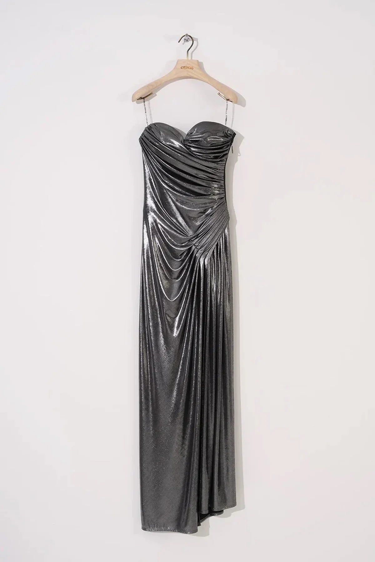 PARLAK STRAPLEZ DRAPELİ YIRTMAÇLI UZUN ELBİSE 2114
