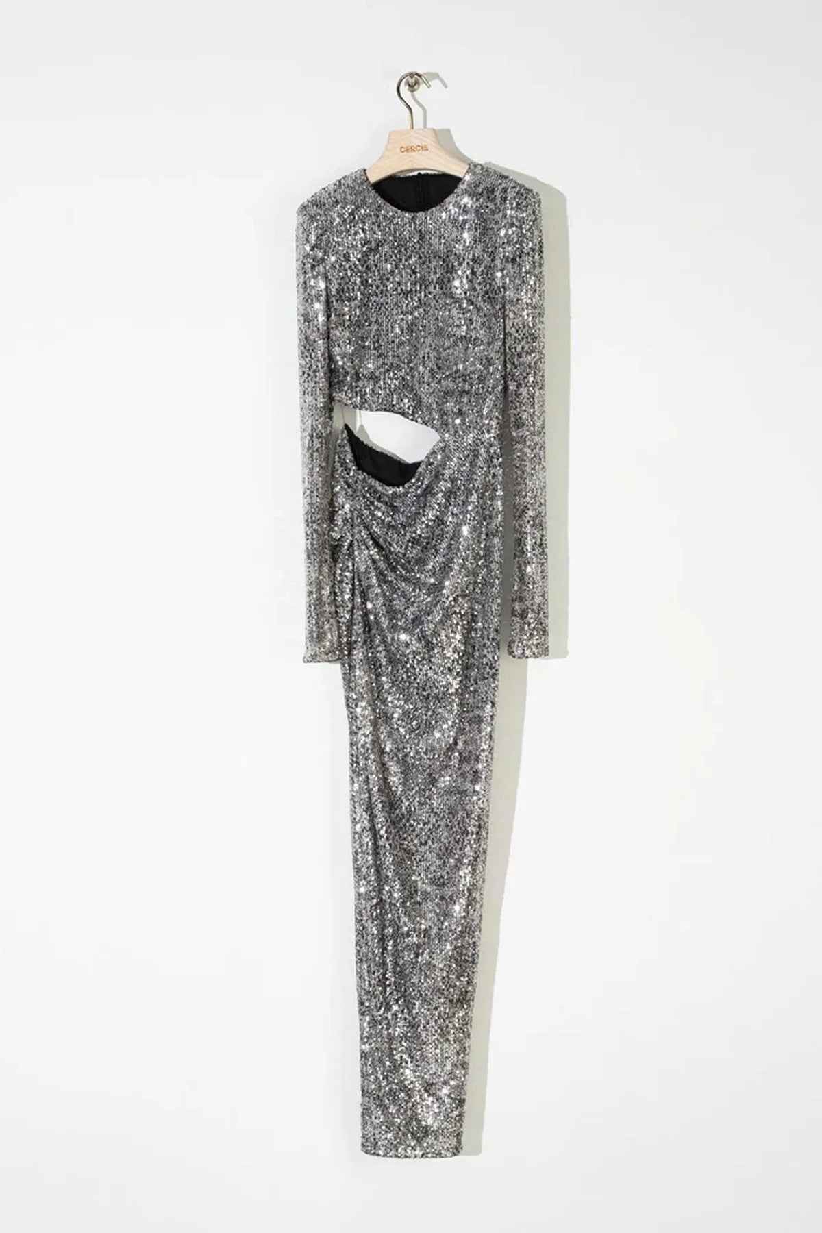 - Bisiklet yaka, uzun kollu, beli pencere detaylı, büzgülü derin yırtmaçlı, arka ortası gizli fermuarlı, astarlı, esnek payet kumaş elbise.