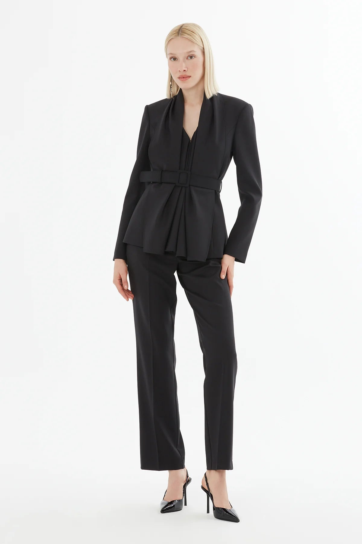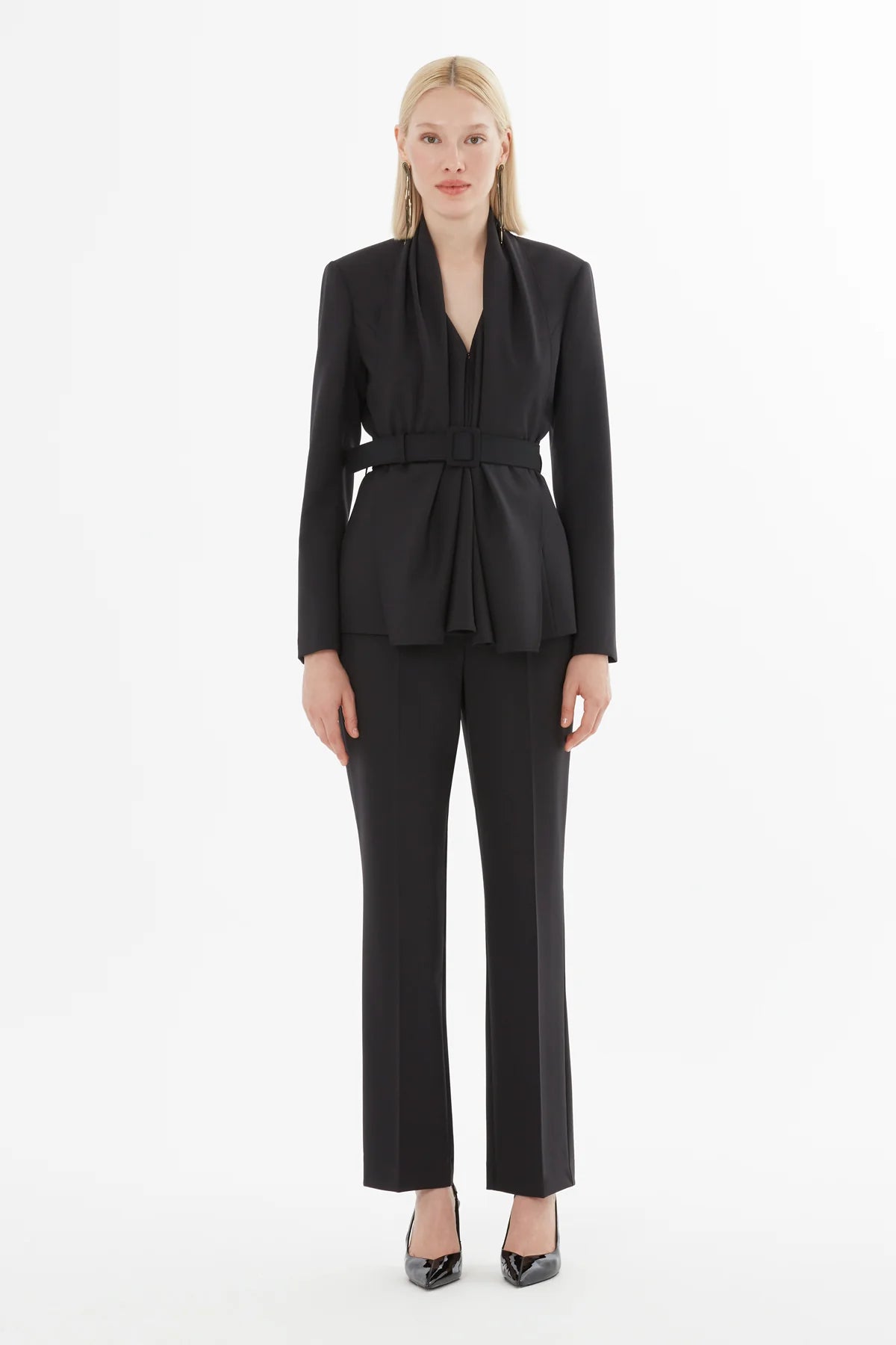 Şal Yakalı Kemerli Ceket Ve Pantolonlu Takım