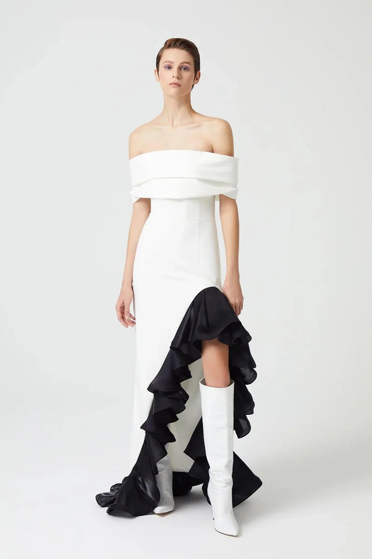 STRAPLEZ DÜŞÜK KOLLU VOLANLI ASİMETRİK KESİM ELBİSE