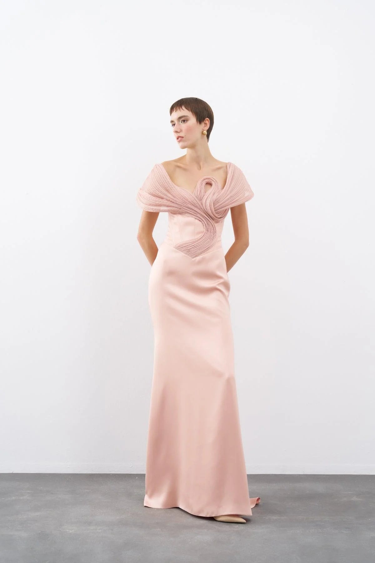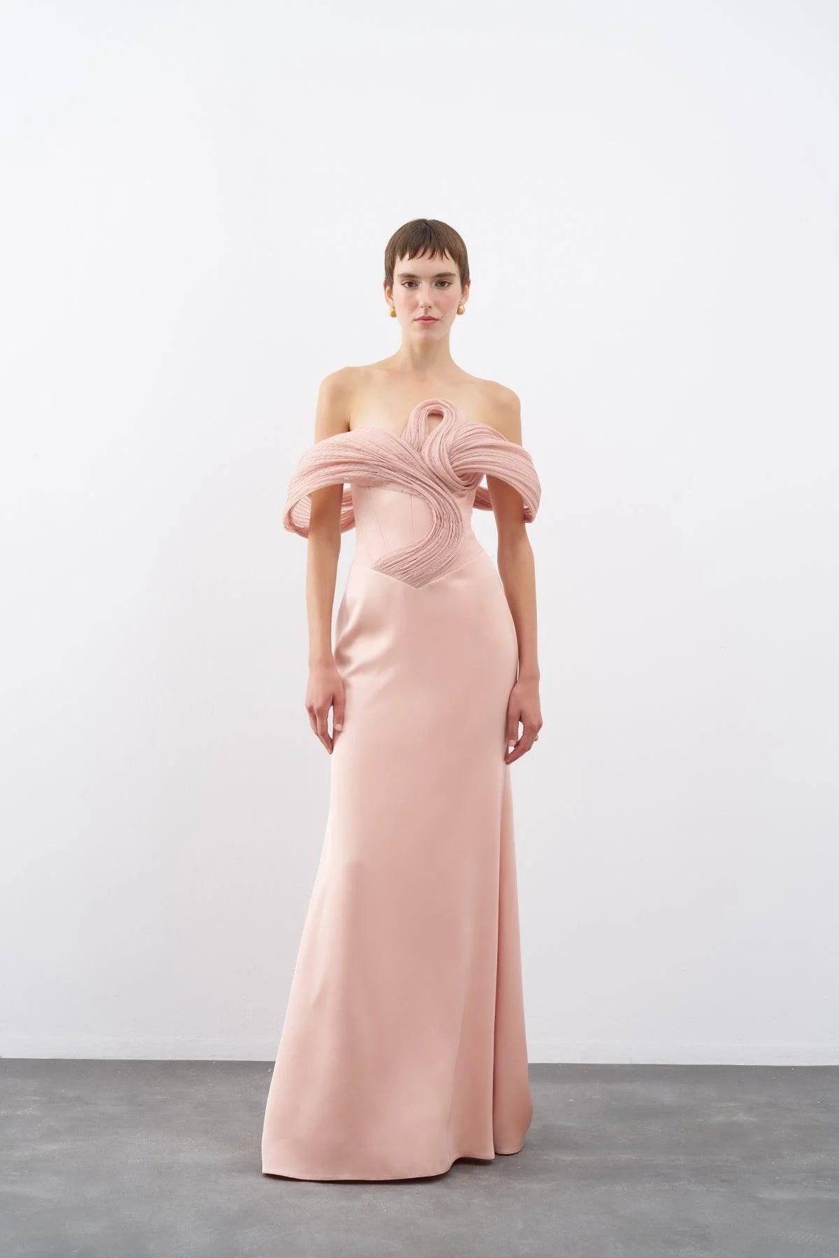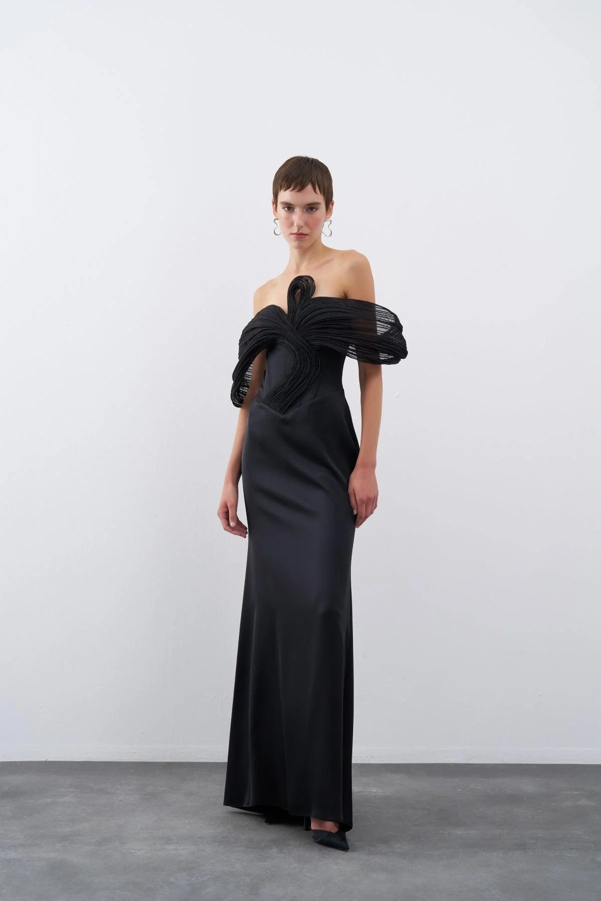 STRAPLEZ DÜŞÜK OMUZLU ORGANZE DETAYLI UZUN ABİYE ELBİSE 2246