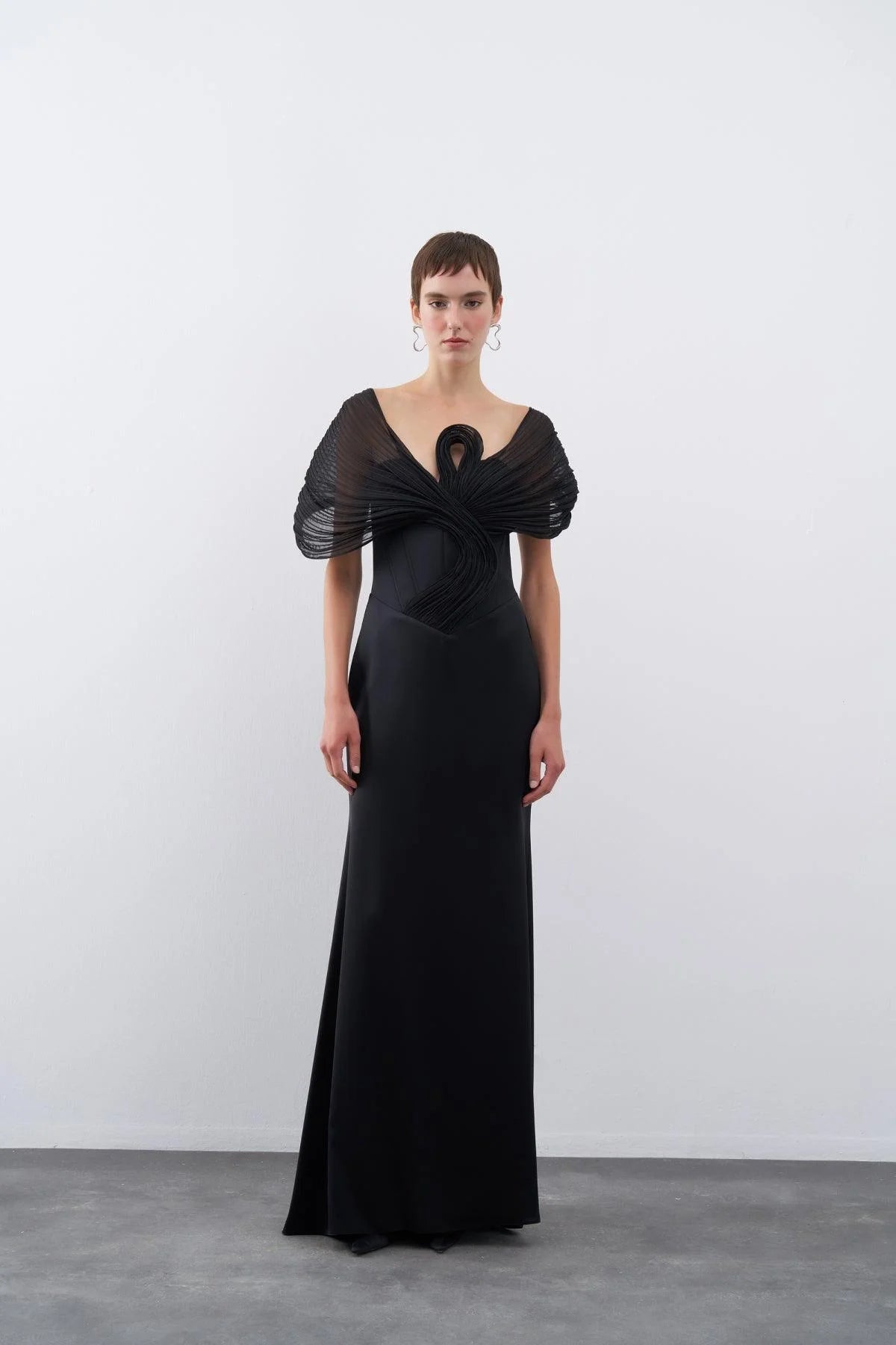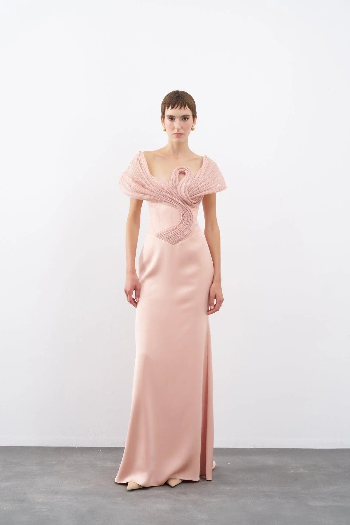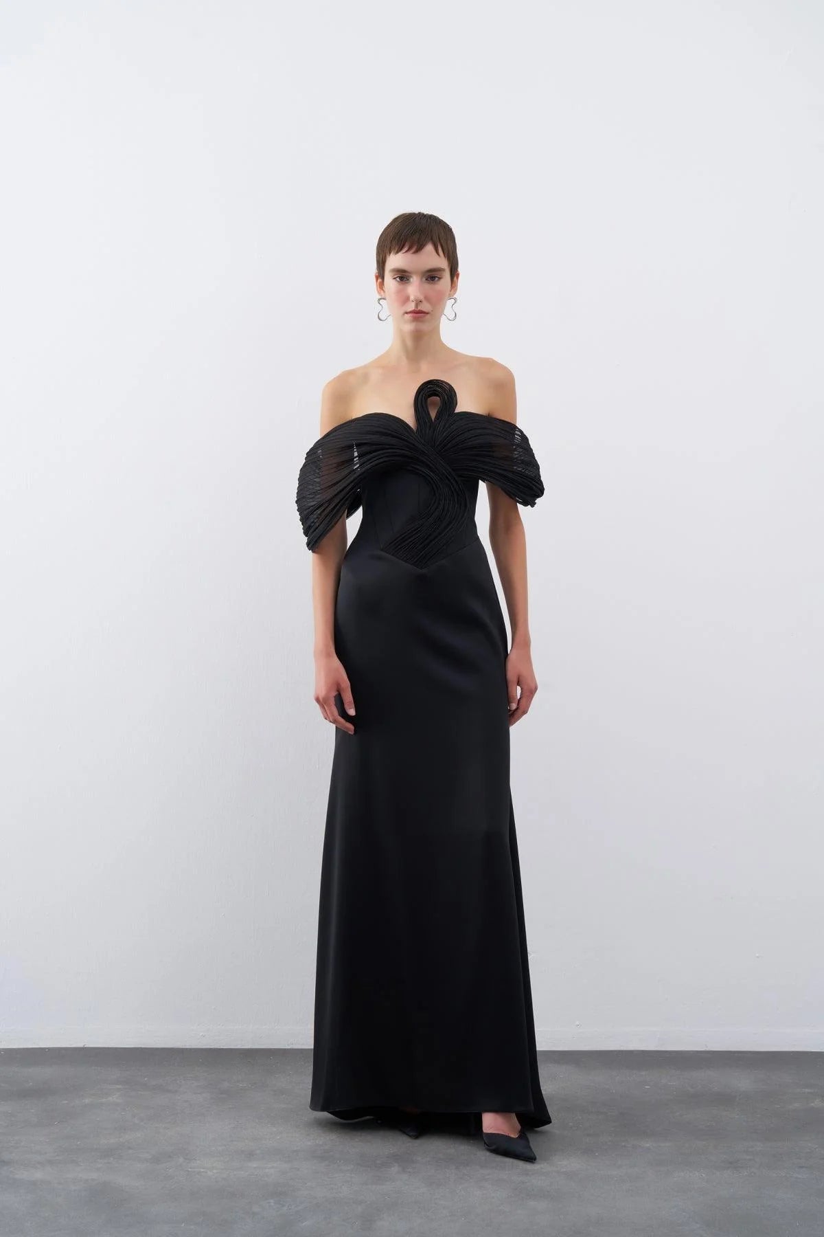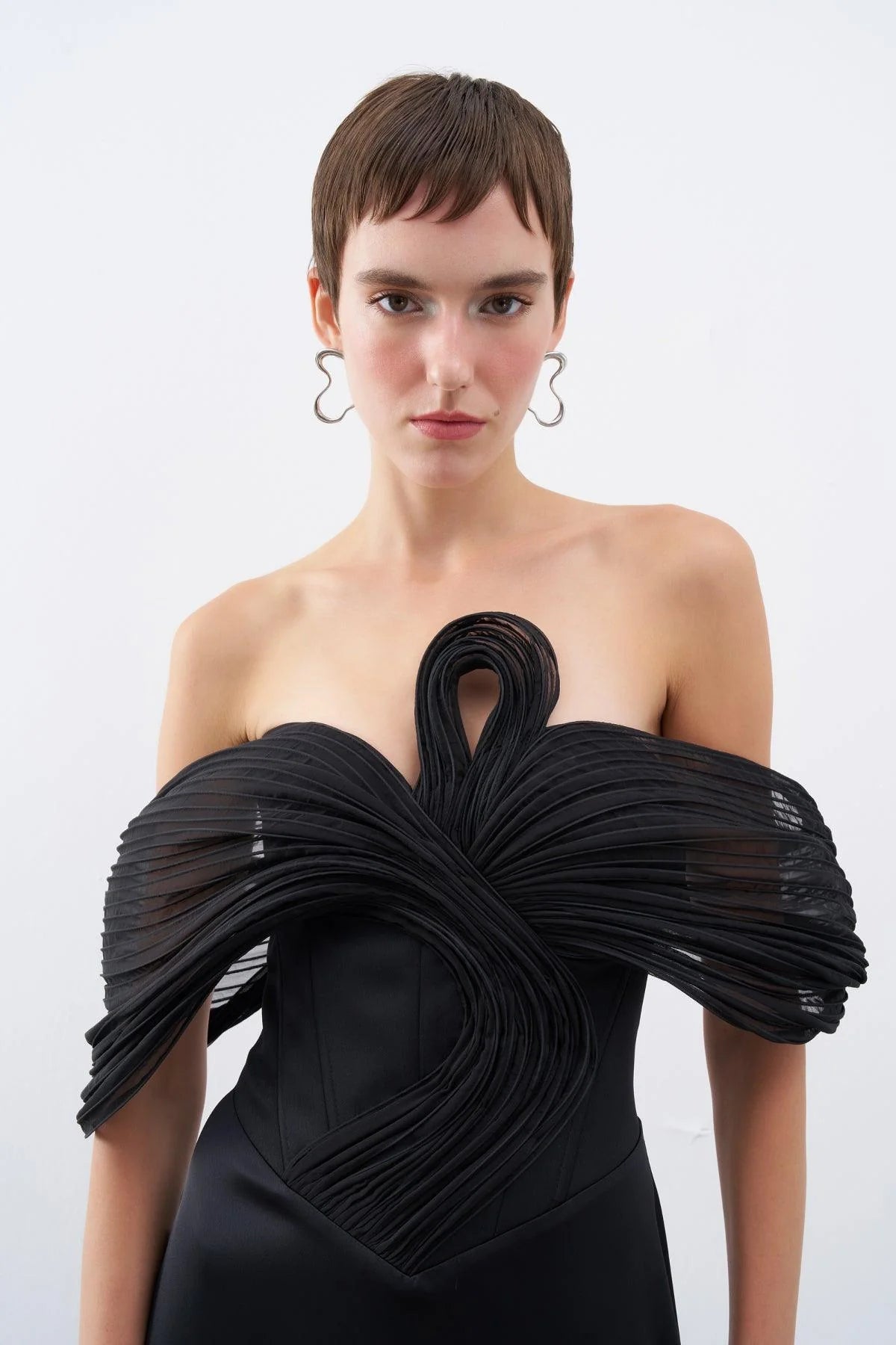 STRAPLEZ DÜŞÜK OMUZLU ORGANZE DETAYLI UZUN ABİYE ELBİSE 2246