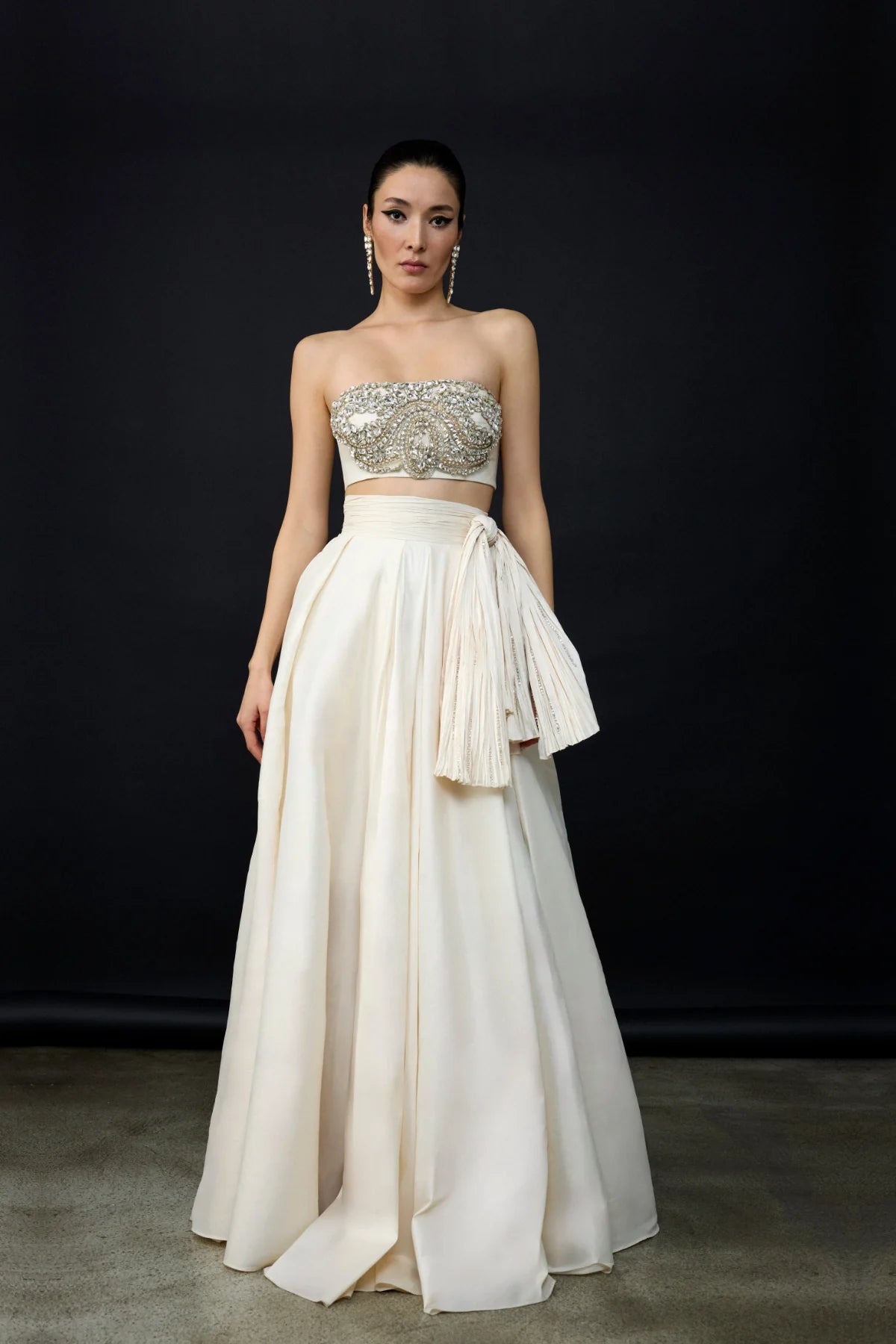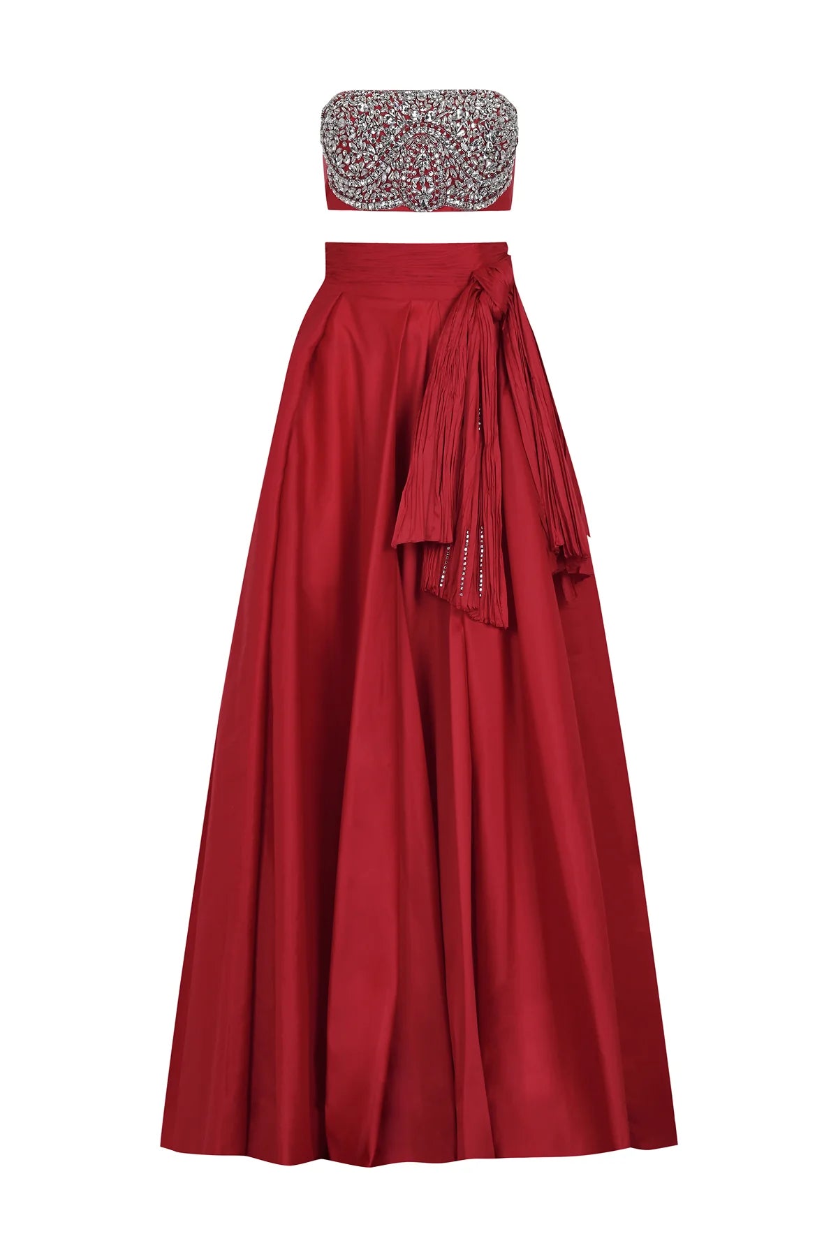 Straplez Taş İşlemeli Crop Yüksek Bel Etek Takım