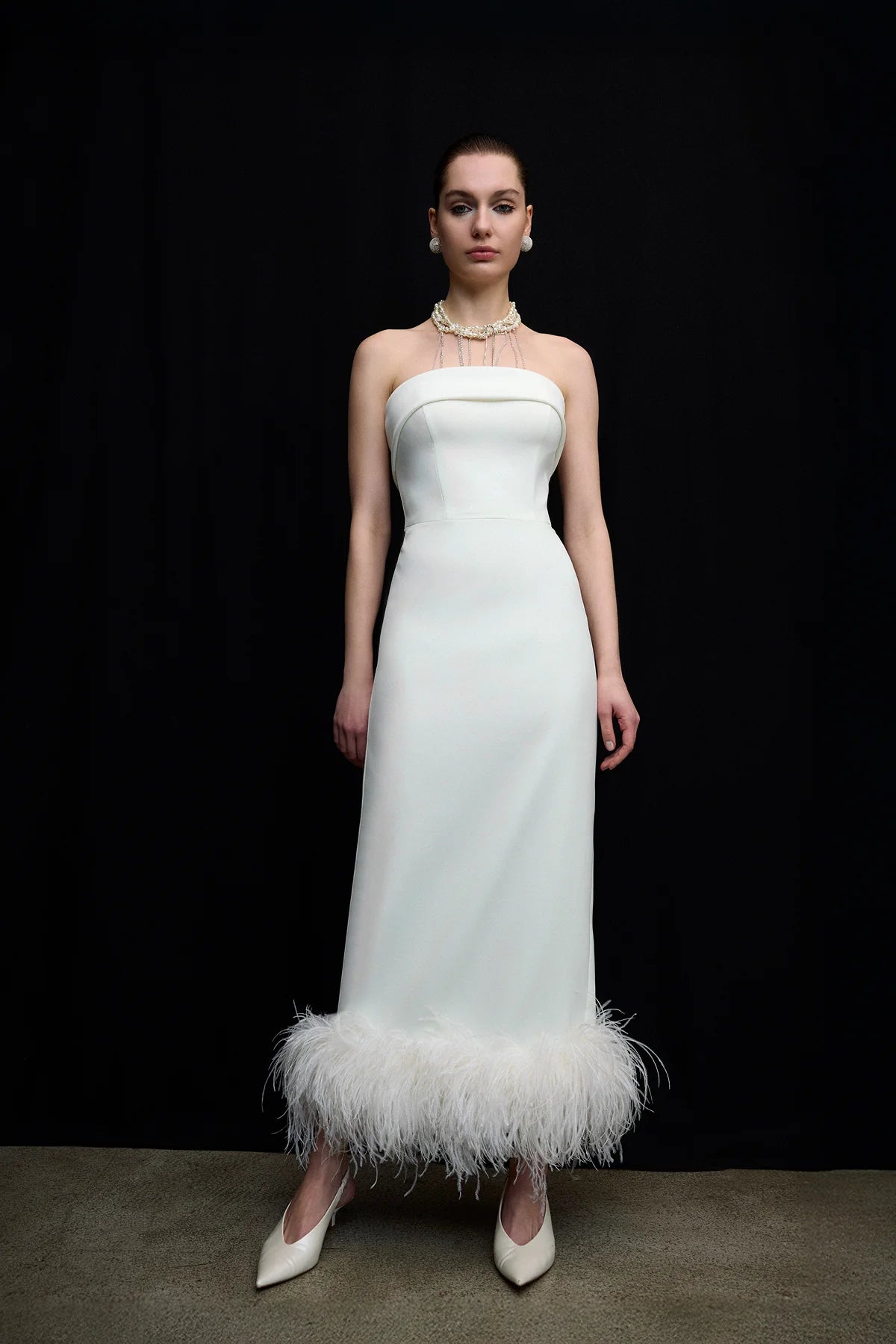 Straplez Tüy Etek Detaylı Midi Abiye Elbise