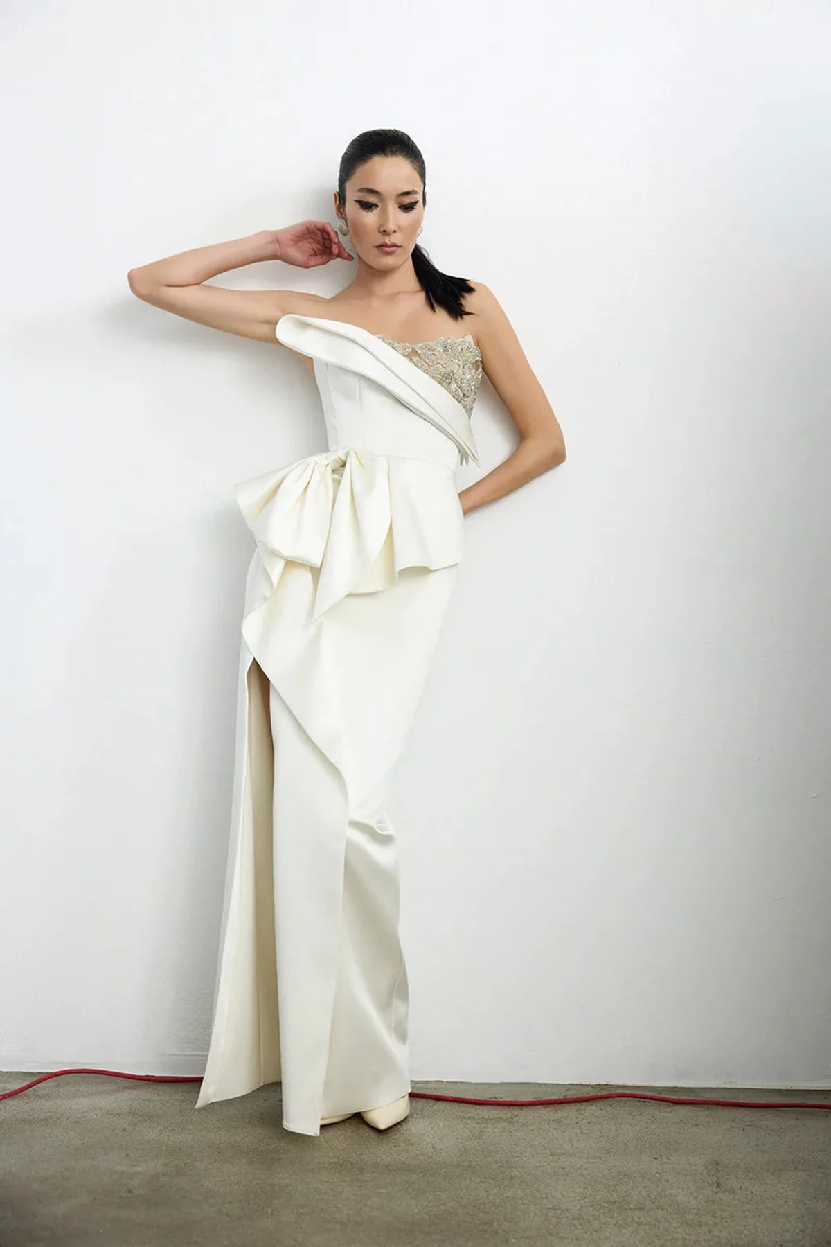 TAŞ İŞLEMELİ FİYONK DETAYLI STRAPLEZ UZUN ABİYE ELBİSE