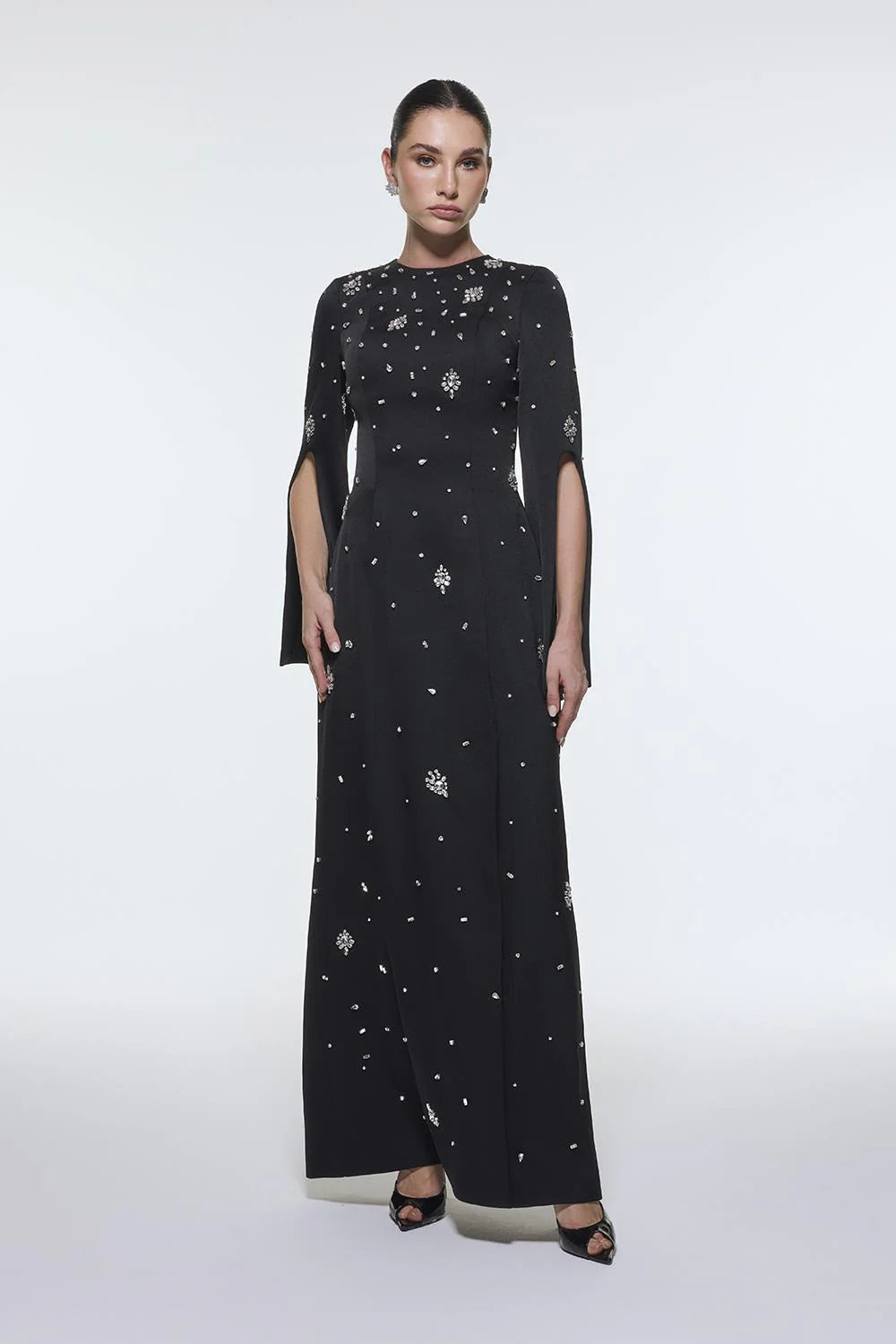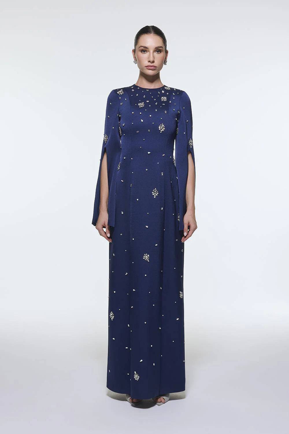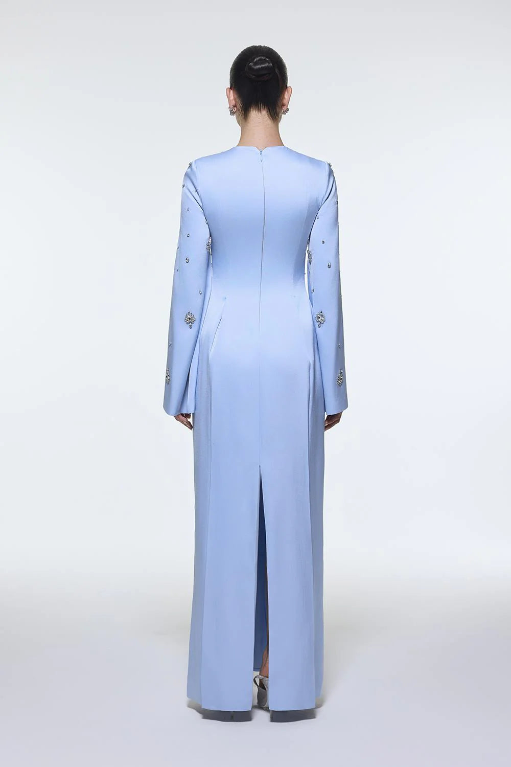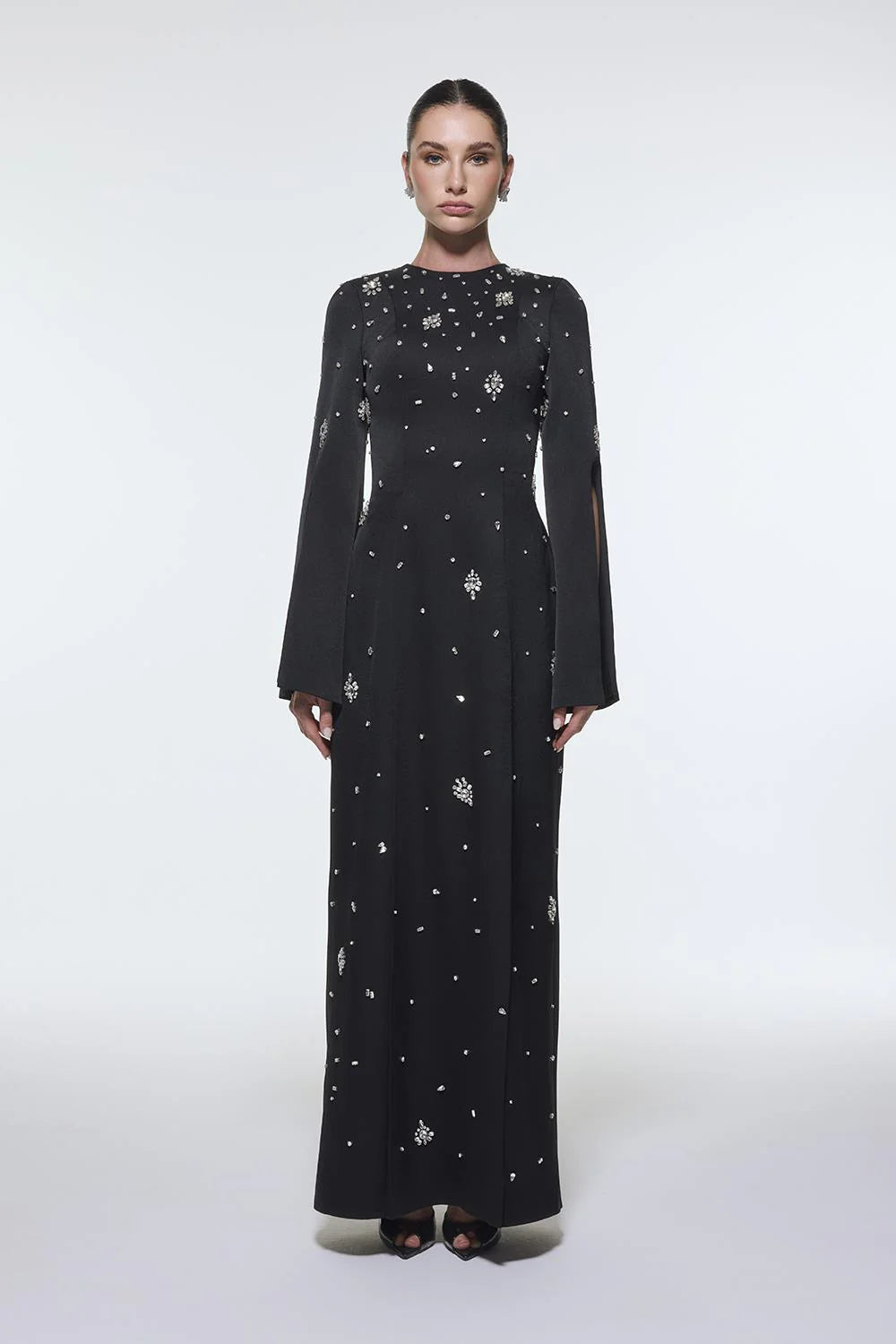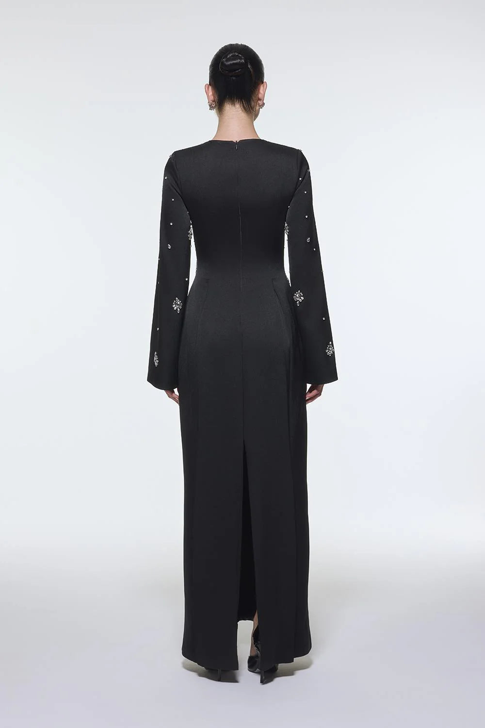 TAŞ İŞLEMELİ UZUN KOLLU KREP ABİYE ELBİSE - 9403C