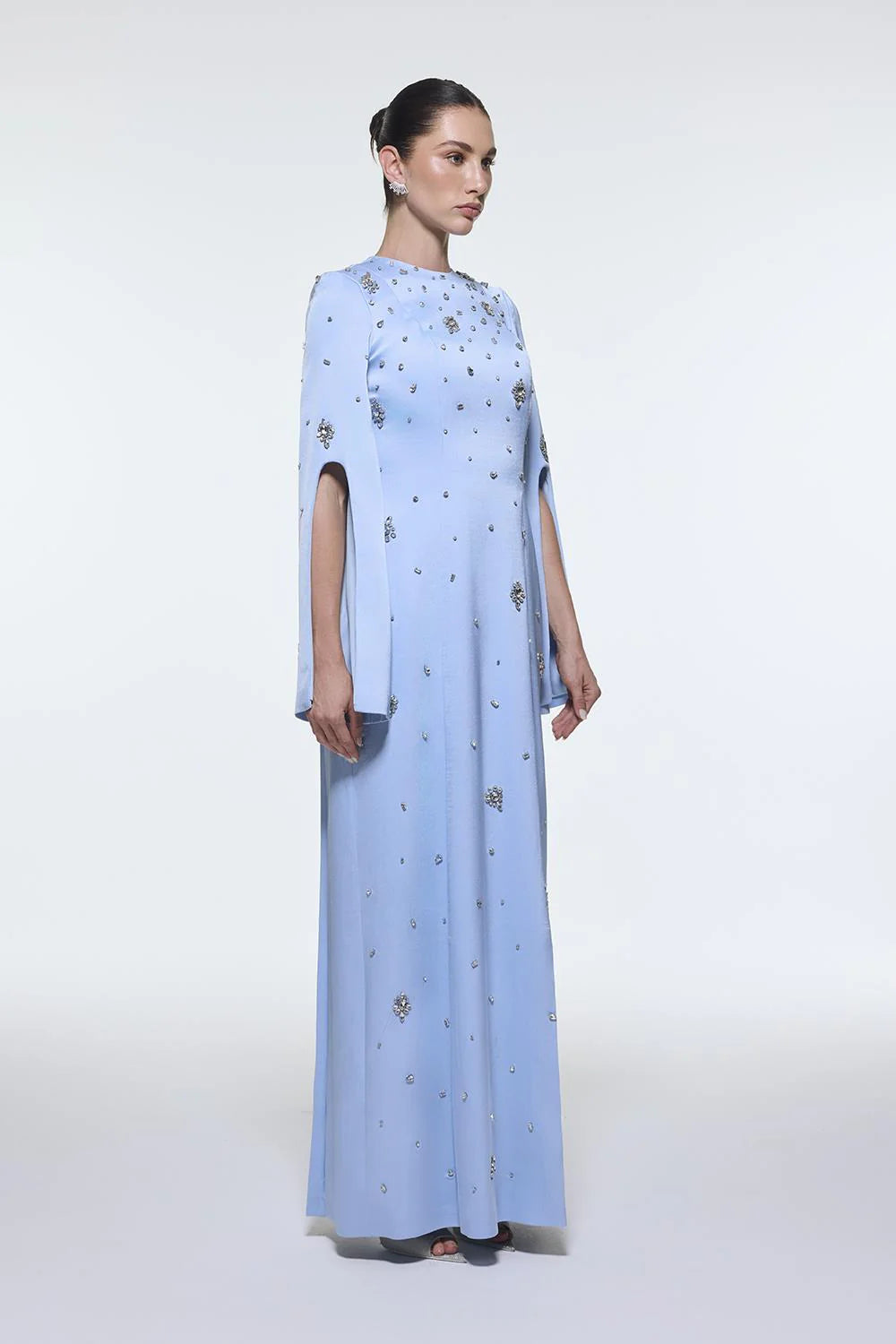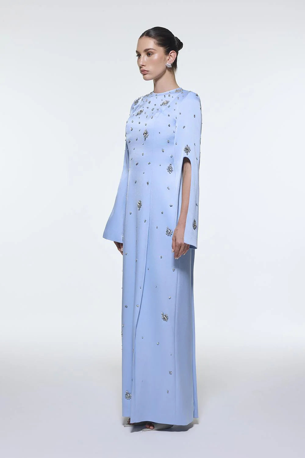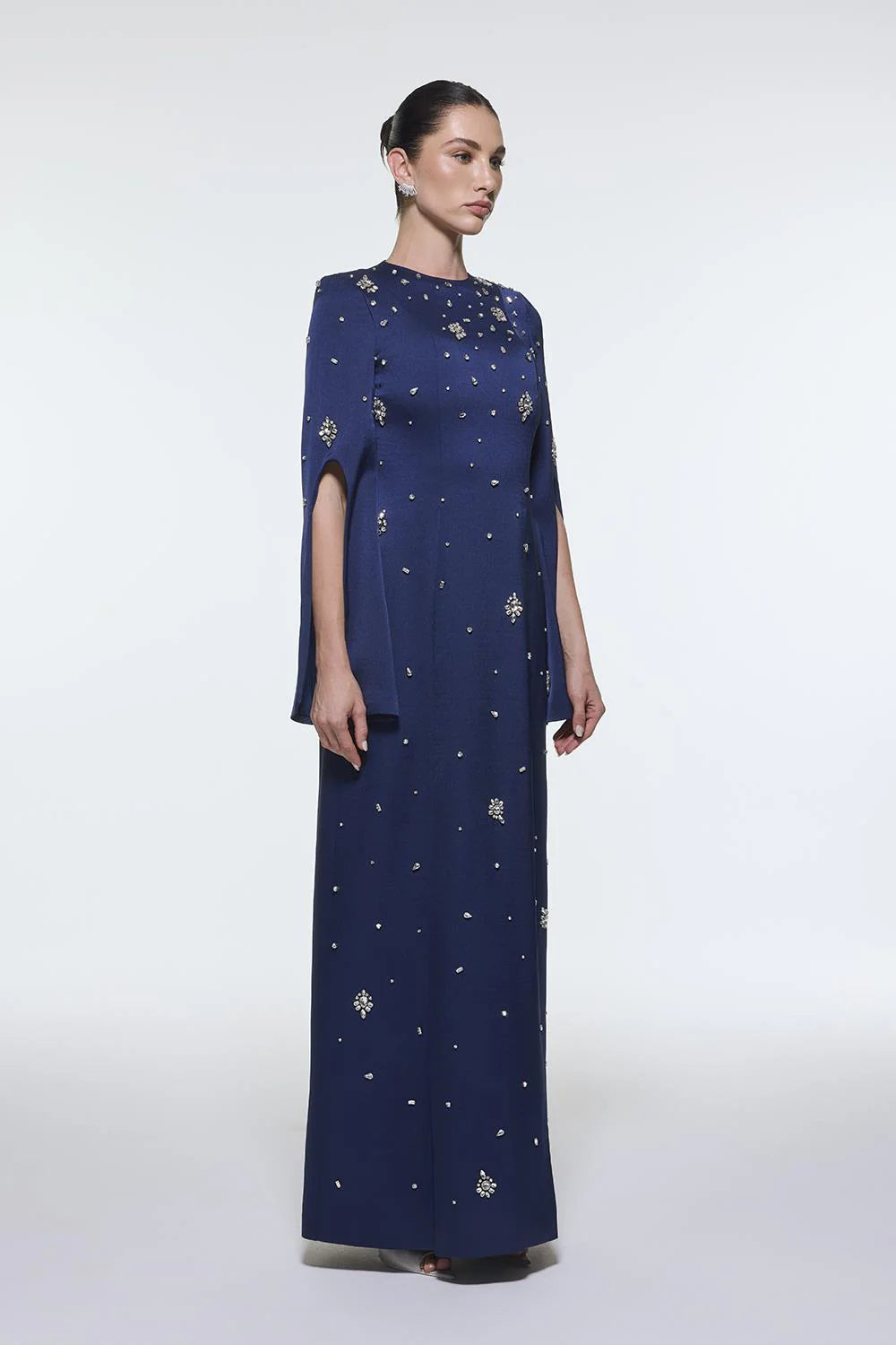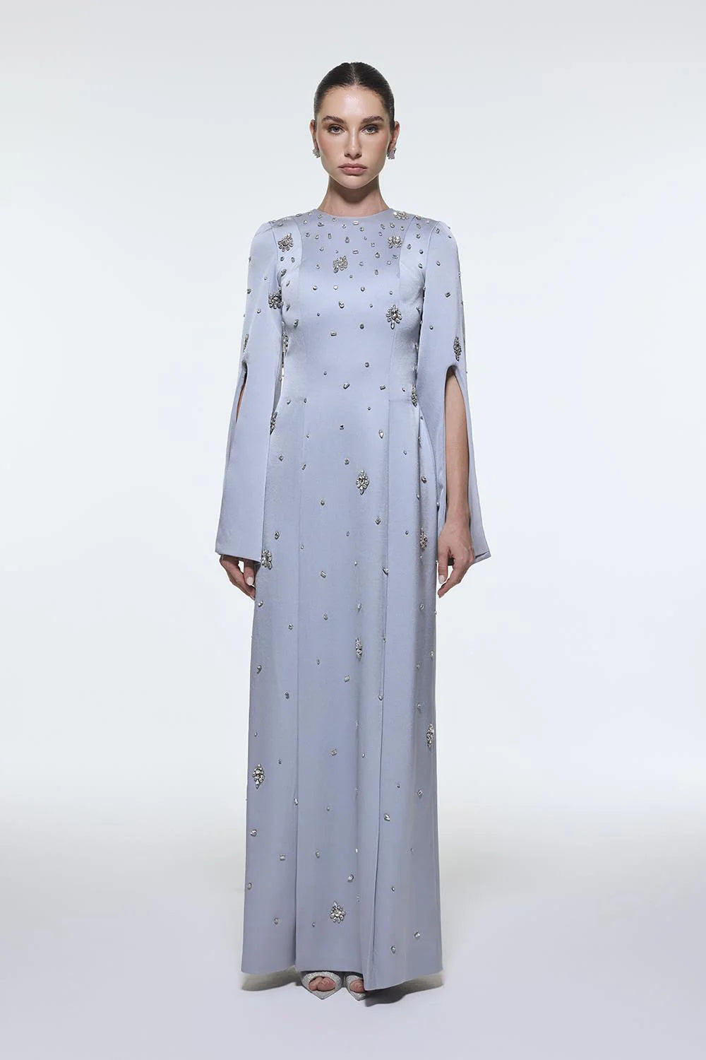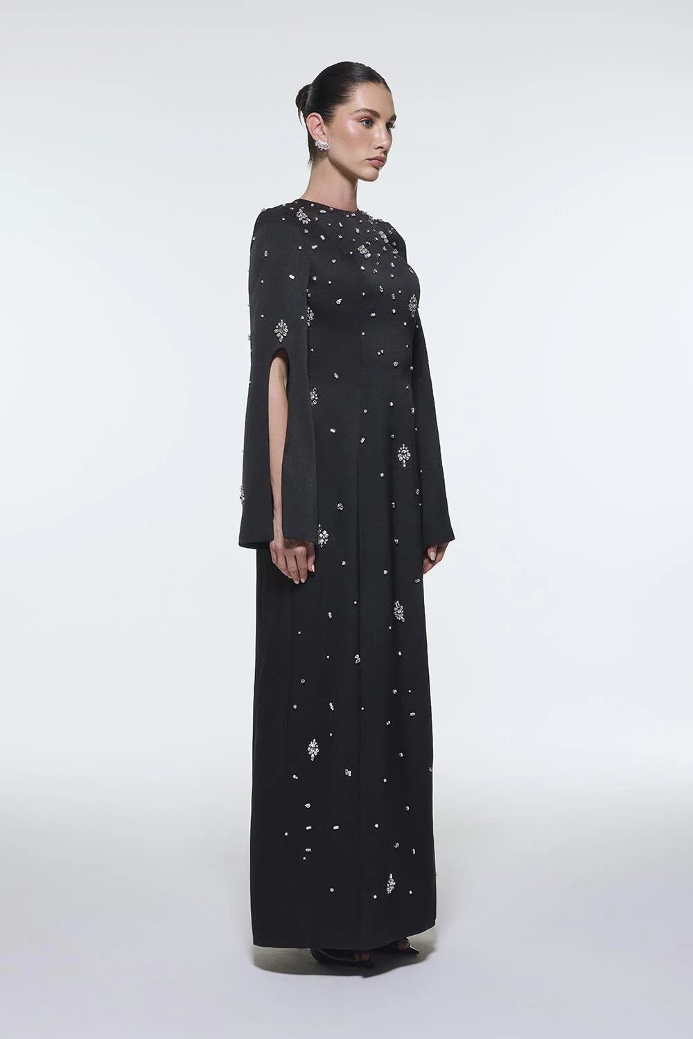 TAŞ İŞLEMELİ UZUN KOLLU KREP ABİYE ELBİSE - 9403C