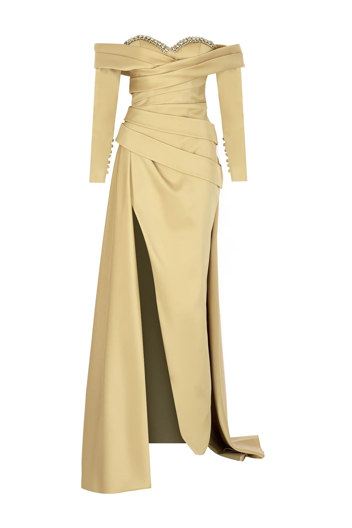 TAŞ İŞLEMELİ UZUN KOLLU SATEN YIRTMAÇLI ABİYE ELBİSE 2312