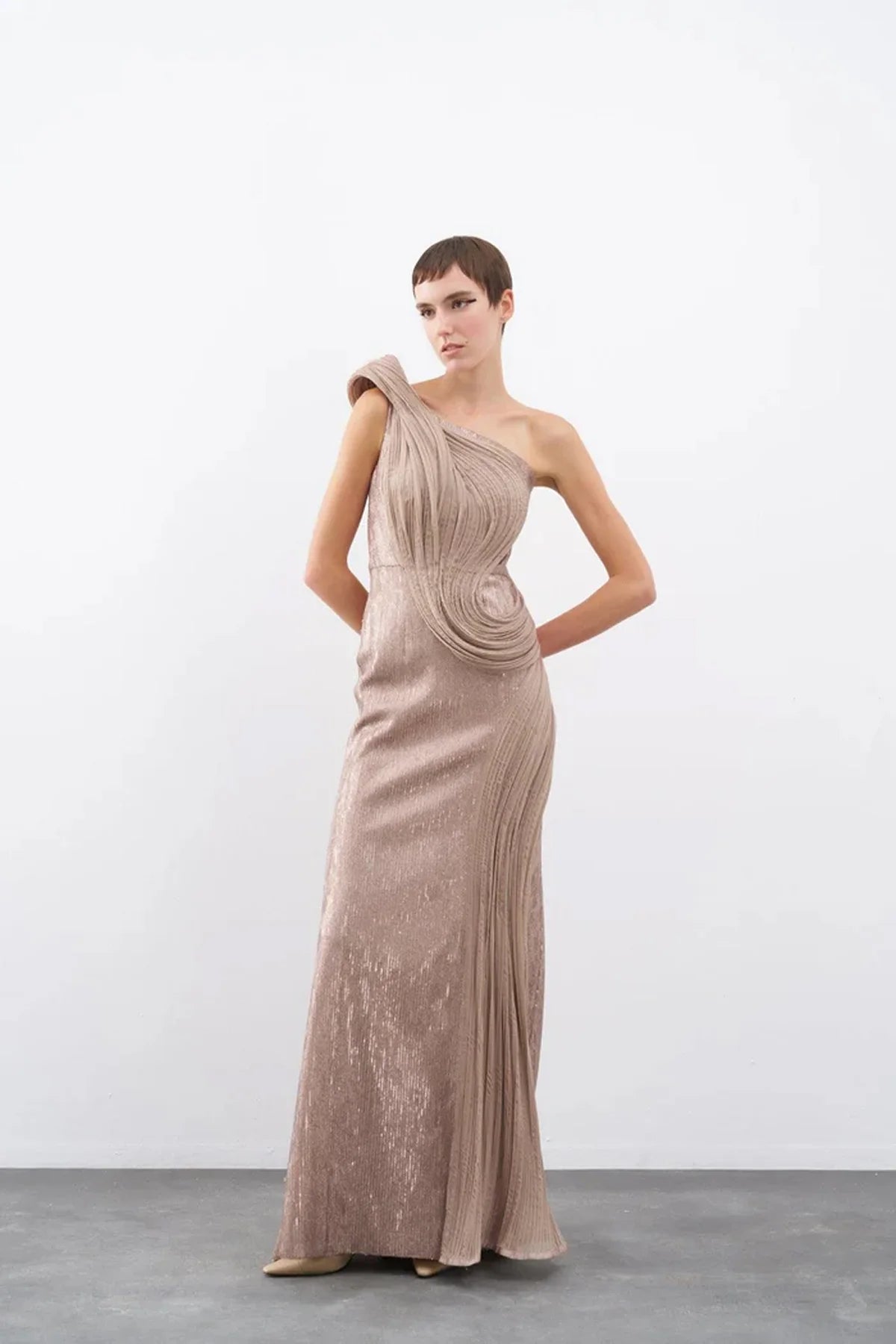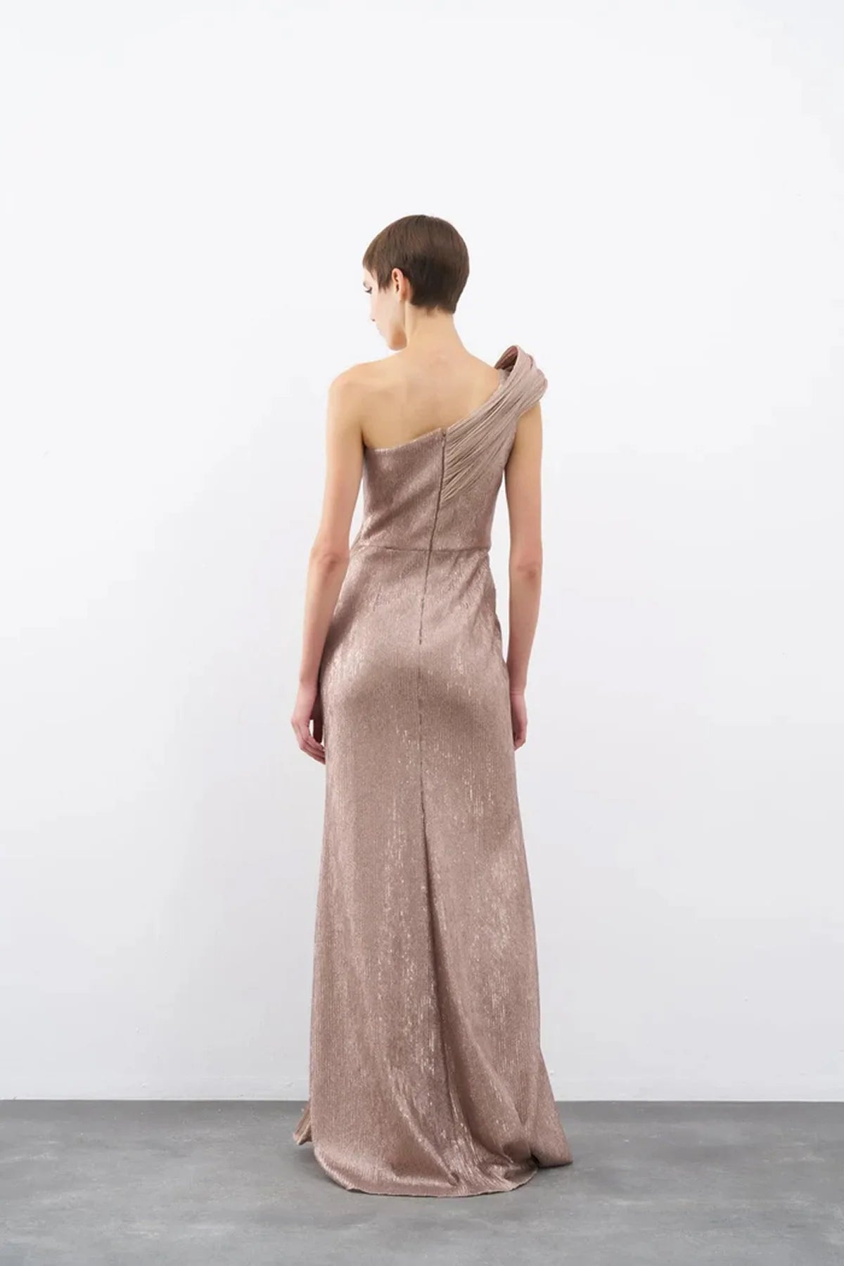pilise detaylı, payetli, sırt dekolteli, arkası gizli fermuar kapamalı.
