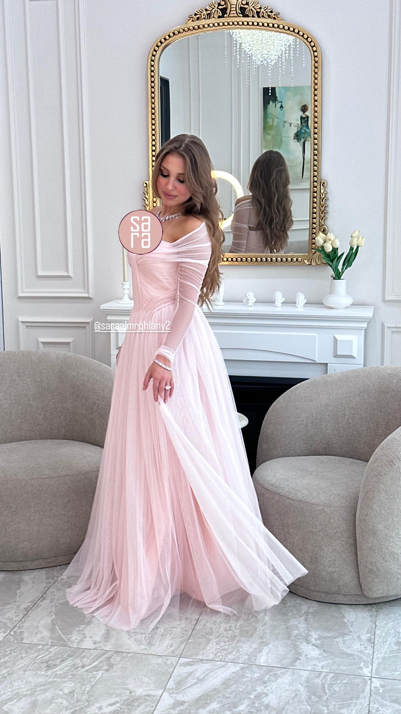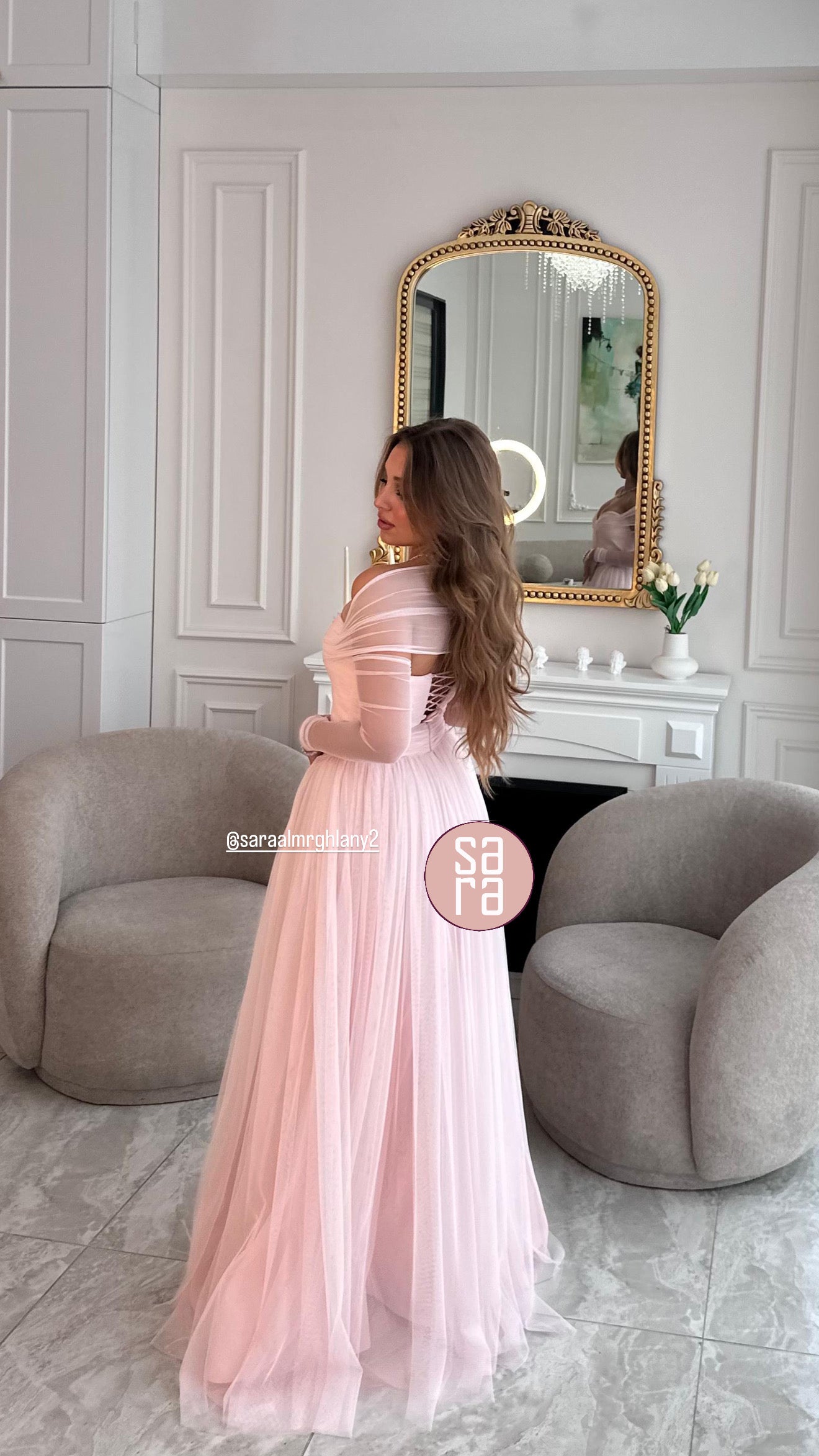 TRANSPARAN TÜL KOLLU STRAPLEZ UZUN ABİYE 2220