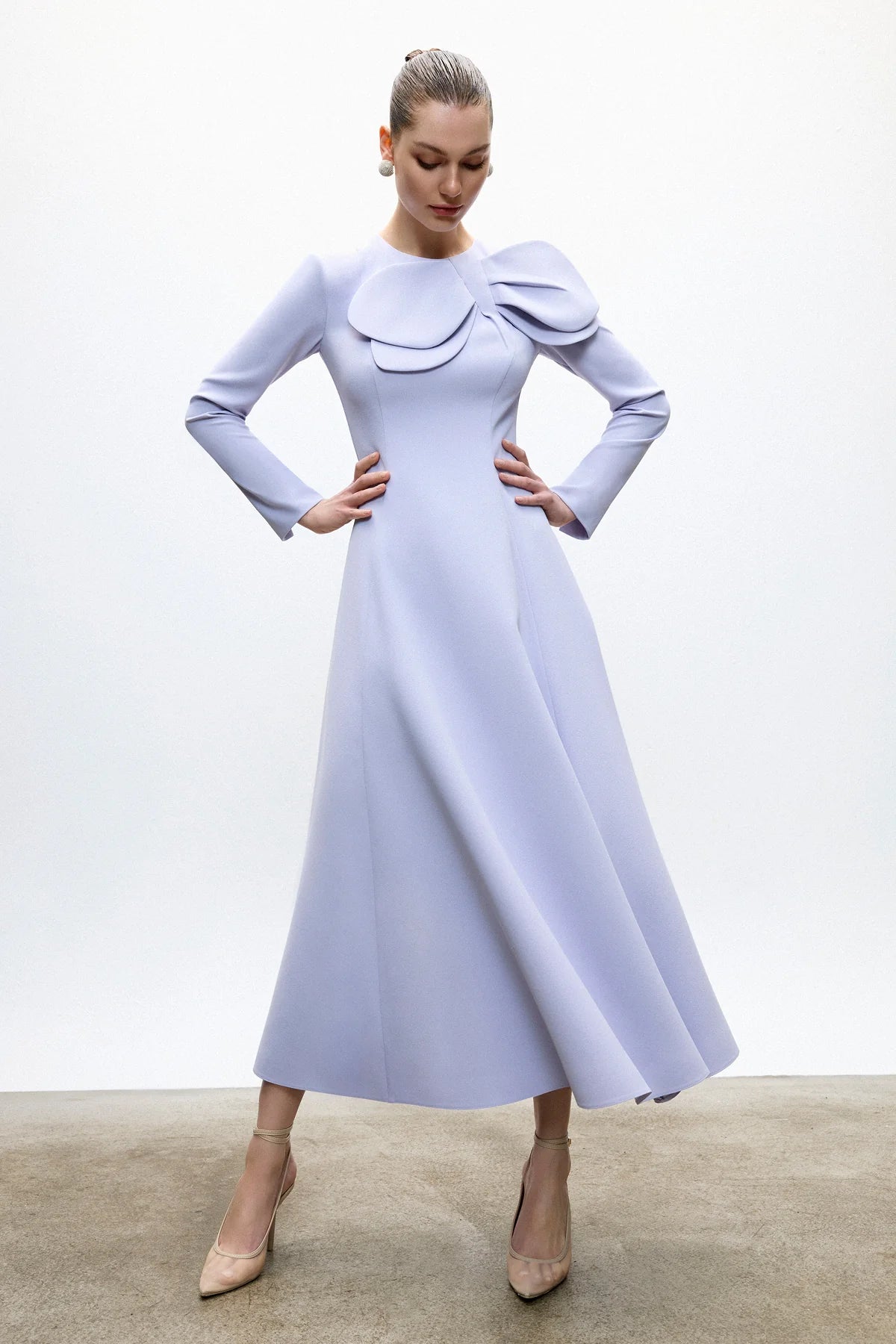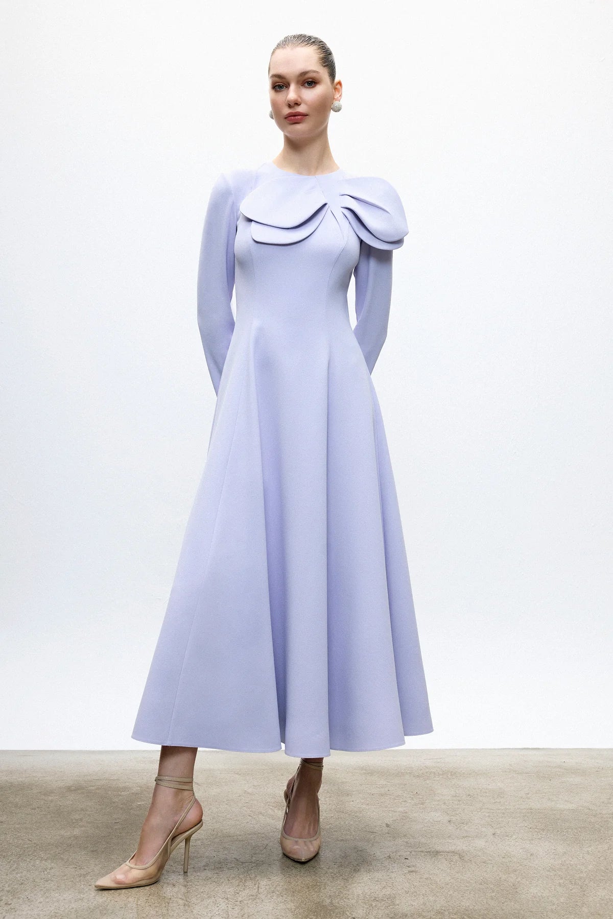 Uzun Kollu Asimetrik Fiyonk Detaylı Midi Elbise 2037