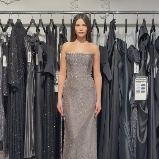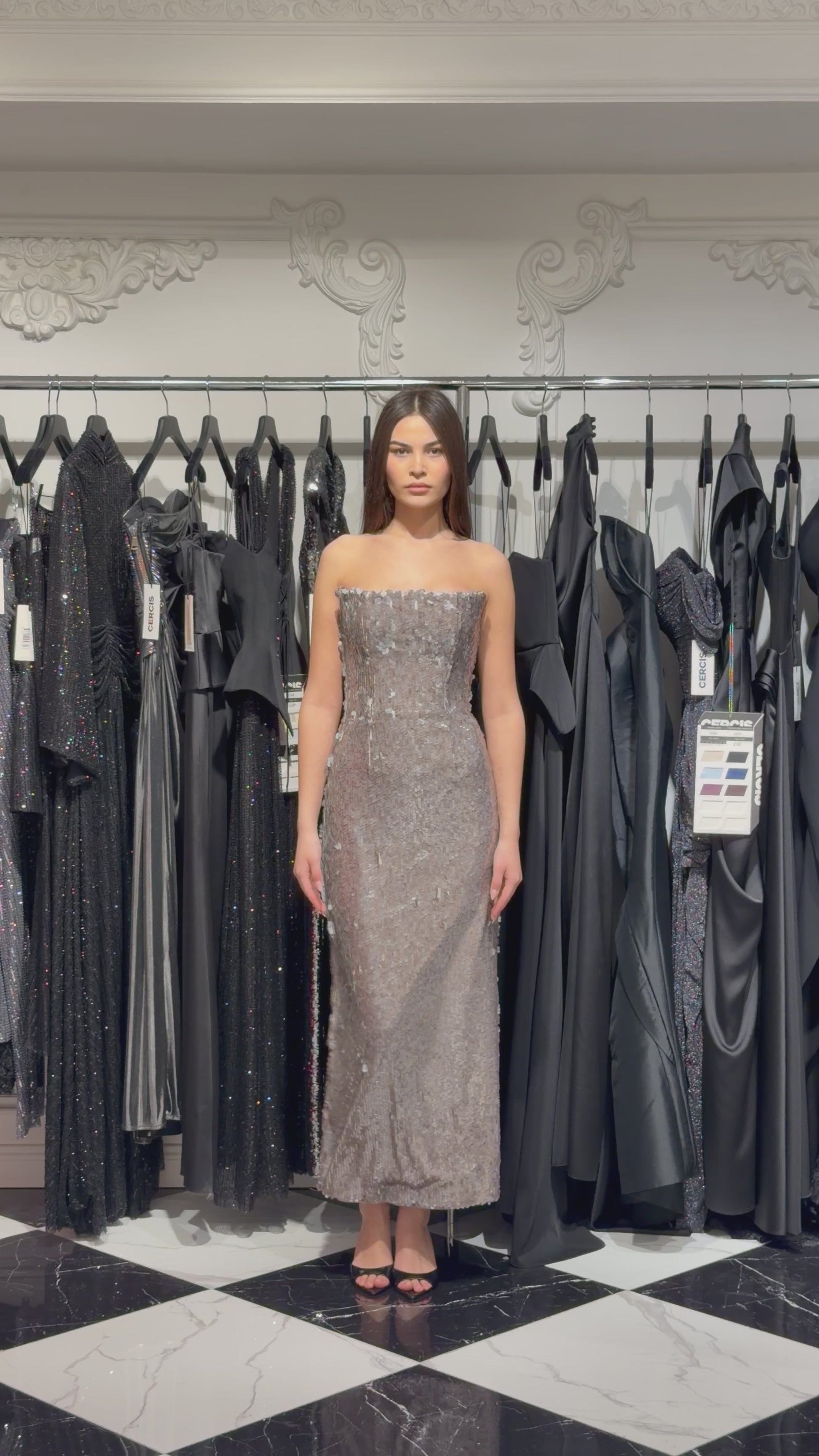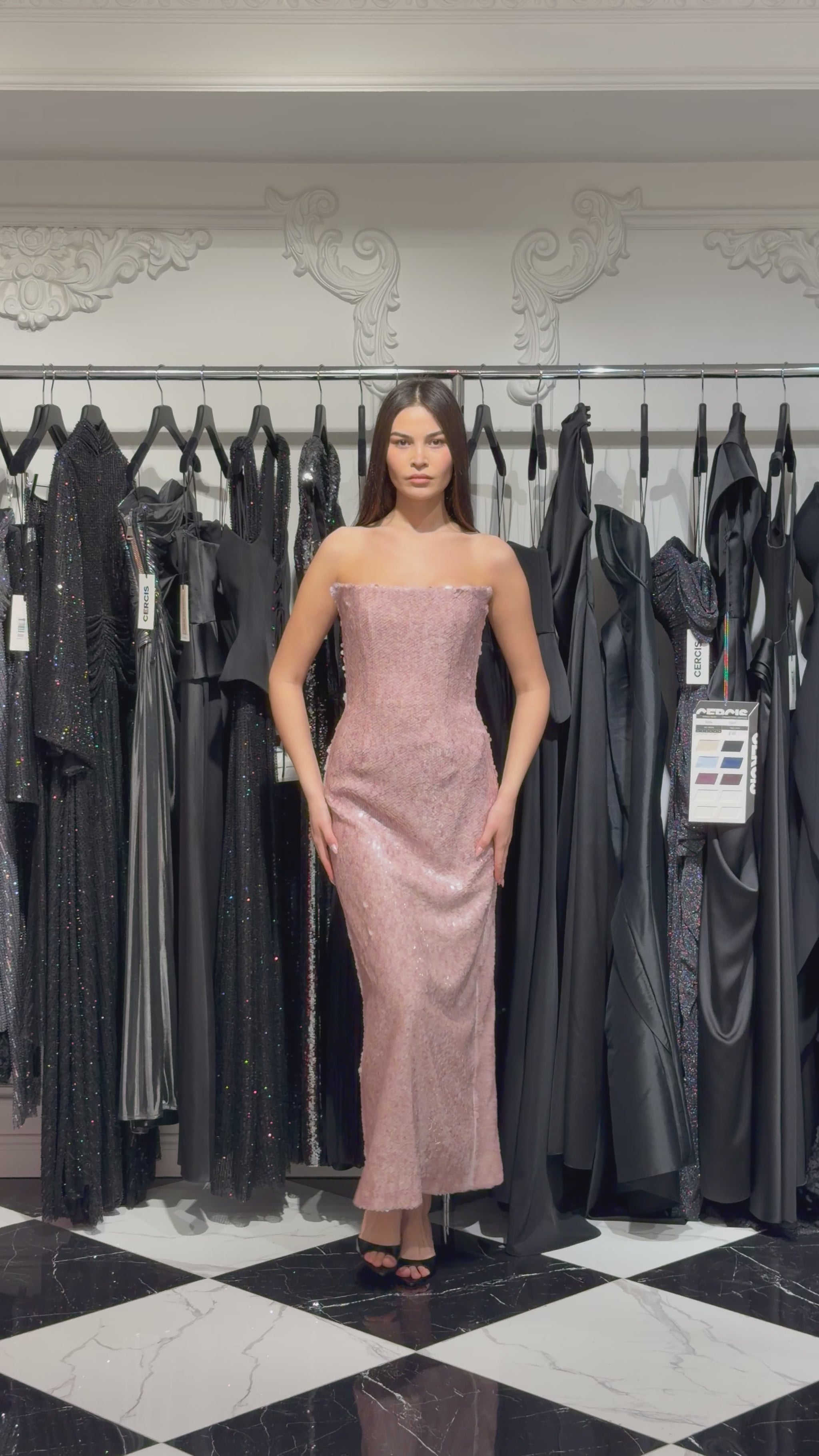 فستان سهرة ترتر فاخر بتصميم مستقيم أنيق وقصة ناعمة تبرز القوام بأسلوب راقٍ وعصري. يتميز بقماش لامع جذاب مناسب للسهرات والمناسبات الرسمية.