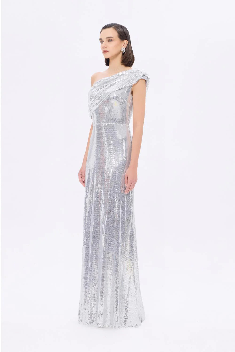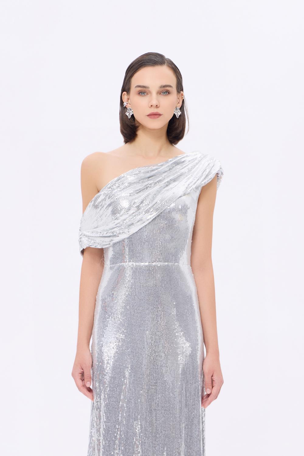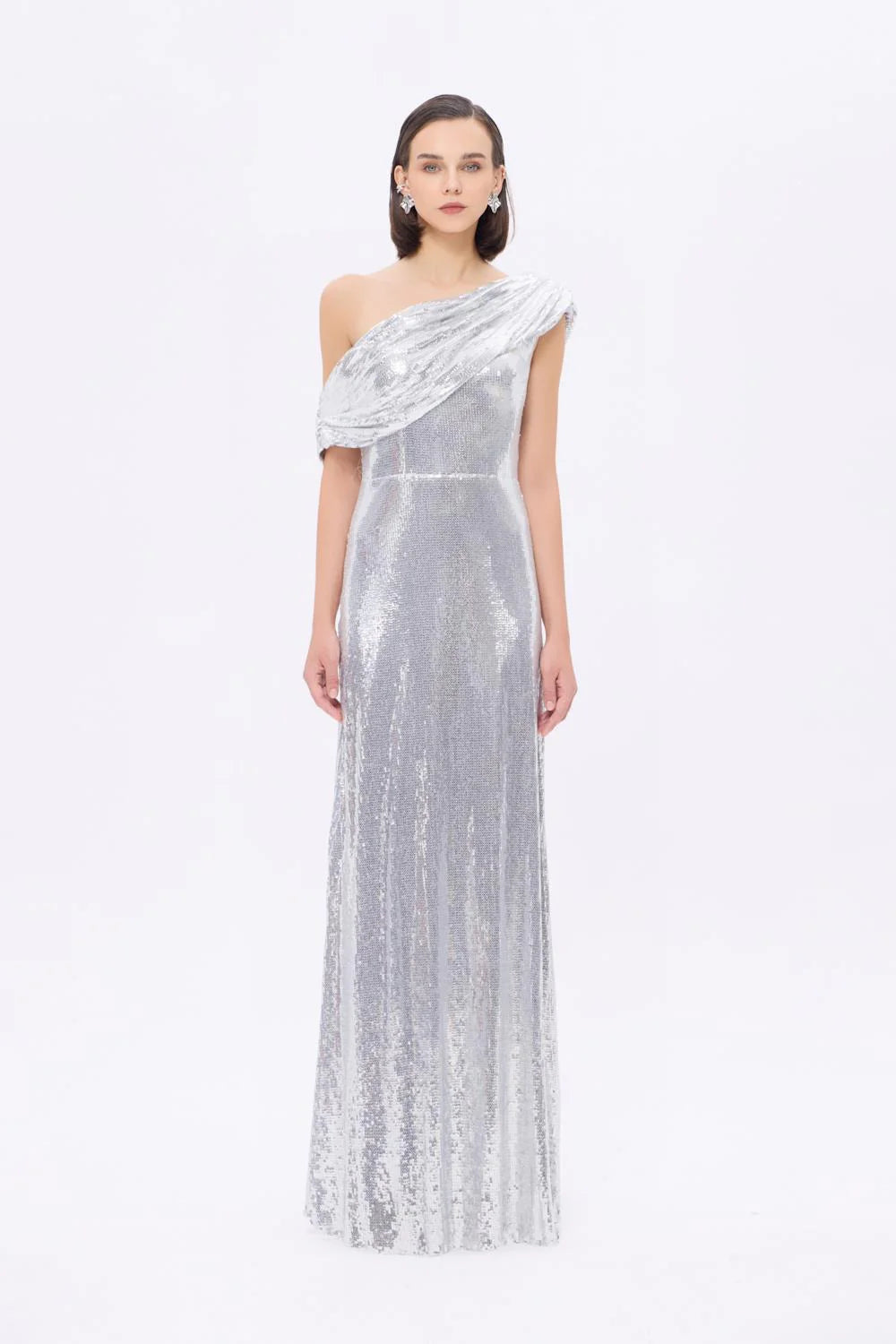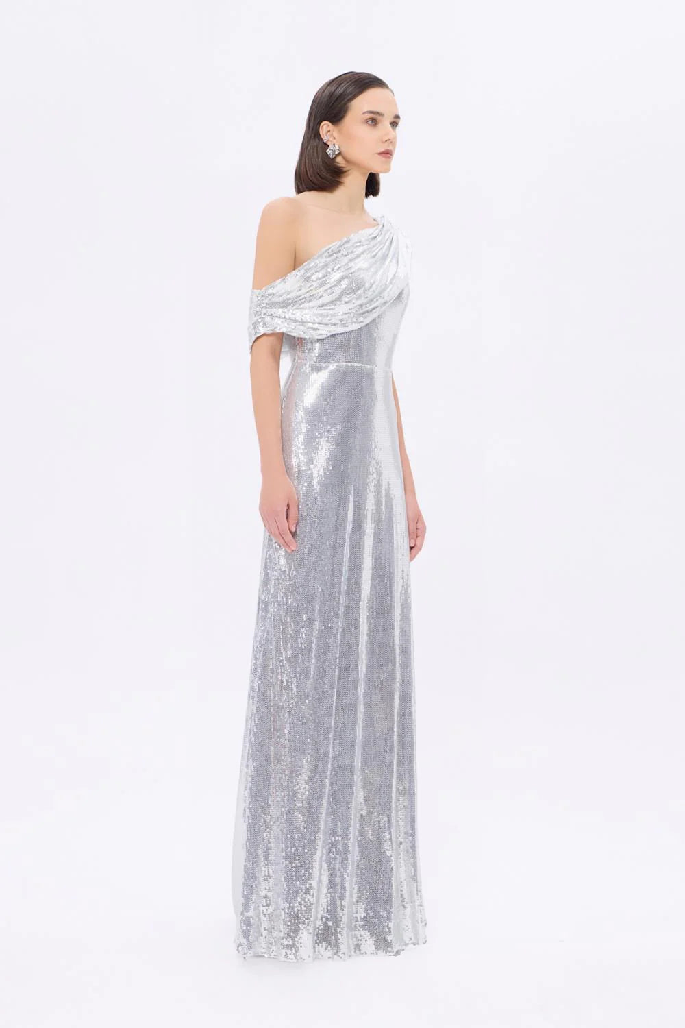 9305C Asimetrik Yaka Uzun Payetli Abiye Elbise