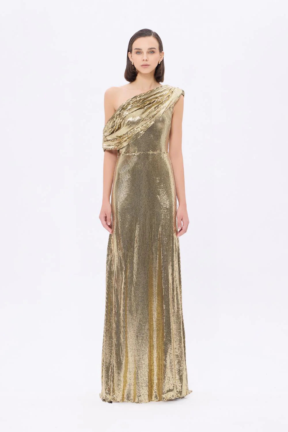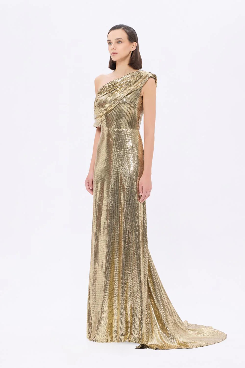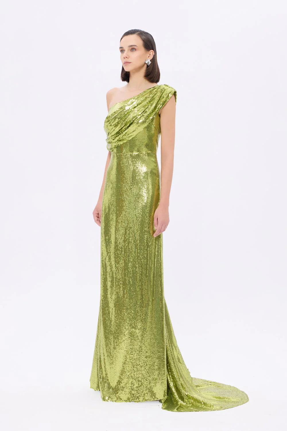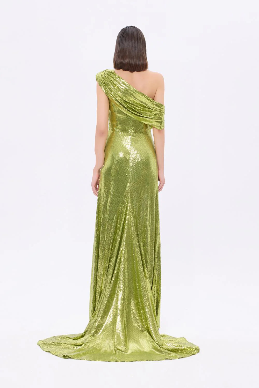 9305C Asimetrik Yaka Uzun Payetli Abiye Elbise