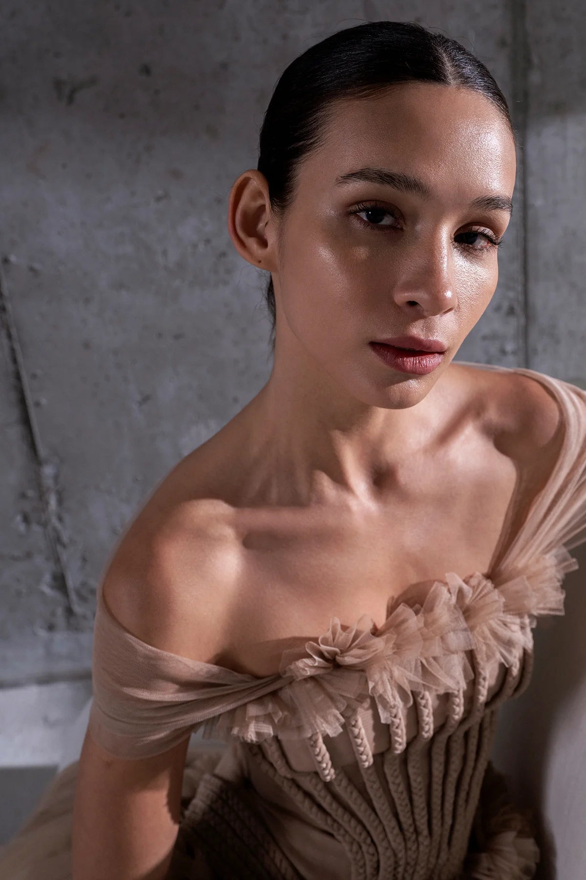 BELİ BÜZGÜ DETAYLI OMUZLARI AÇIK UZUN ABİYE ELBİSE 221