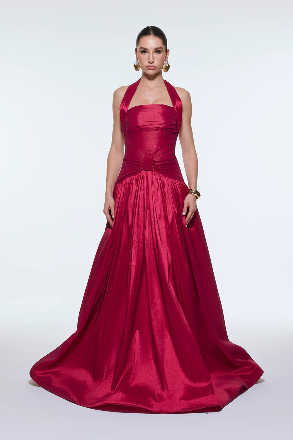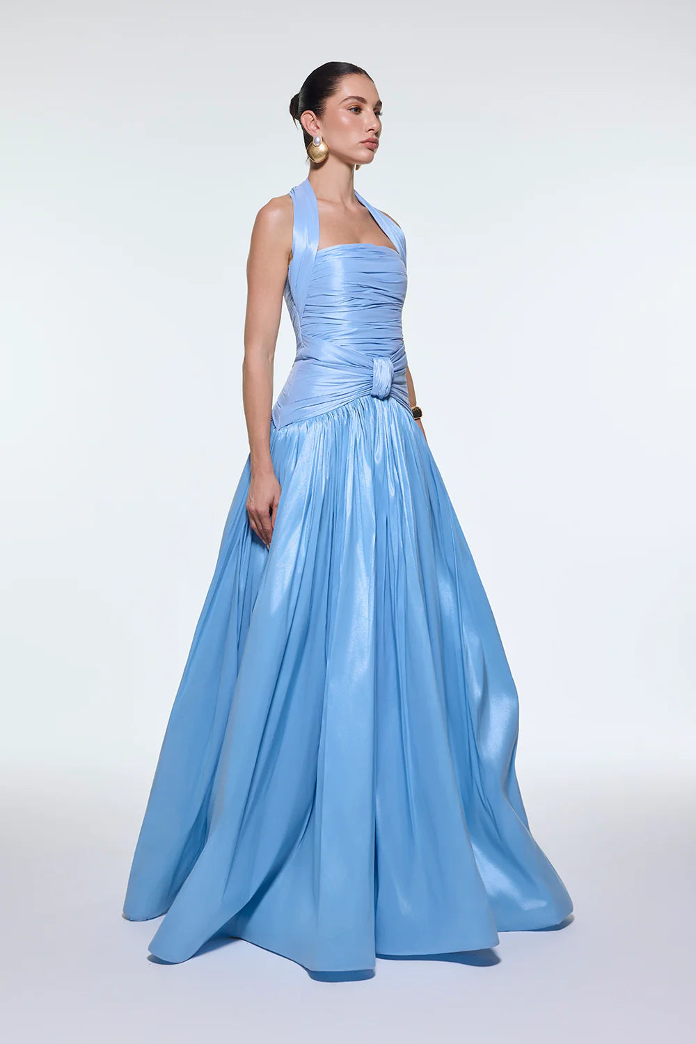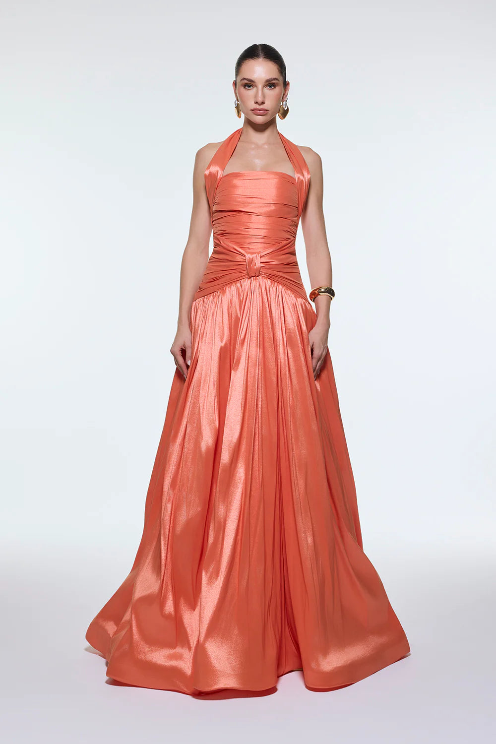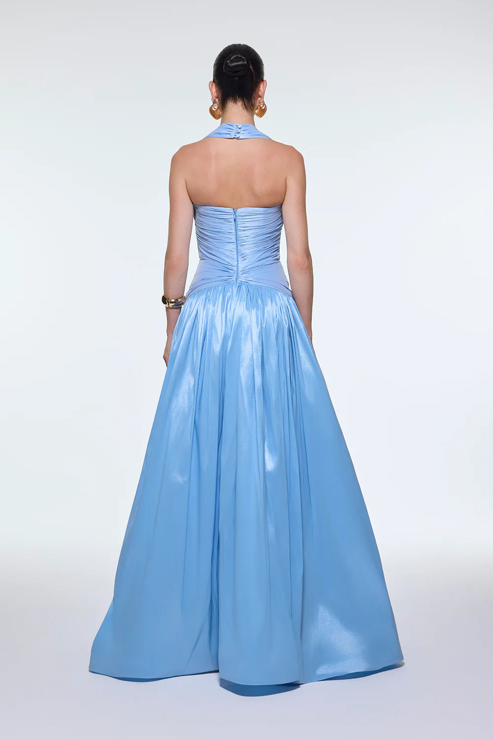 BOYUNDA ASKILI DRAPELİ TAFTA UZUN ABİYE ELBİSE - 9280C