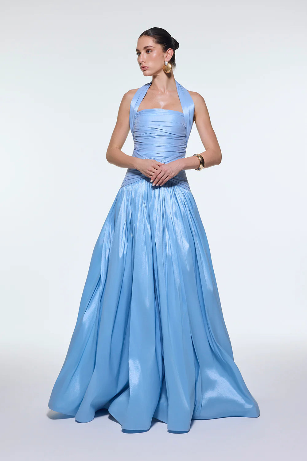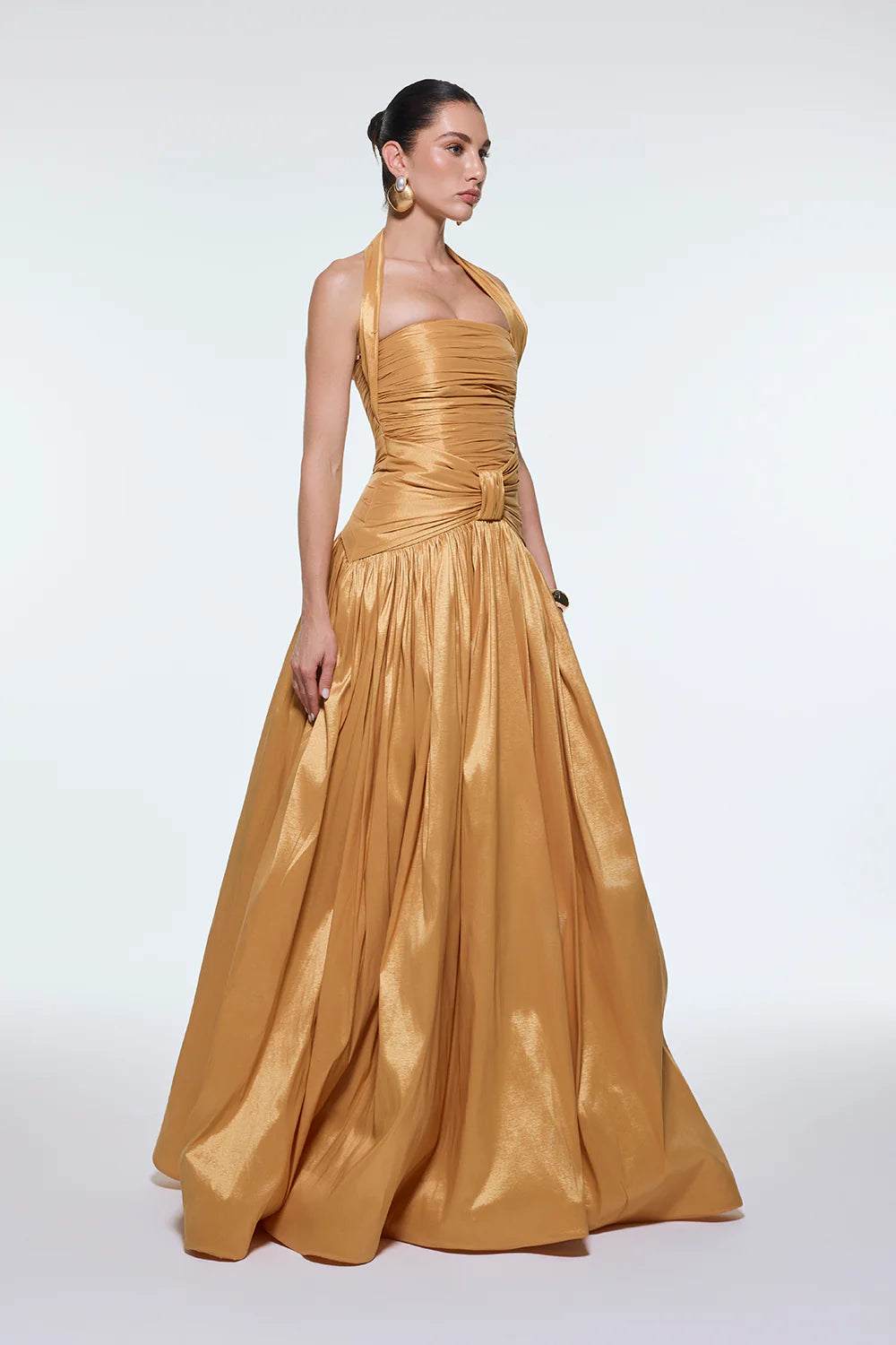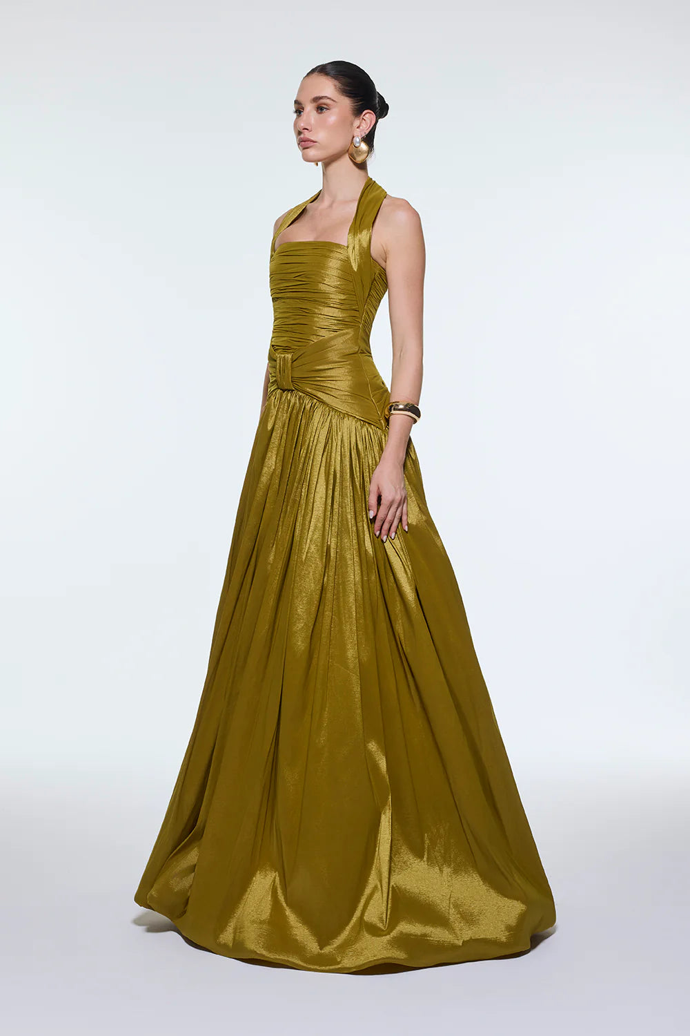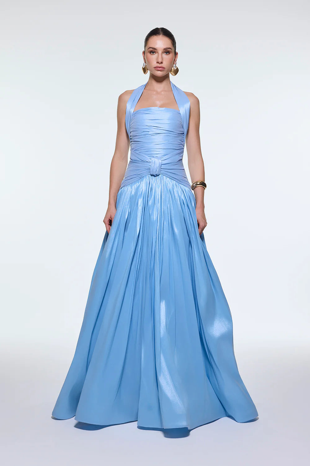BOYUNDA ASKILI DRAPELİ TAFTA UZUN ABİYE ELBİSE - 9280C