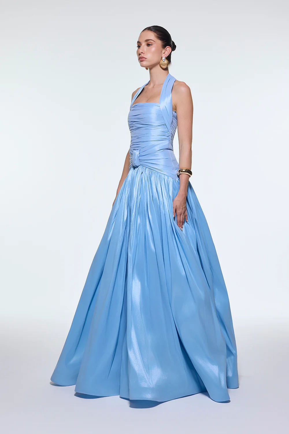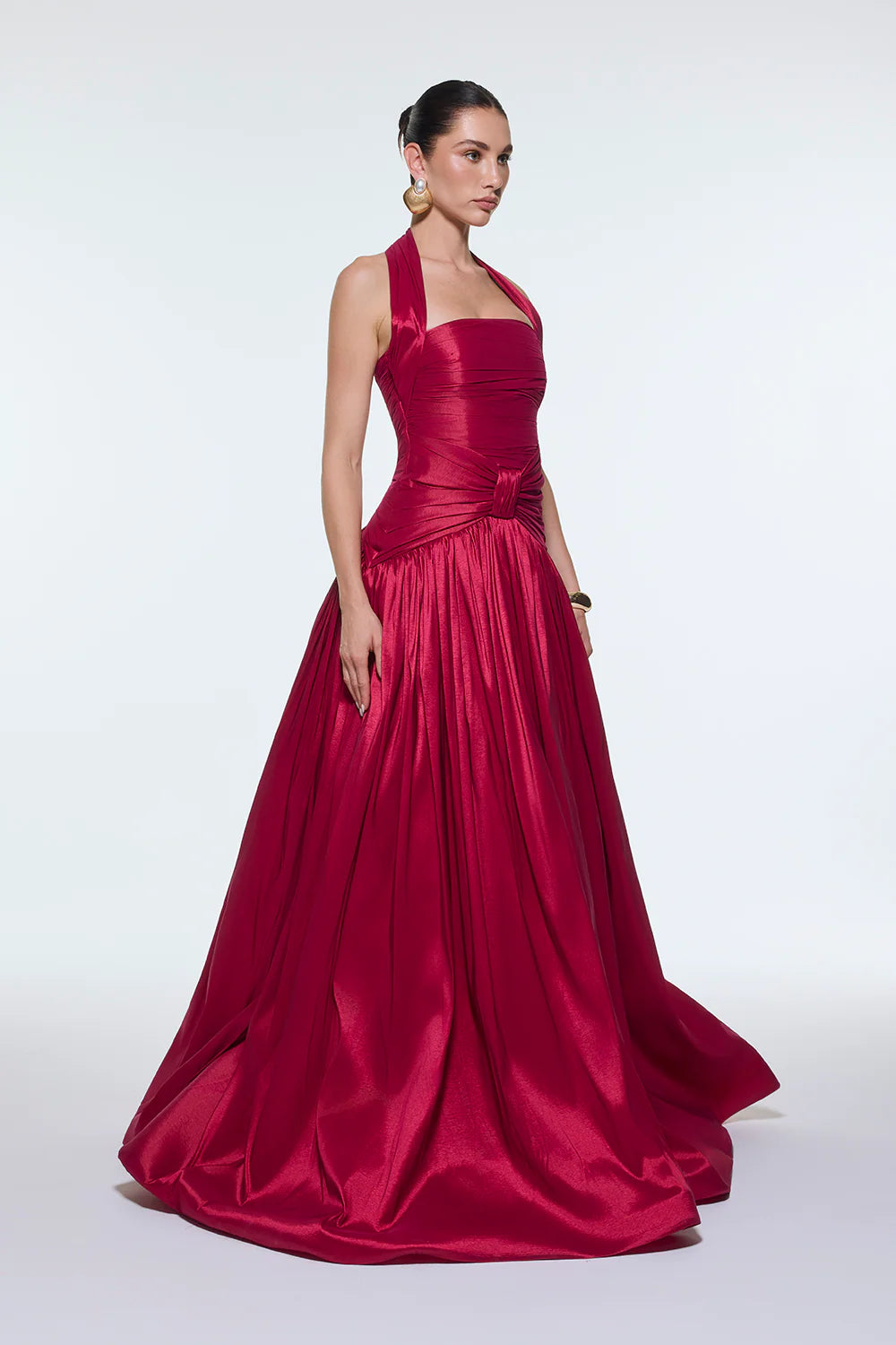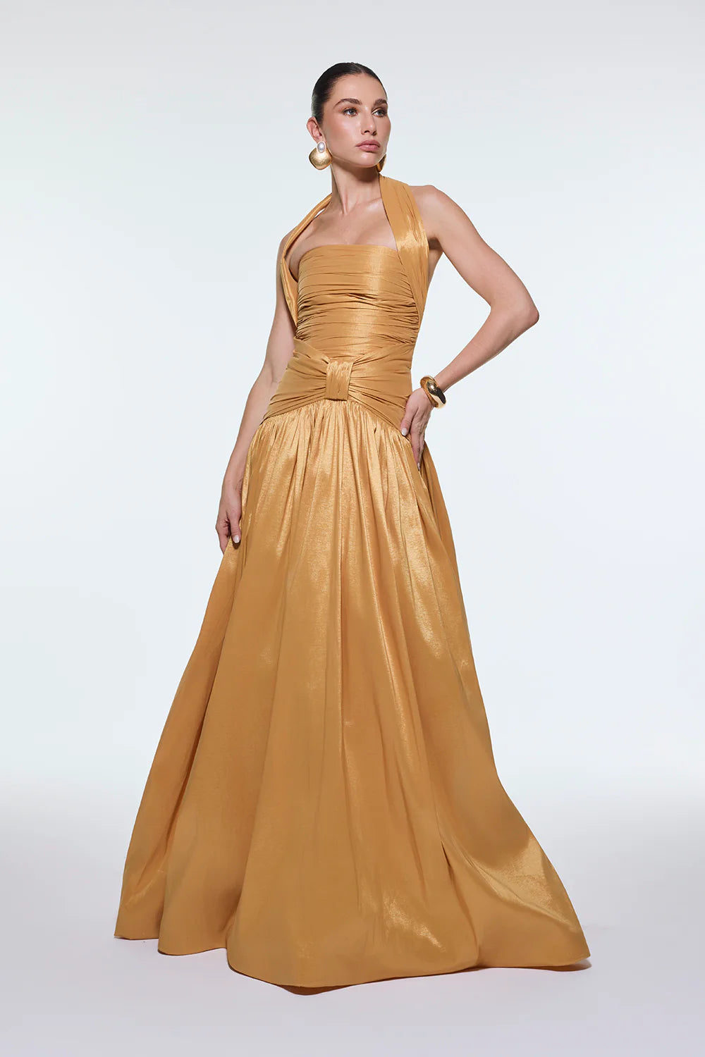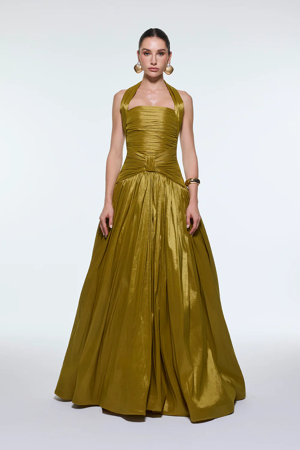 BOYUNDA ASKILI DRAPELİ TAFTA UZUN ABİYE ELBİSE - 9280C