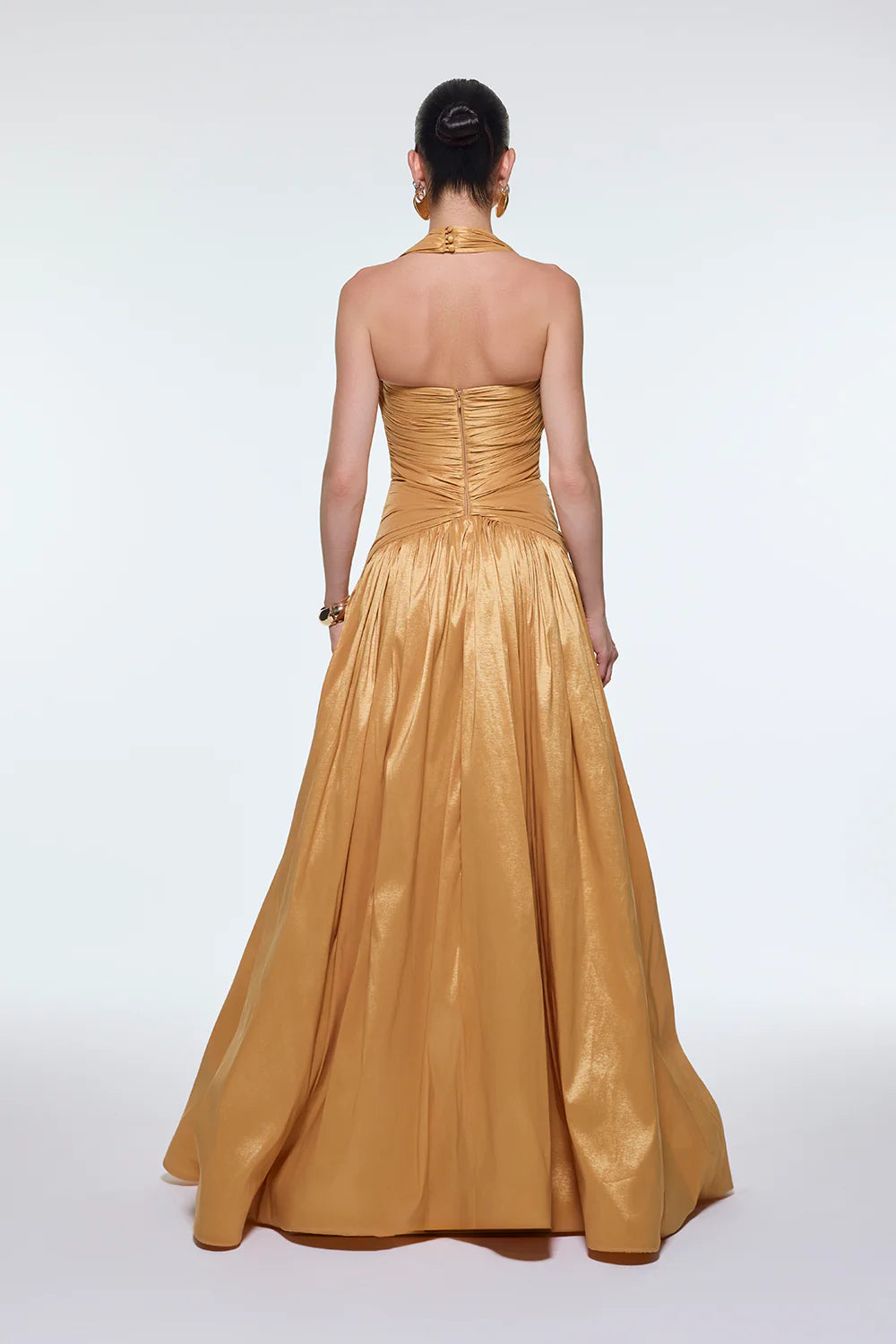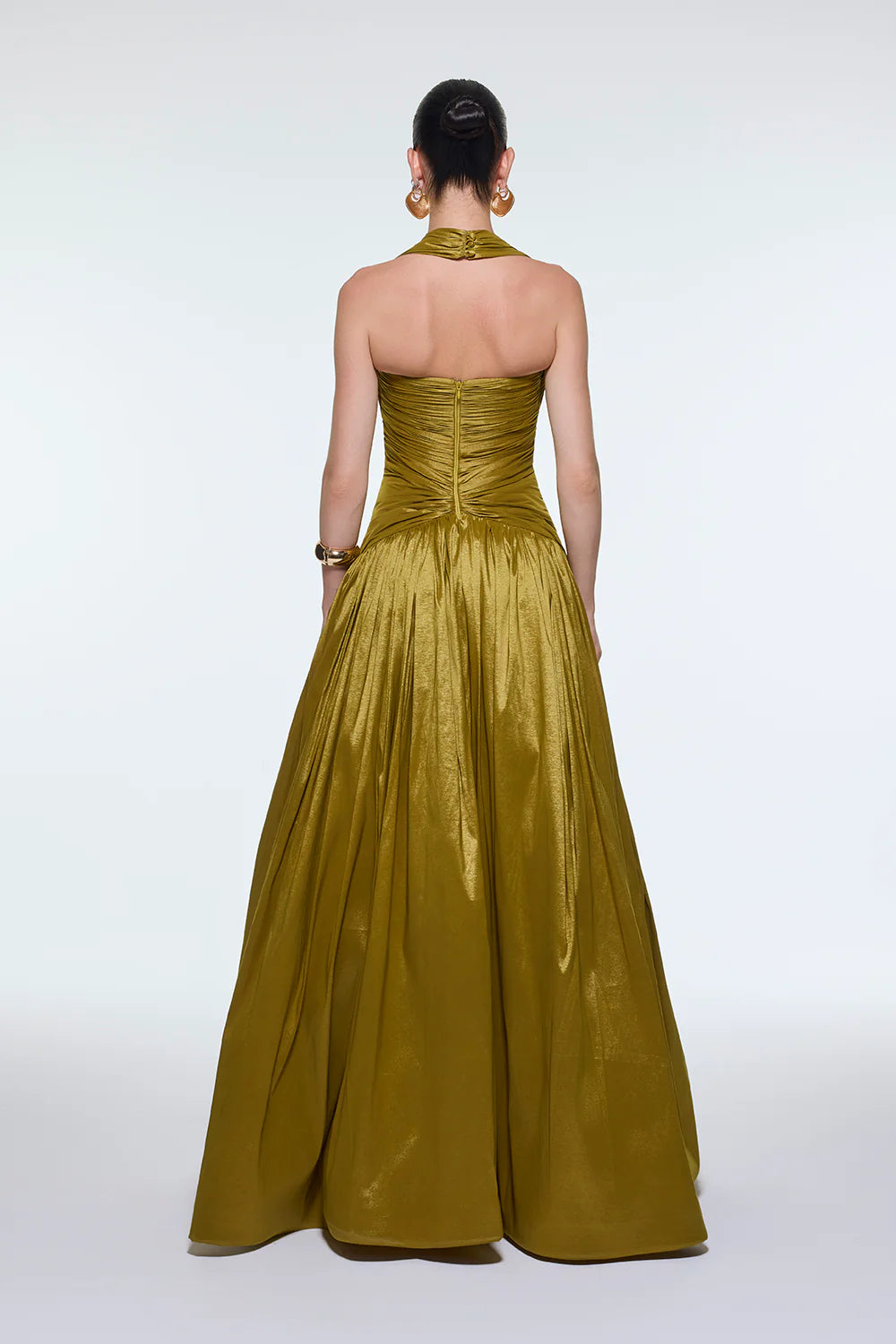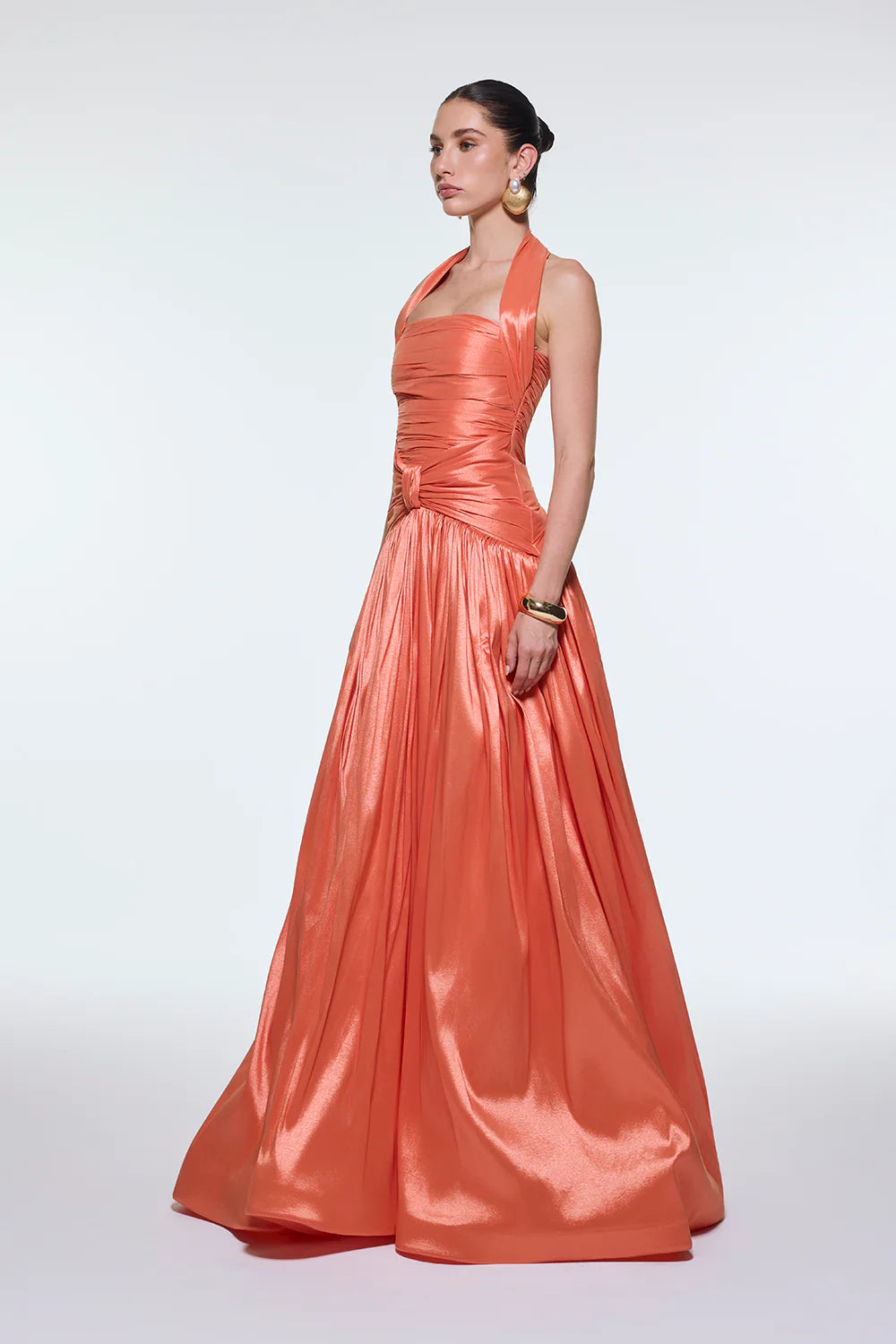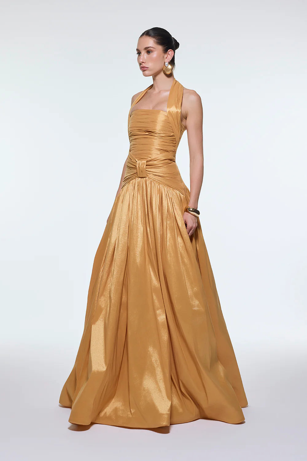BOYUNDA ASKILI DRAPELİ TAFTA UZUN ABİYE ELBİSE - 9280C