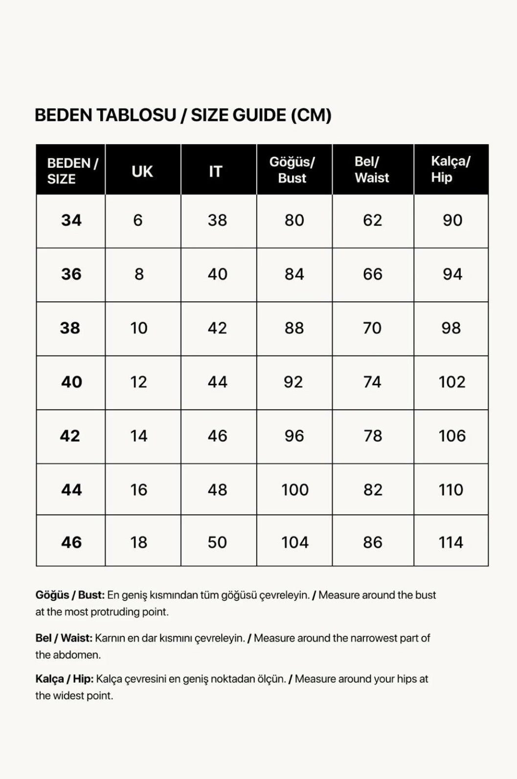 Manken ölçüleri: Boy 178 / Göğüs 80 / Bel 60 / Basen 90