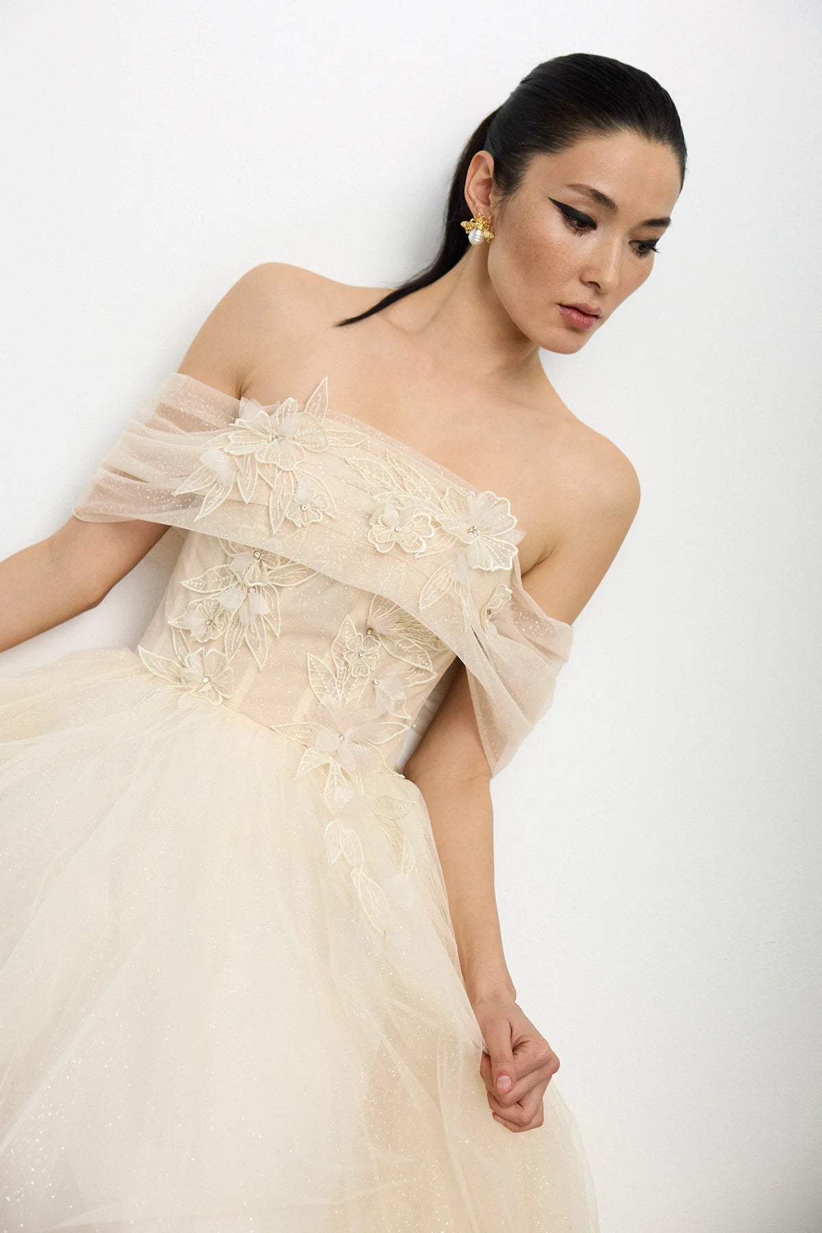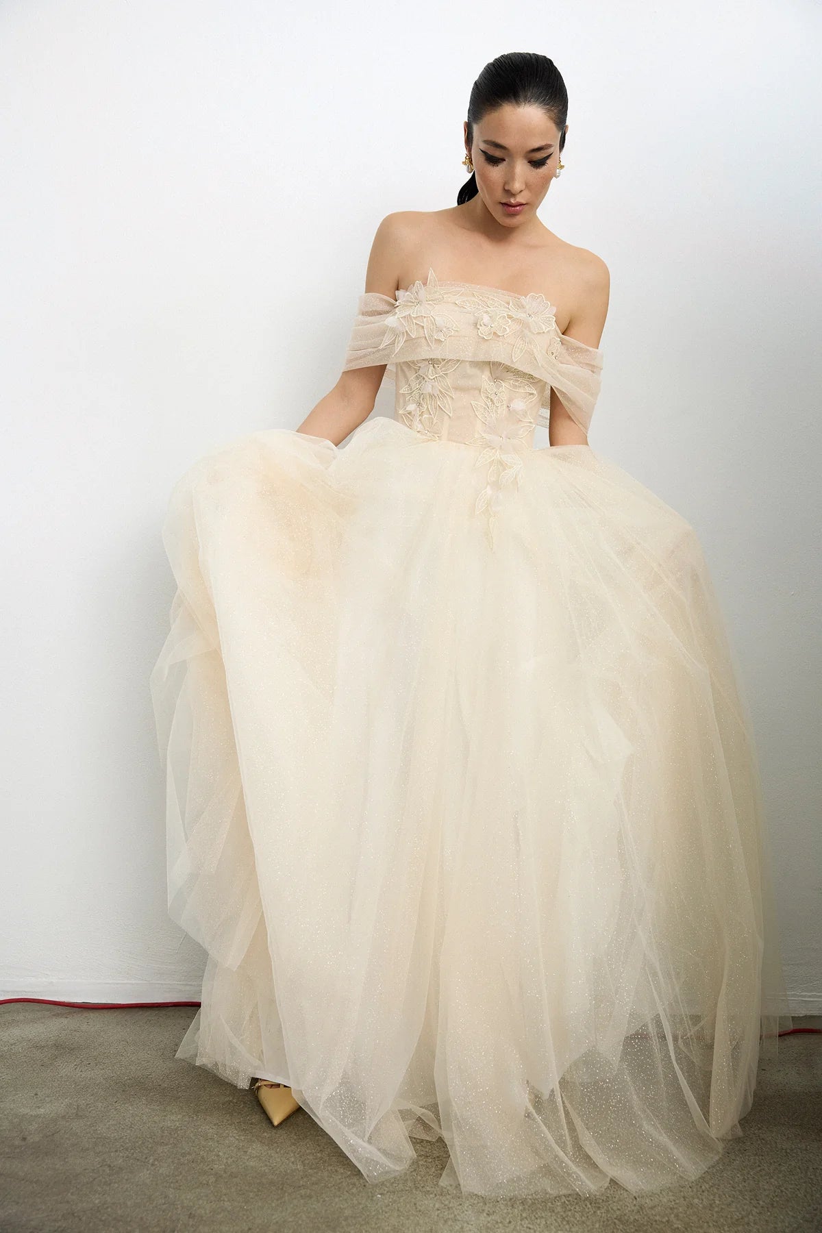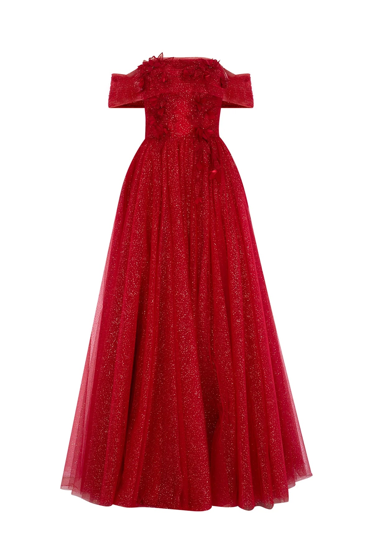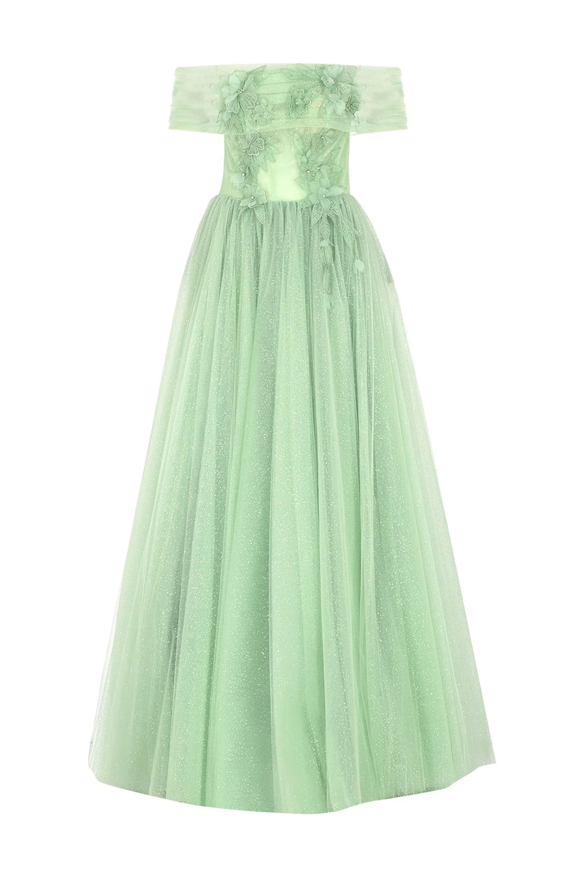 Çiçek Aplikeli Simli Tül Etek Detaylı Uzun Abiye Elbise 2239