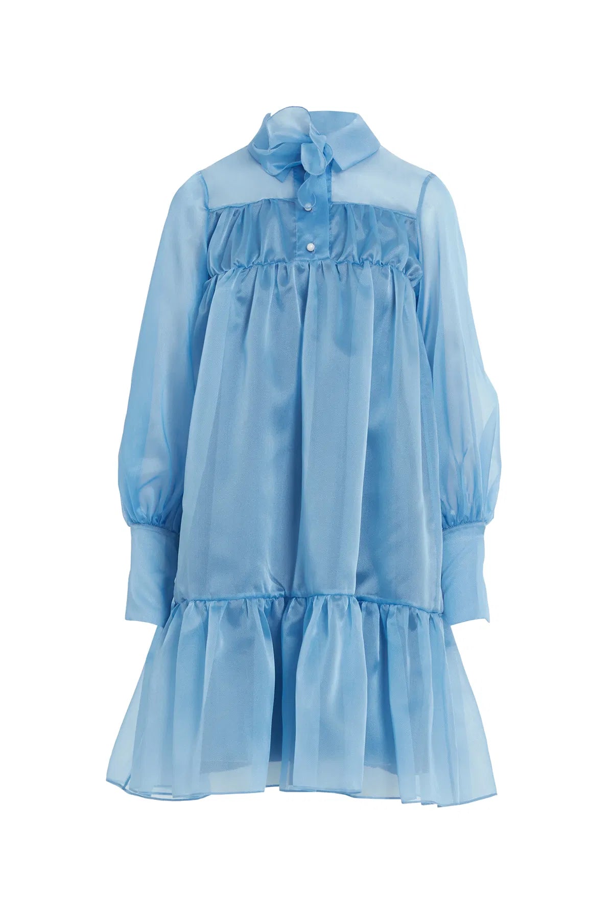 Çıkarılabilir Çiçek Detaylı, Etek Ucu Büzgülü Transparan Mavi Elbise