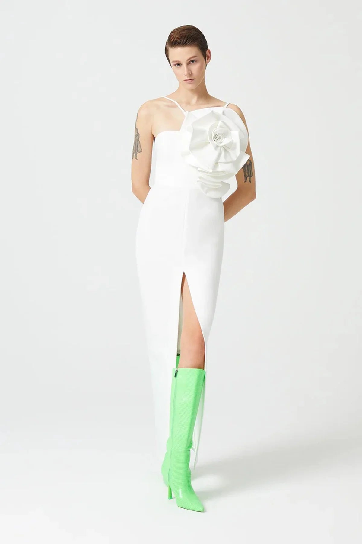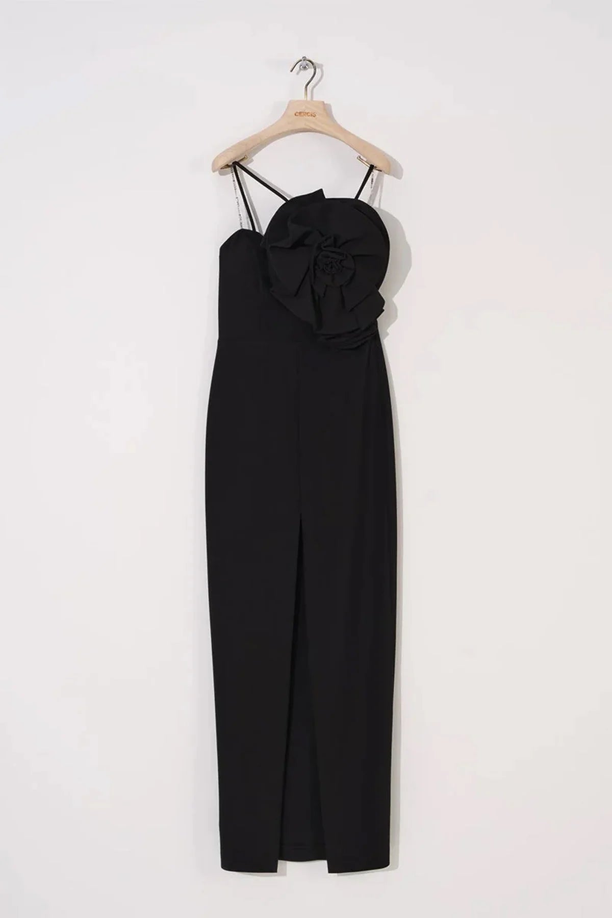 DRAPE GÜL DETAYLI ÖNDEN YIRTMAÇLI ELBİSE