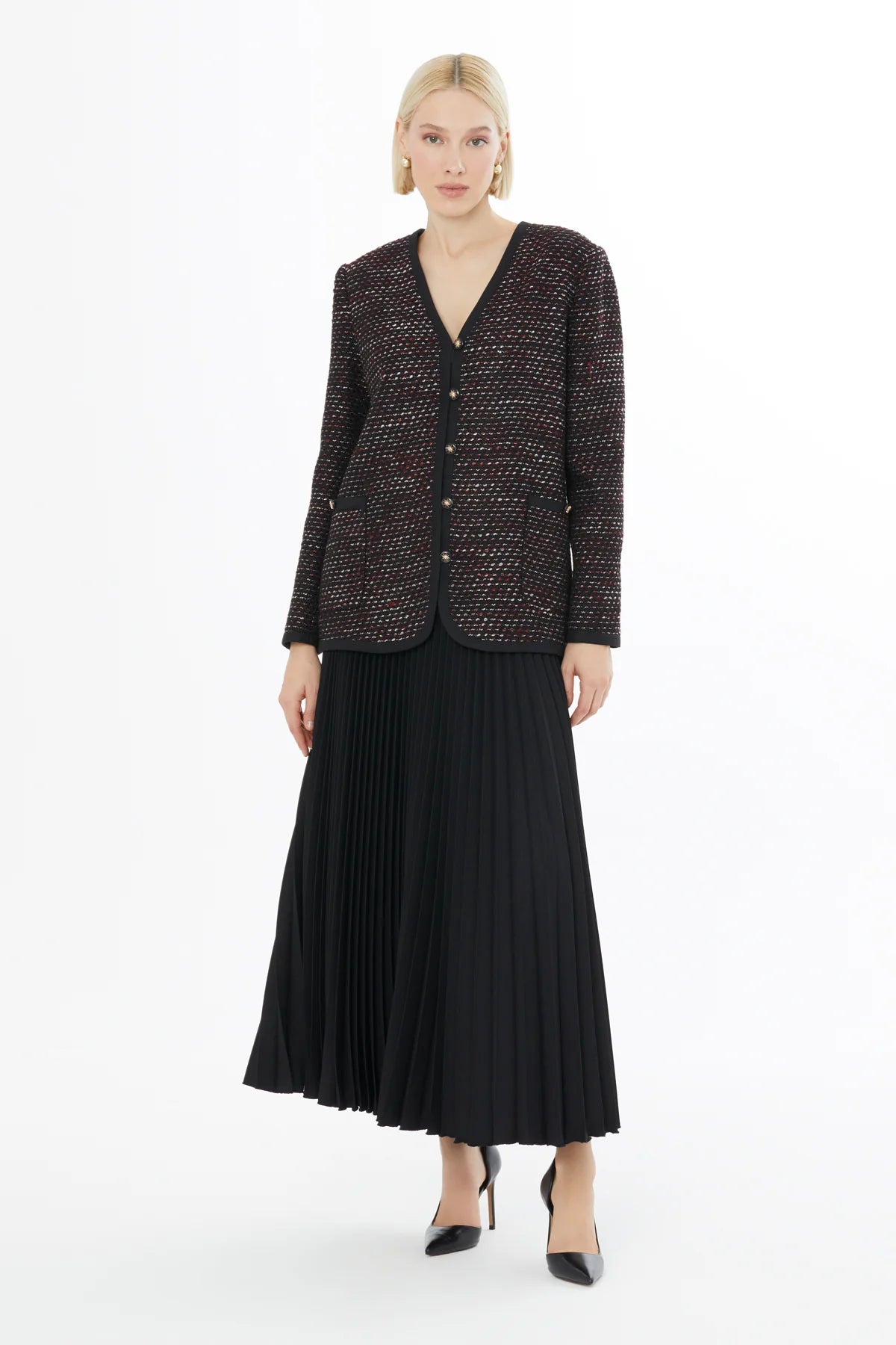 Düğme Kapamalı Ceket Ve Piliseli Etek Takım