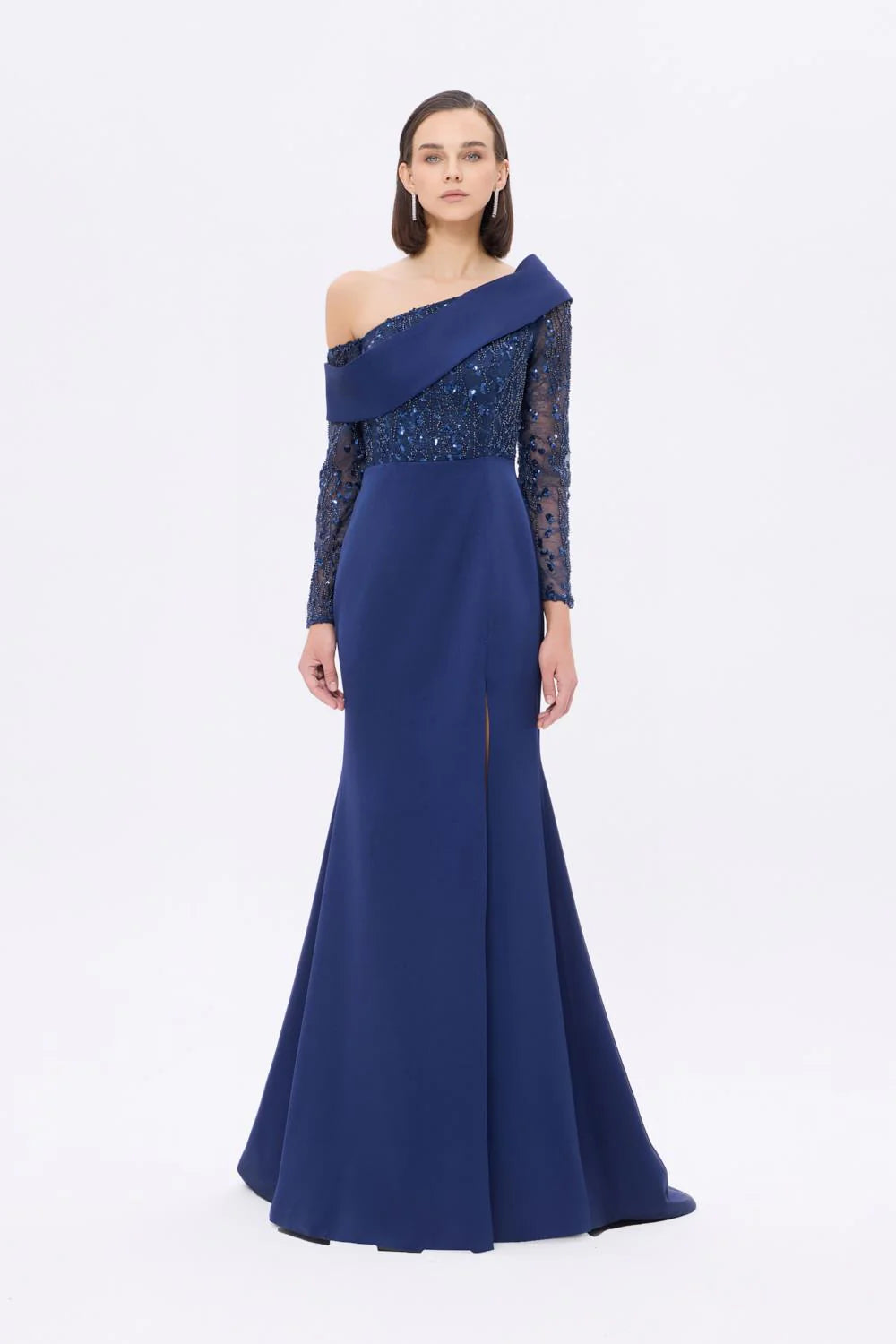 İŞLEME DETAYLI YIRTMAÇLI UZUN ABİYE ELBİSE - 9342C