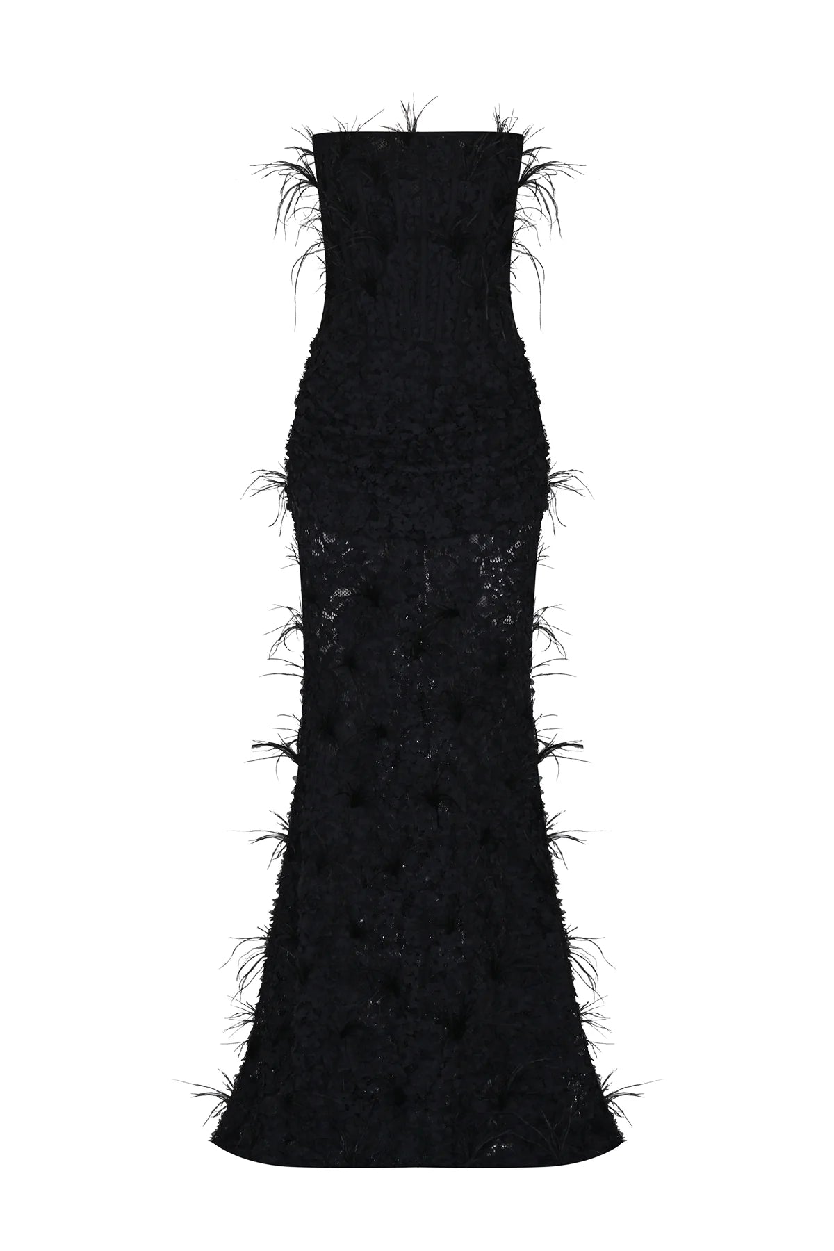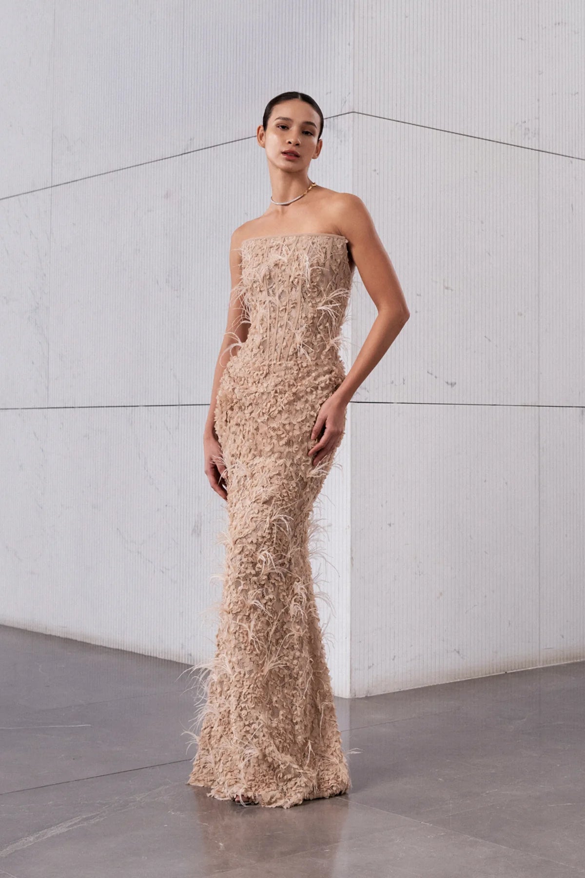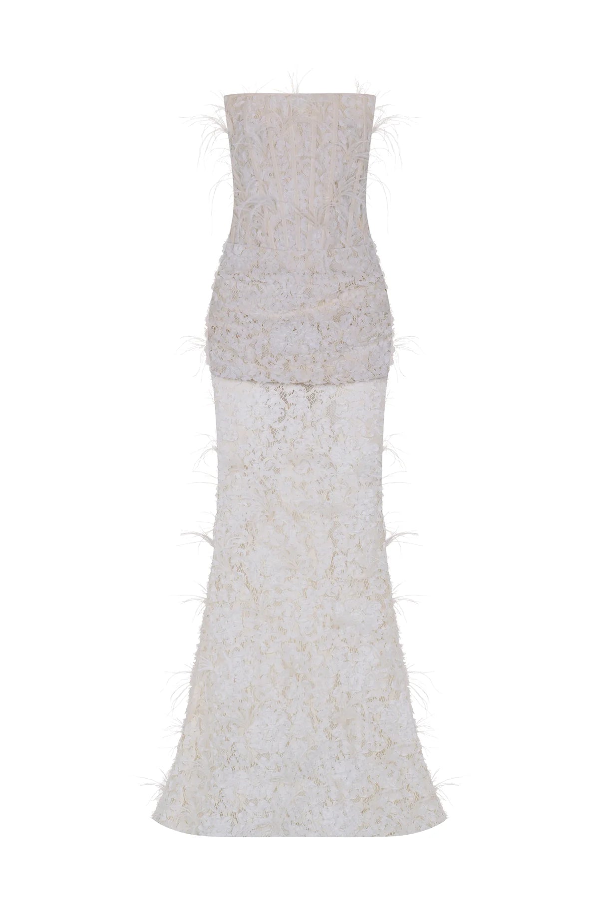 KORSAJLI TÜY DETAYLI STRAPLEZ UZUN ABİYE ELBİSE