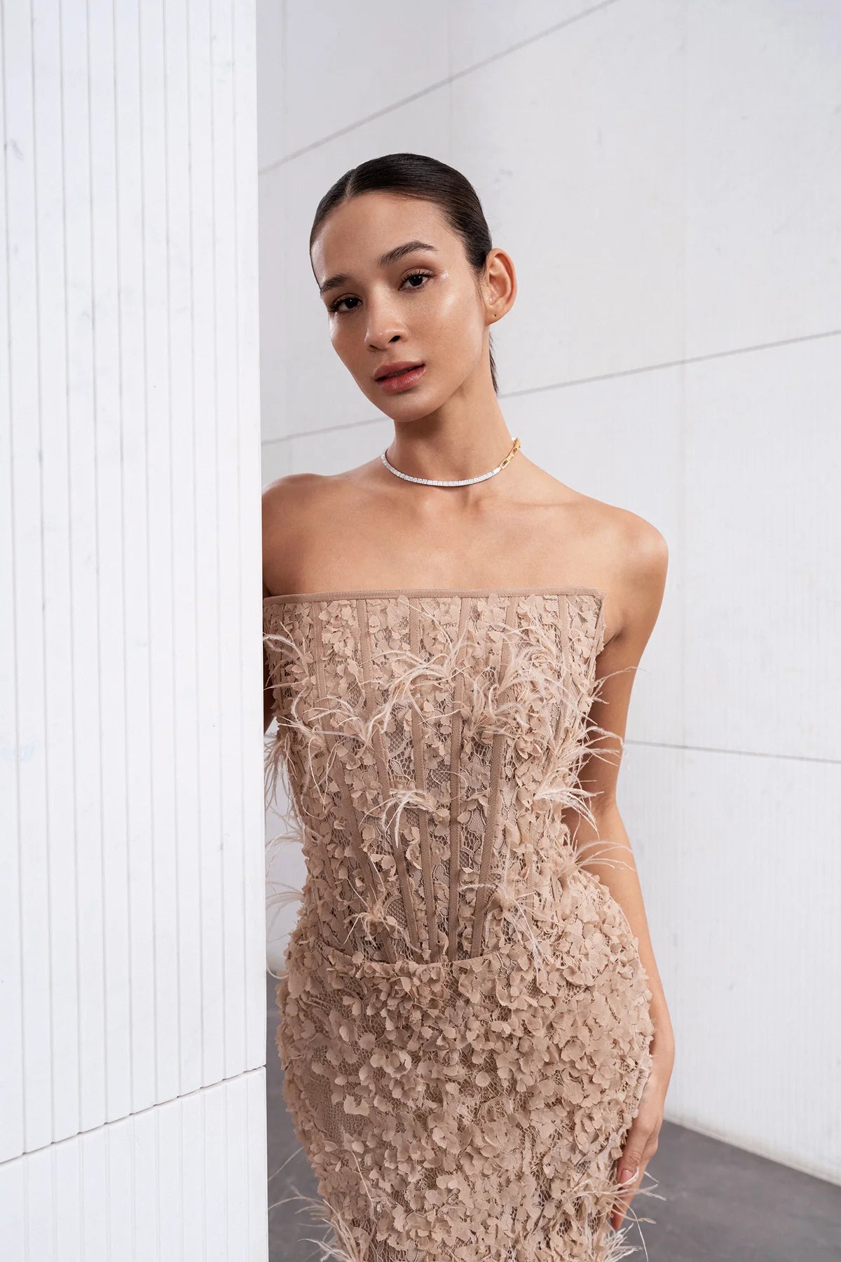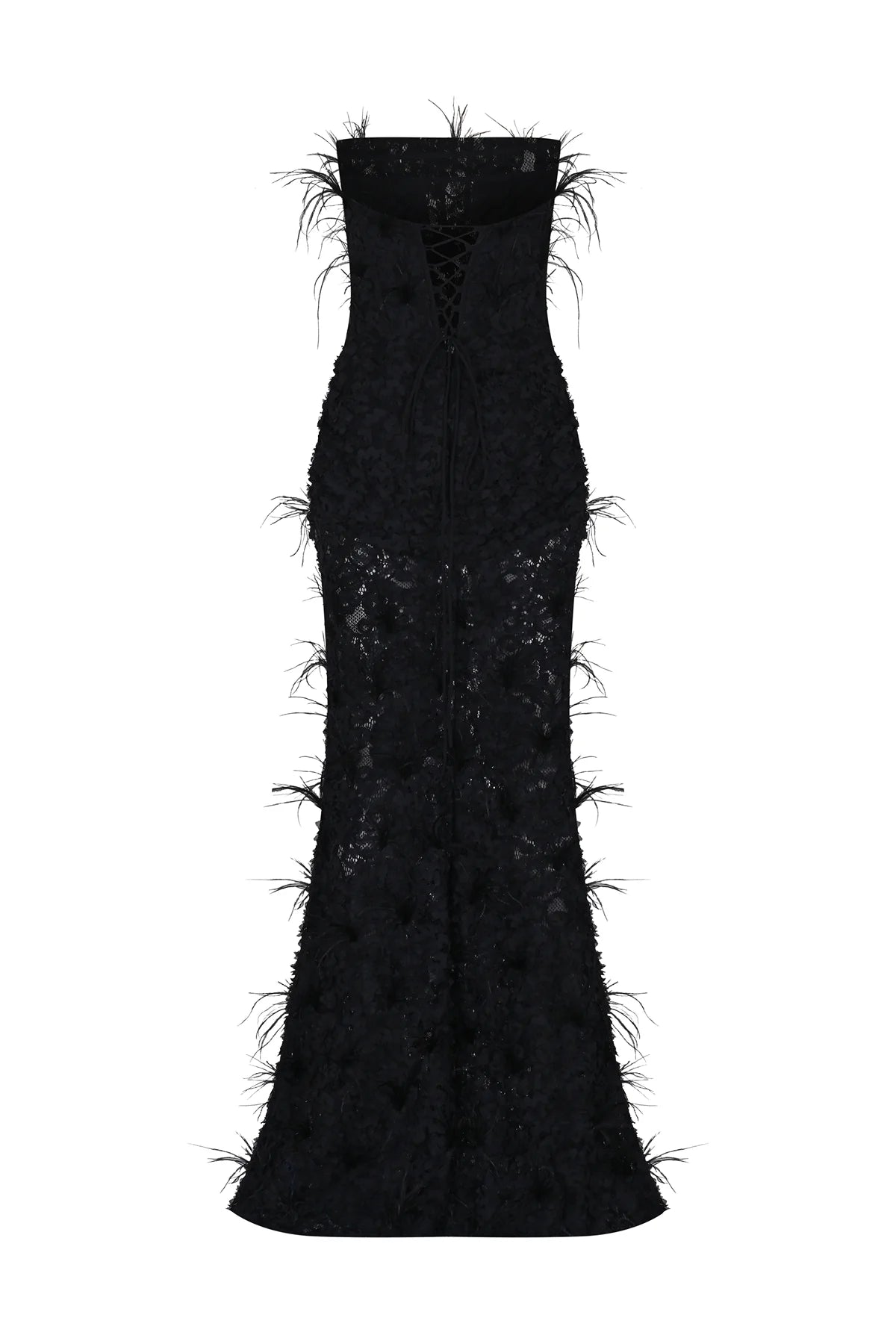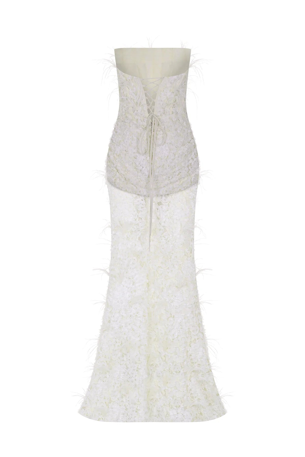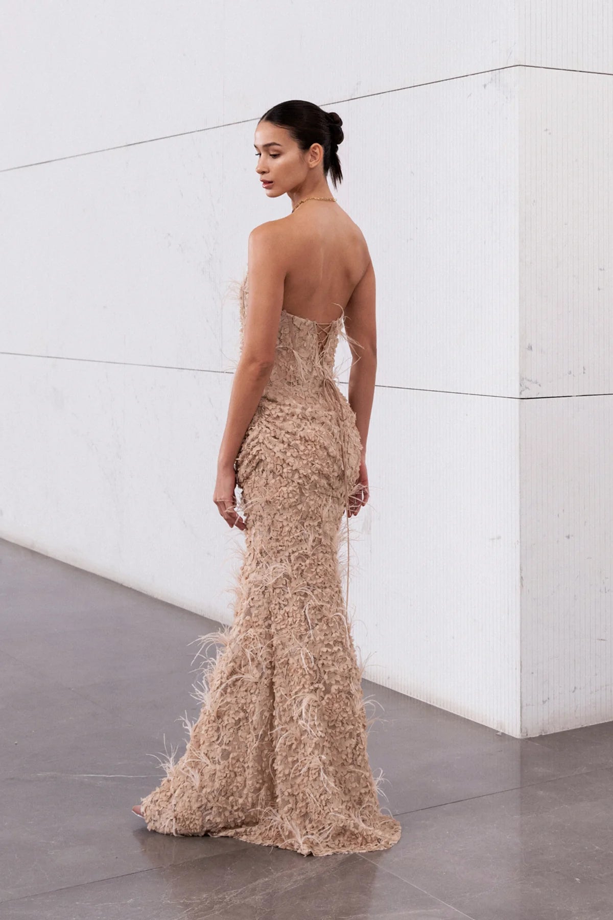 KORSAJLI TÜY DETAYLI STRAPLEZ UZUN ABİYE ELBİSE