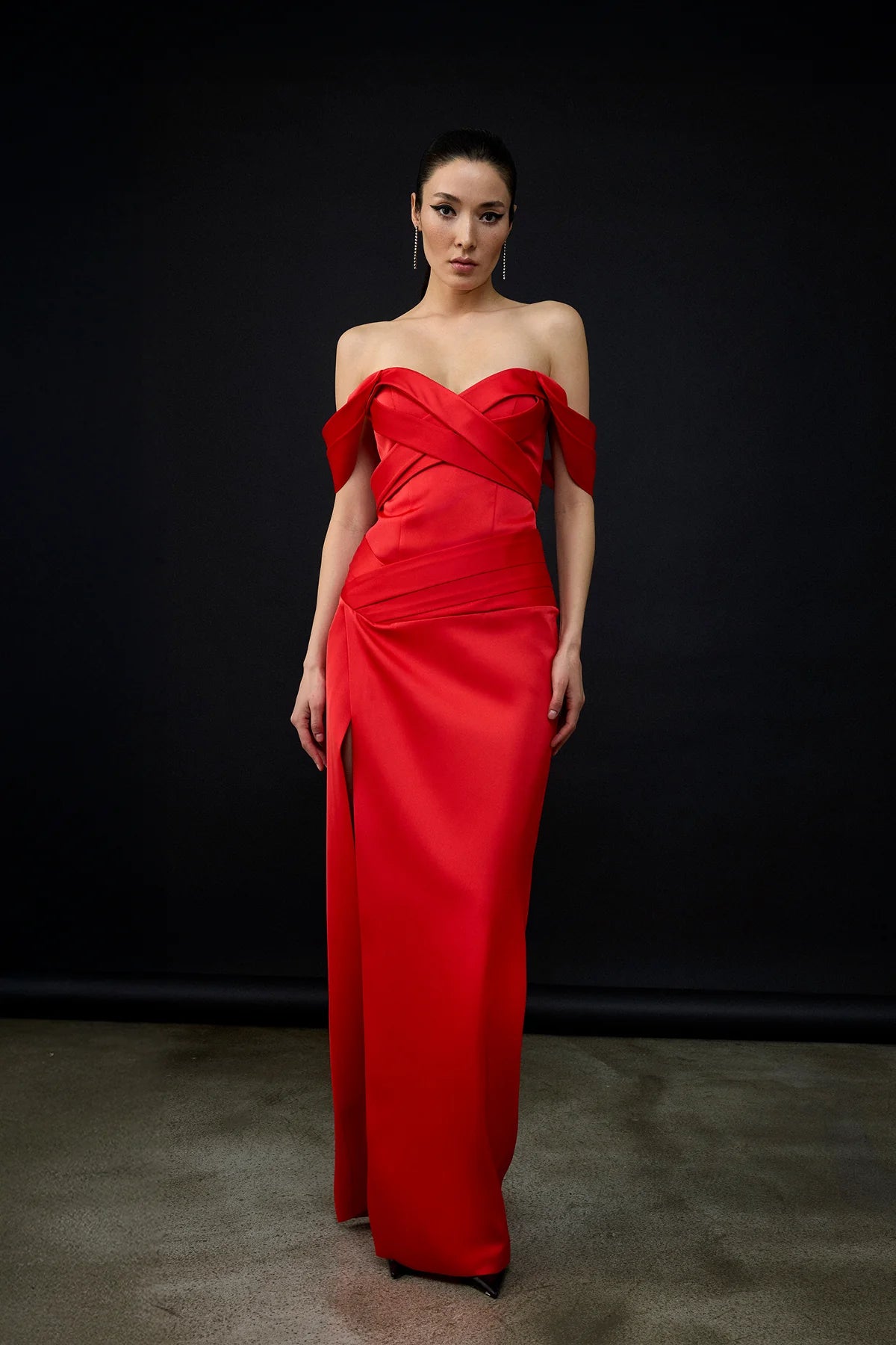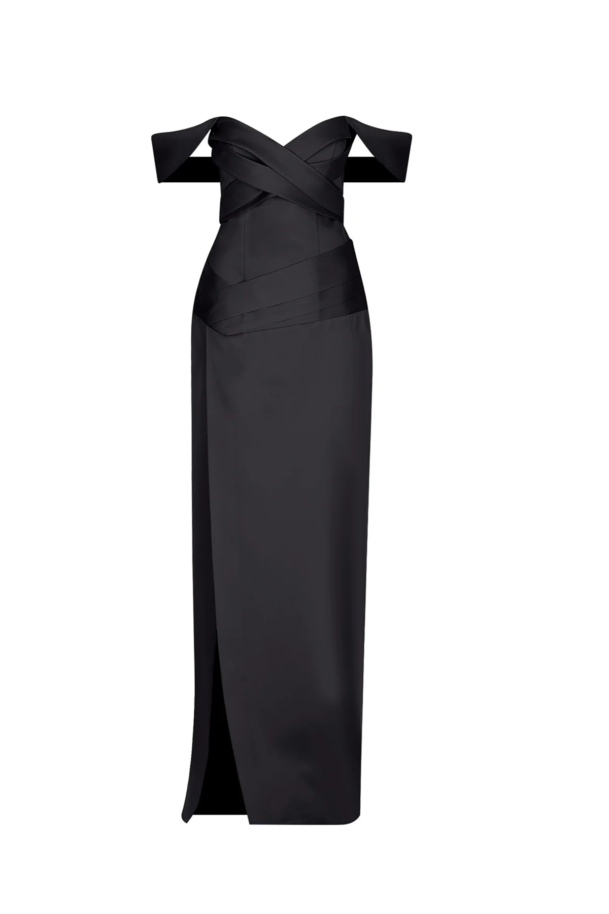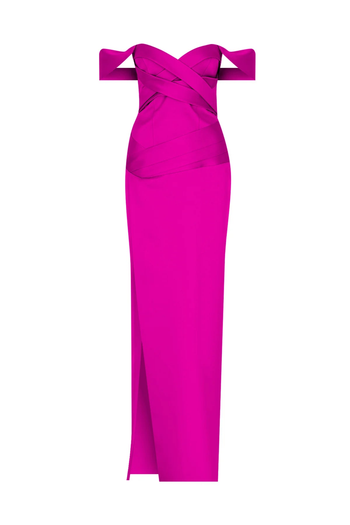 OMUZ AÇIK ÇAPRAZ DRAPELİ YIRTMAÇ DETAYLI UZUN ABİYE ELBİSE 2256