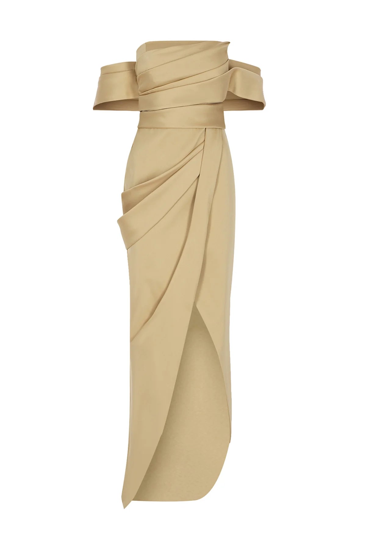 OMUZ AÇIK DRAPELİ YIRTMAÇ DETAYLI UZUN ABİYE ELBİSE
