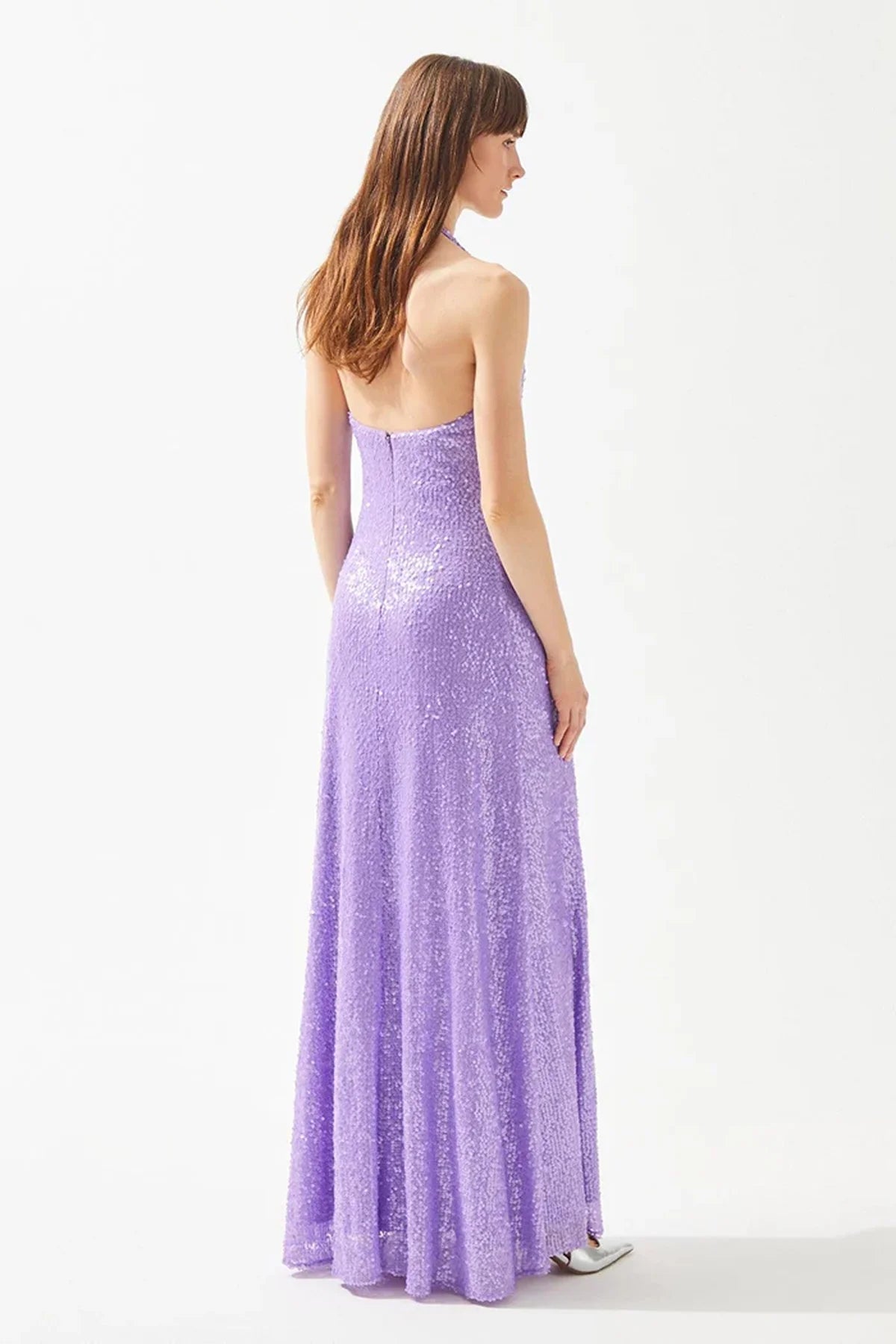 - V yaka, önü aksesuar toka ve büzgü detaylı, arka orta gizli fermuarlı payet kumaş elbise.