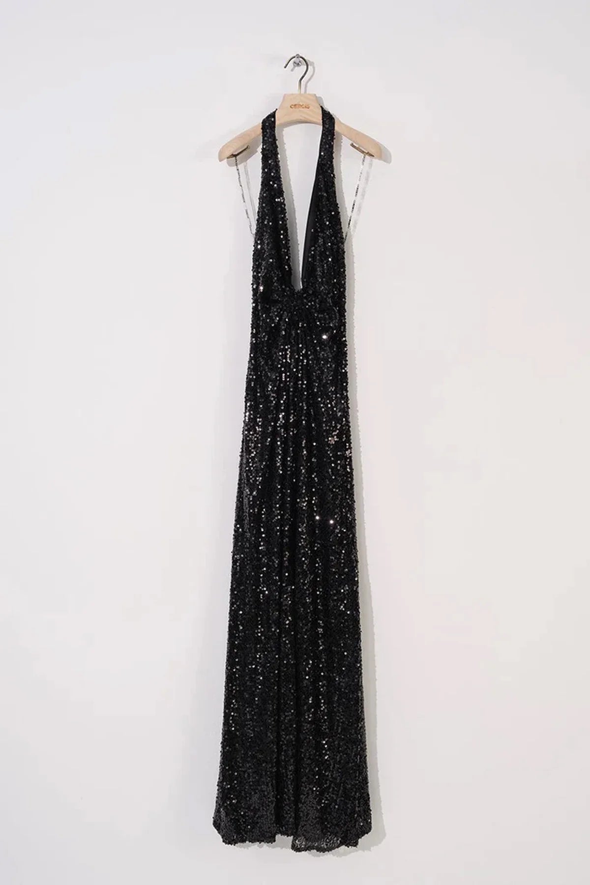 PAYETLİ DERİN V YAKA BOYUNDAN ASKILI UZUN ELBİSE