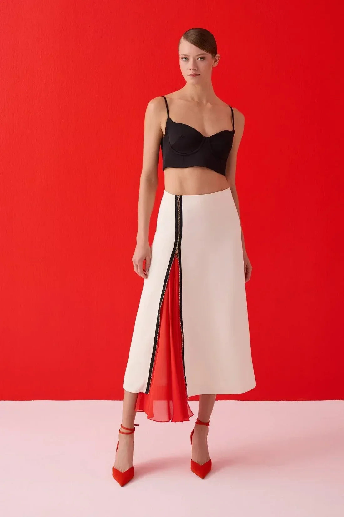 تنورة بتصميم عصري تجمع بين الشيفون الناعم وتفصيل السحاب الجانبي لمسة جريئة وأنيقة في نفس الوقت.