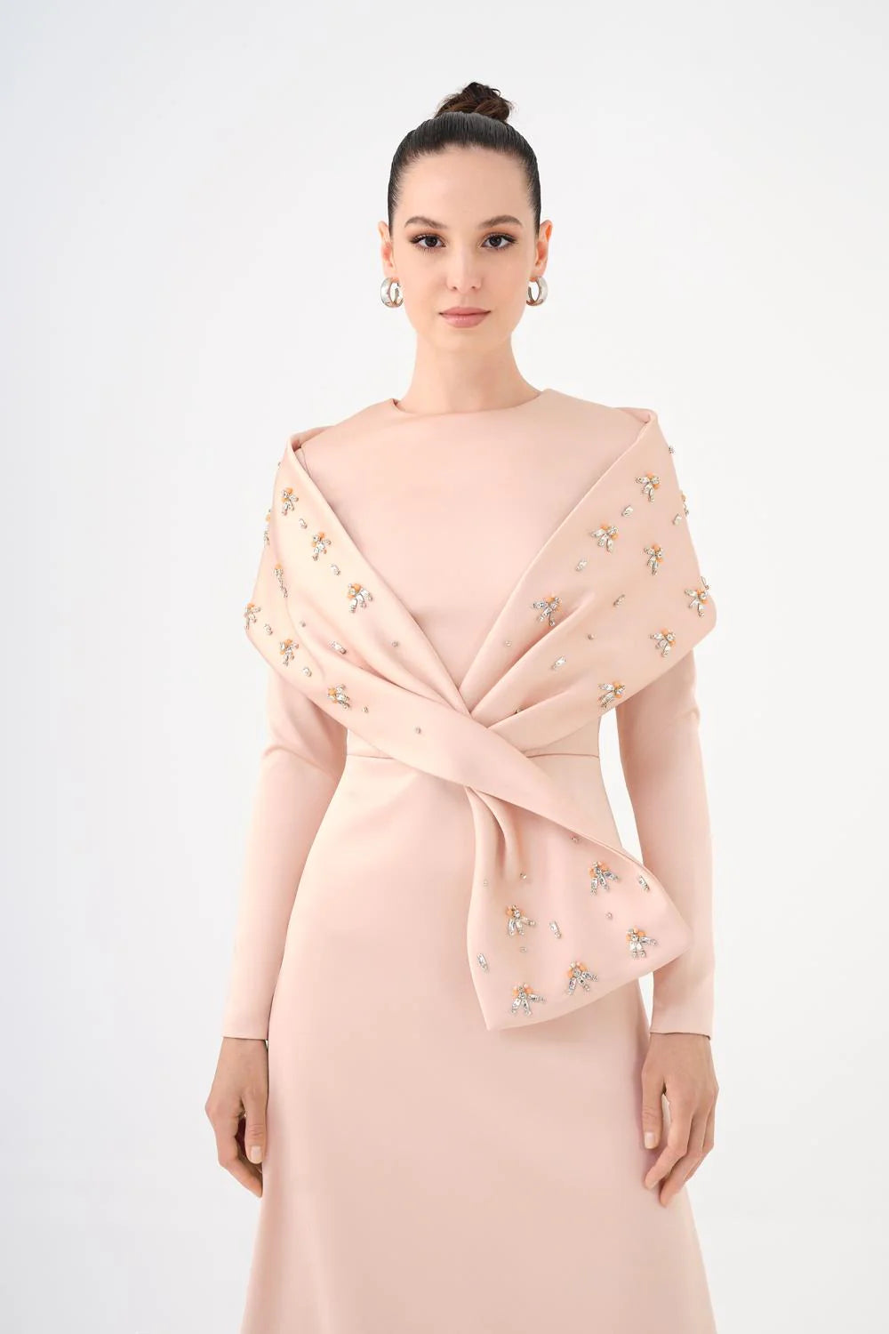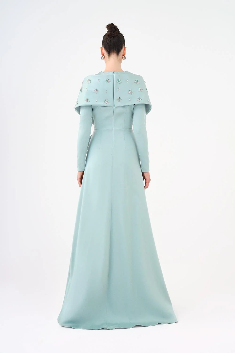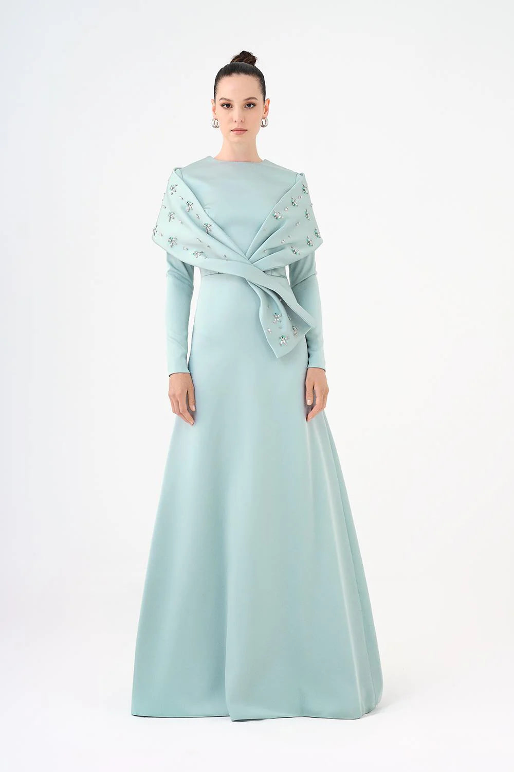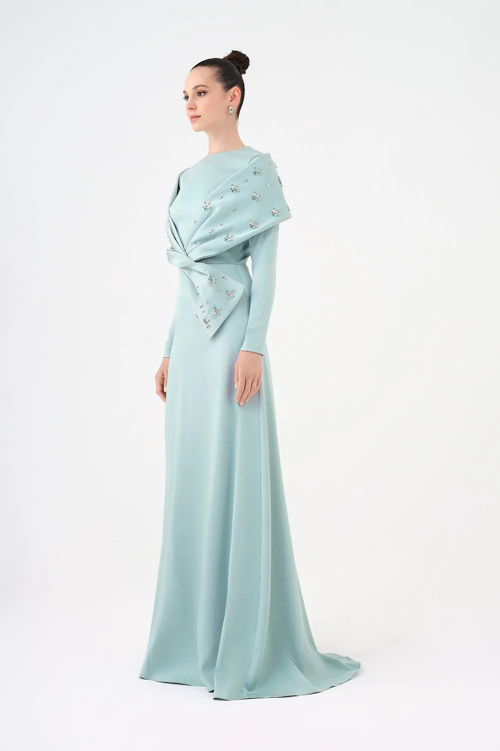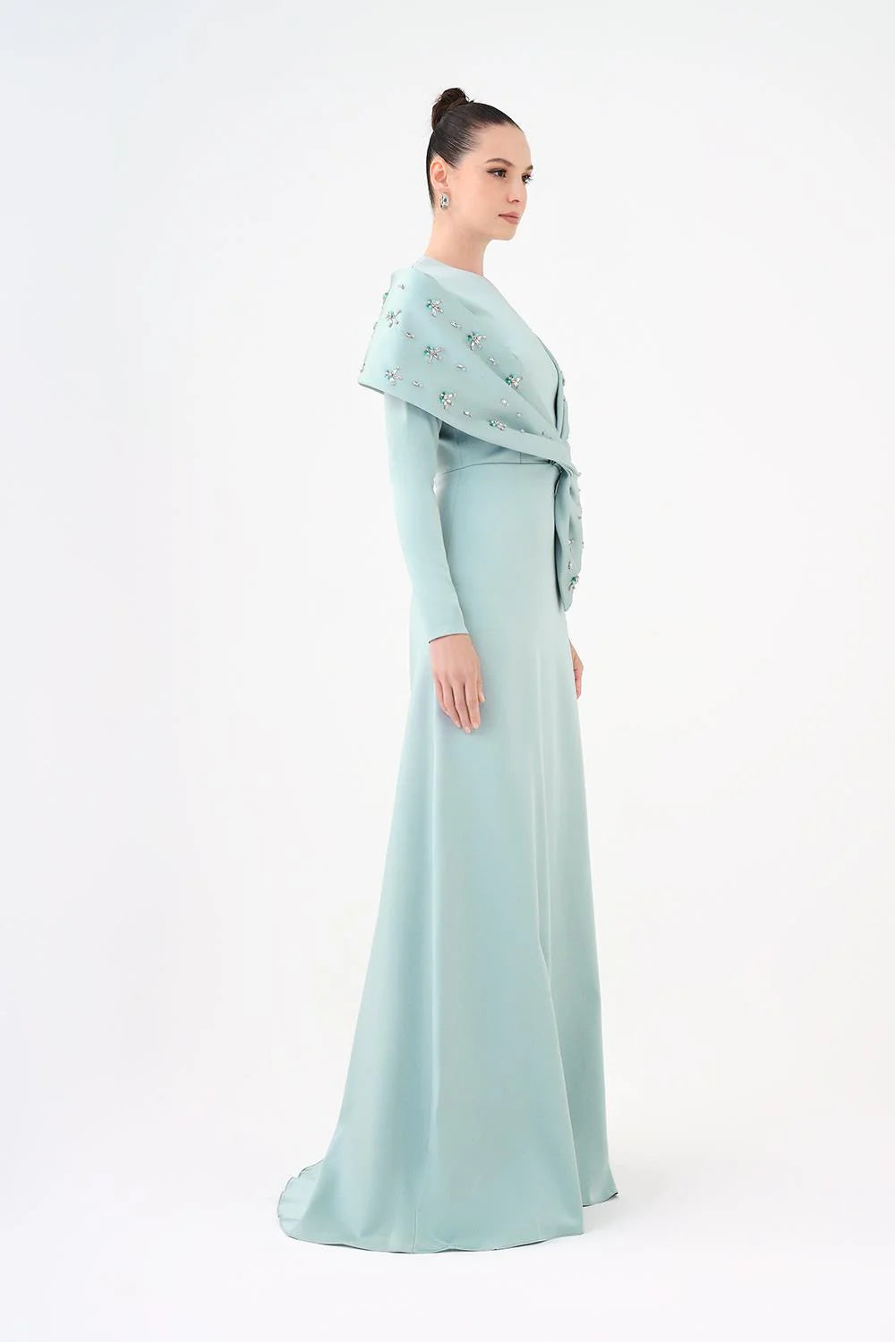 TAŞ İŞLEMELİ ŞALLI SATEN UZUN ABİYE ELBİSE - 9093C