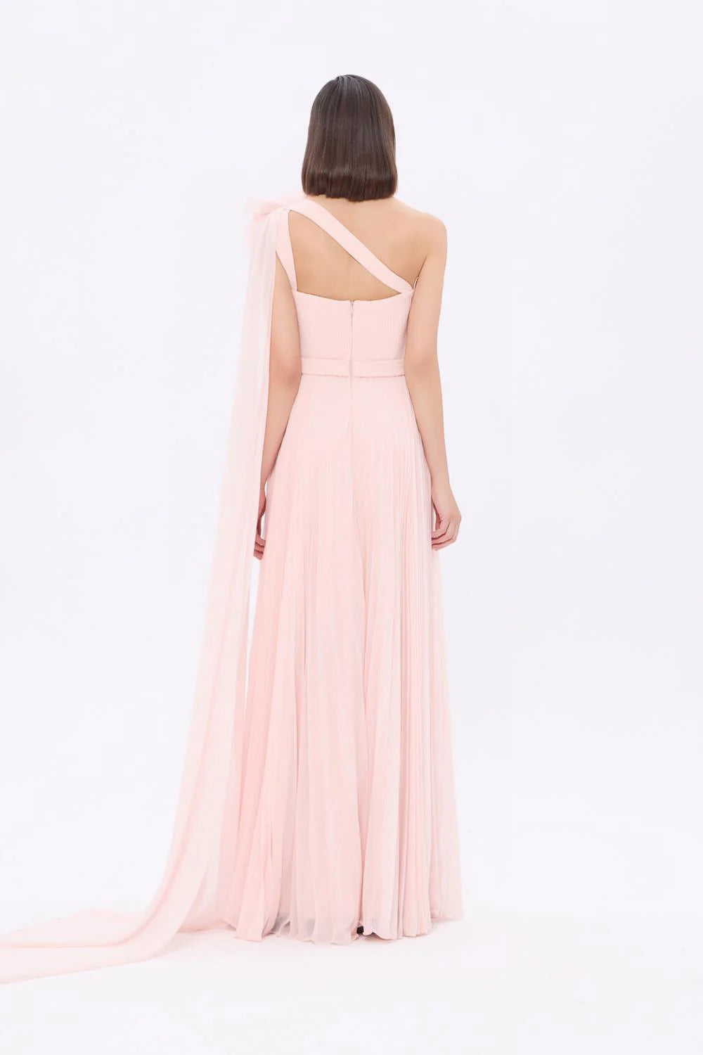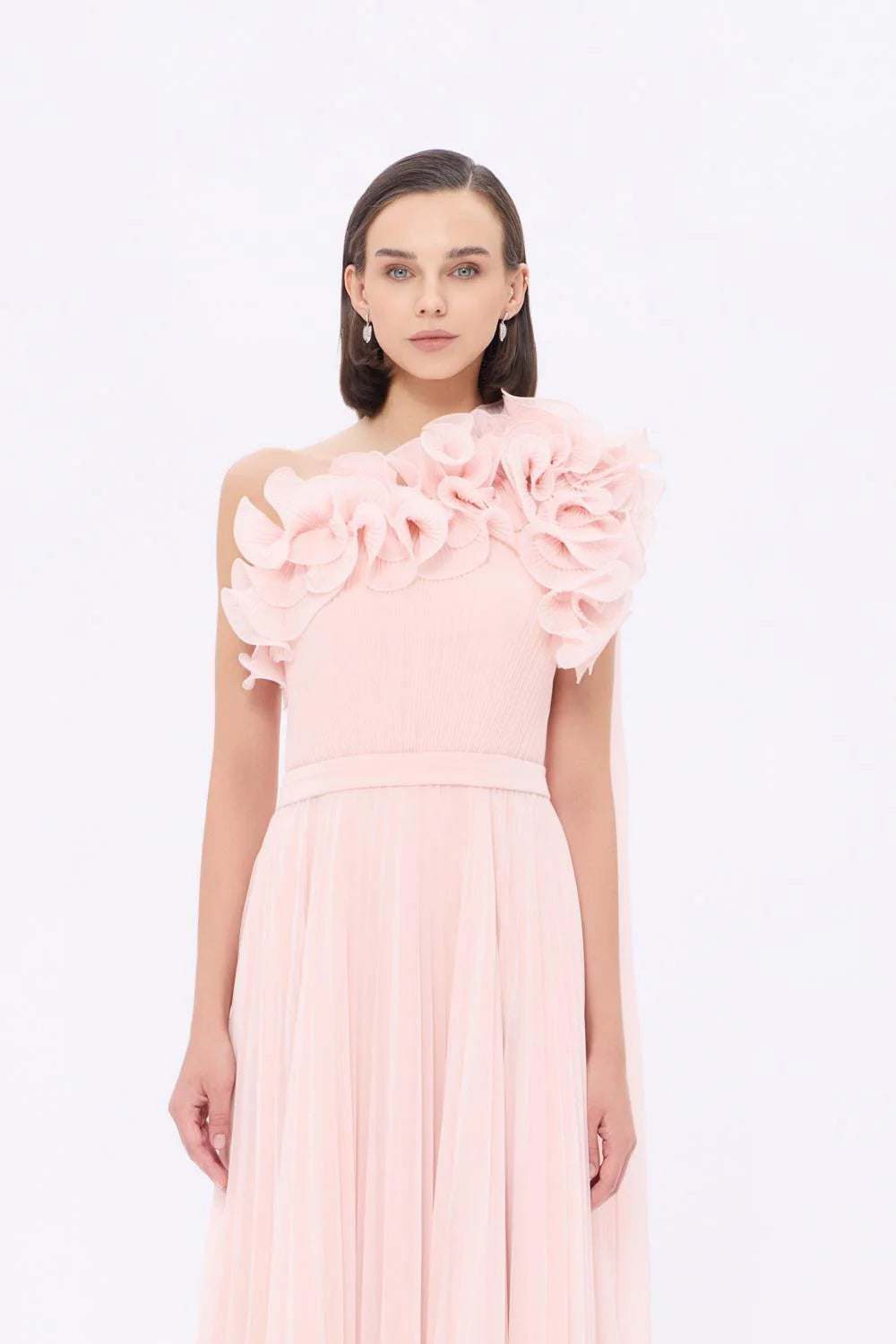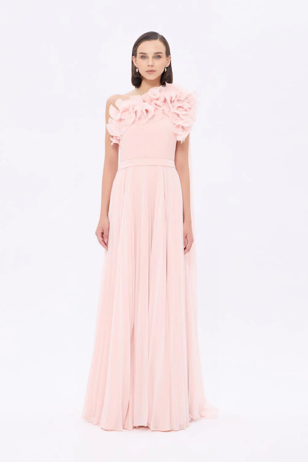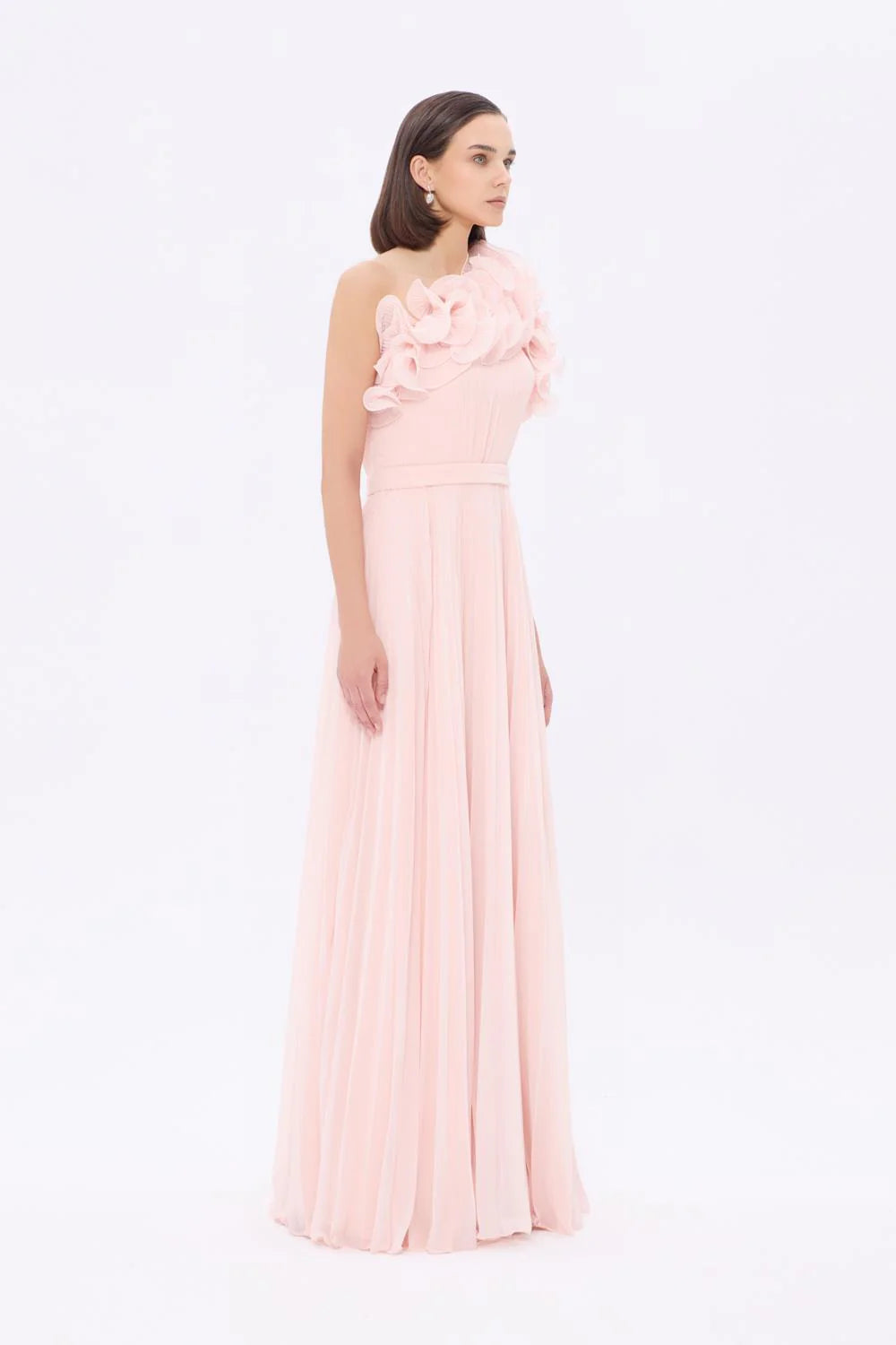 TEK OMUZ ÇİÇEK DETAYLI UZUN ABİYE ELBİSE - AP0020