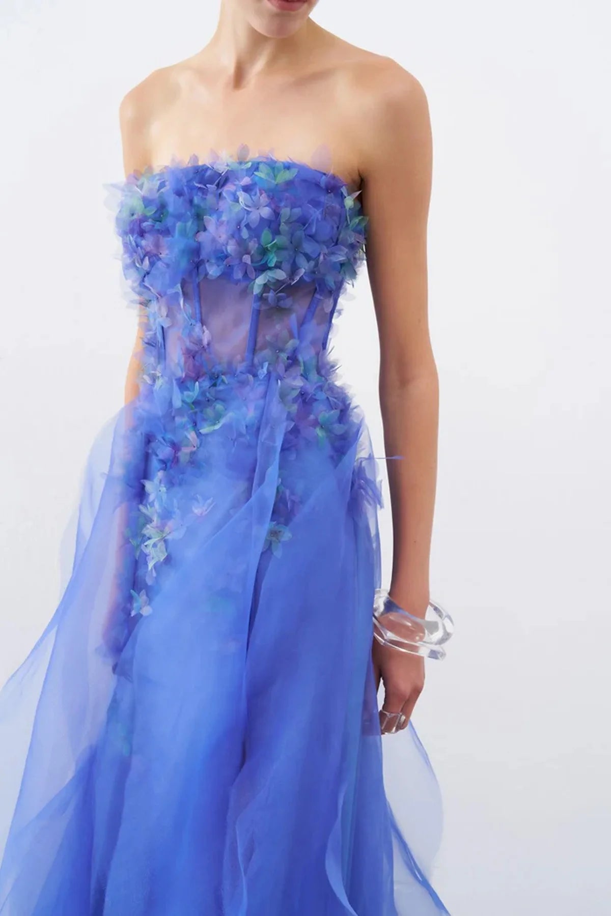 ÜÇ BOYUTLU ÇİÇEKLİ STRAPLEZ UZUN ABİYE ELBİSE